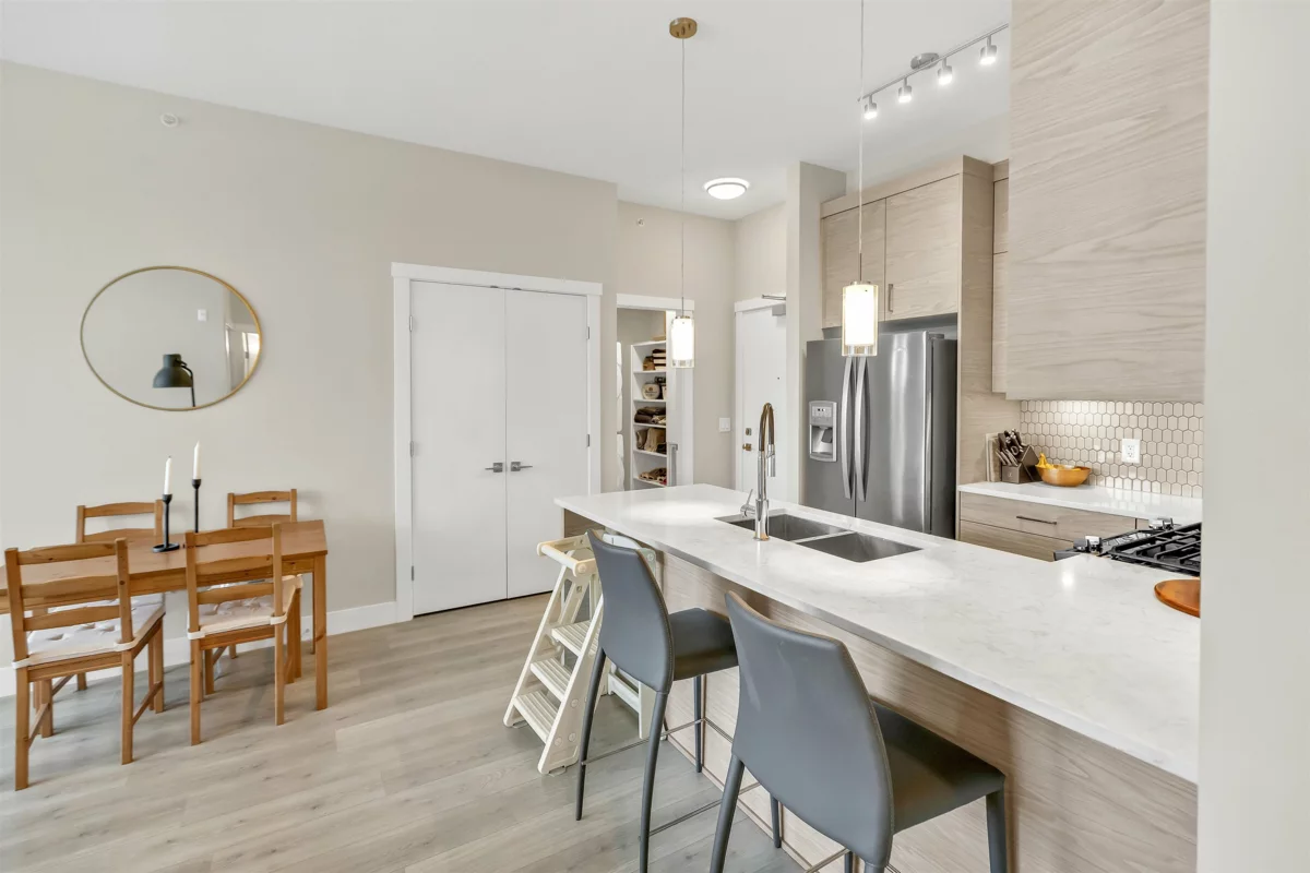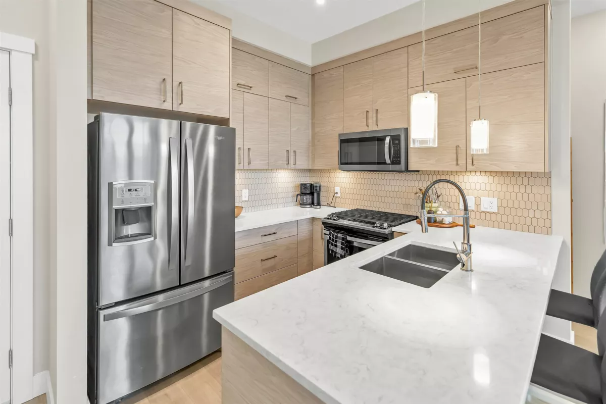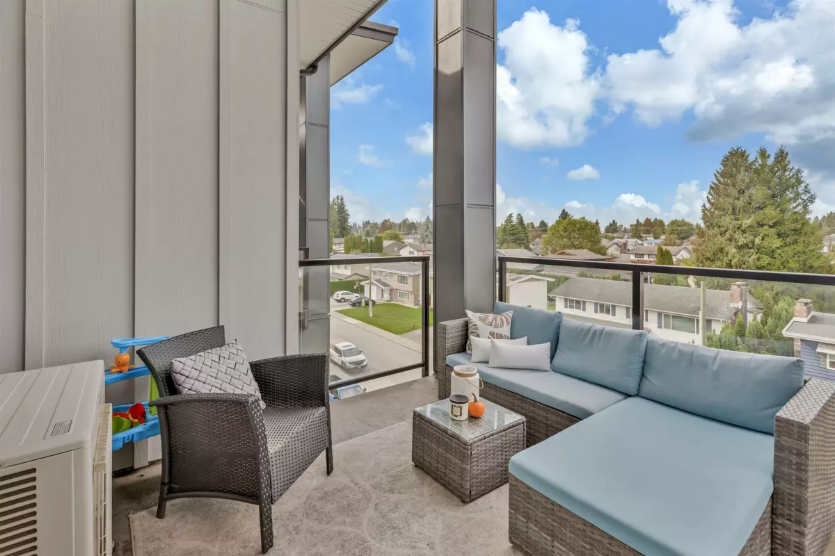 Welcome to the Onyx — a centrally located Abbotsford condo community offering exceptional convenience and comfortable contemporary living. This top-floor 2-bedroom plus den, 2-bath residence gives you both privacy and light, with the added advantage of being on the building’s 4th (top) level for quieter living and great sightlines. Step inside to an inviting layout designed for everyday life and entertaining. The flexible den is perfect as a dedicated home office, study, or small guest room. Two full bathrooms mean mornings are simpler for everyone. The bedrooms are well-proportioned and separated from the living area for added privacy. Gas range, and stainless steel appliances bring this kitchen to life, and bring your morning coffee out on the patio to enjoy the beautiful views.