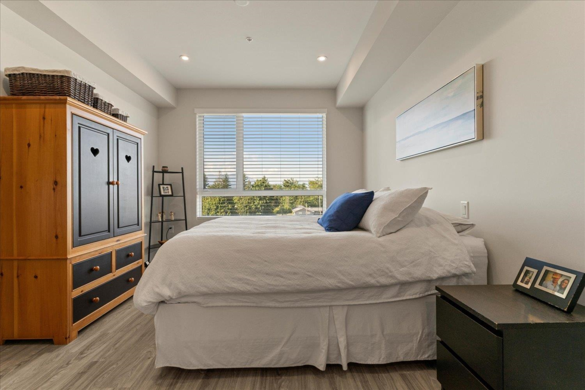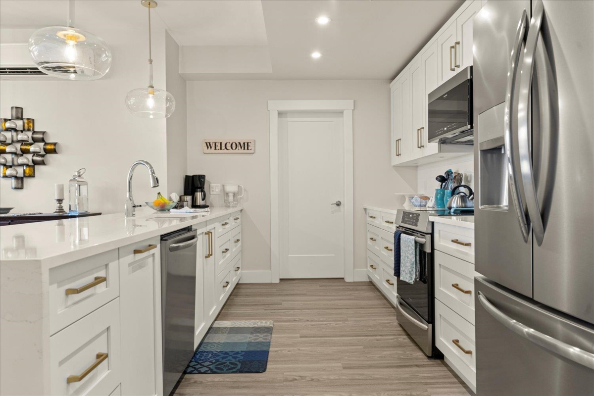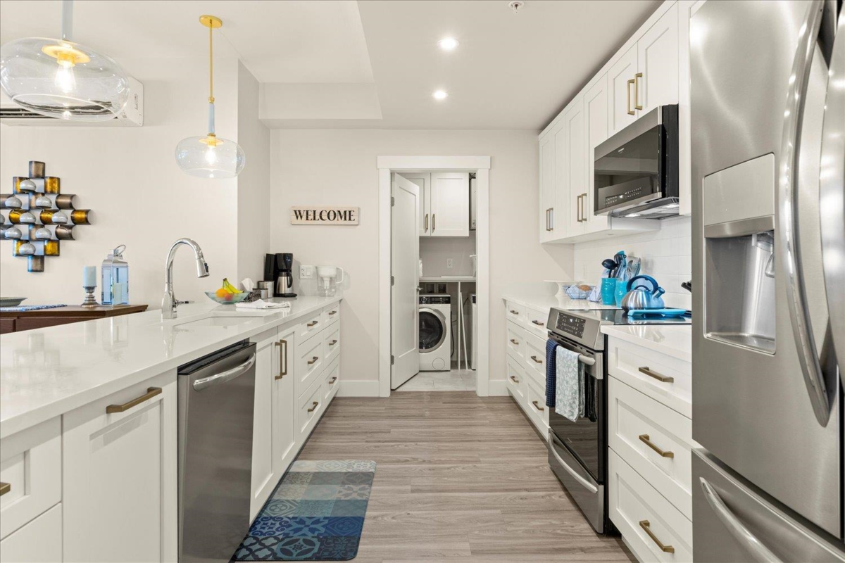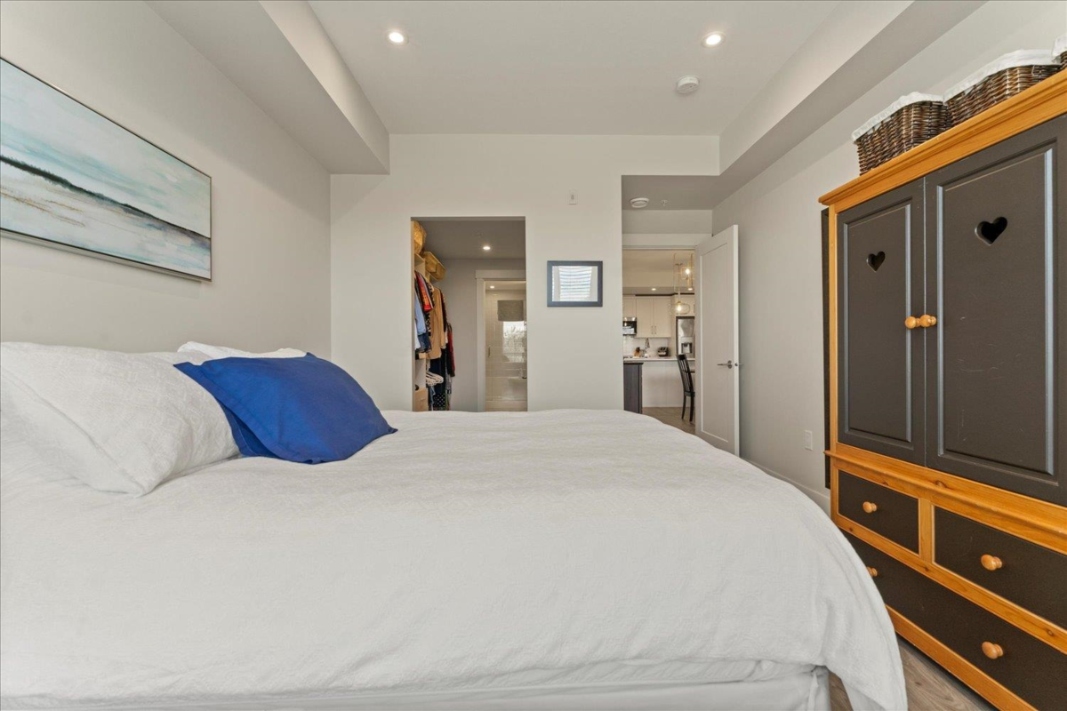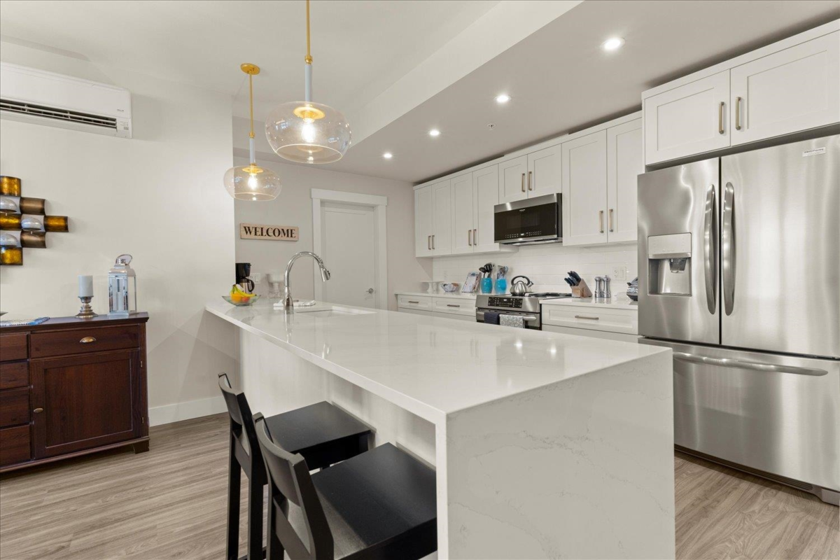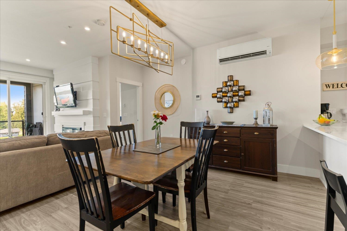 Sophisticated two bed, two bath + den Condo w/ bright open floor plan, lovely deck with unobstructed mountain views. One of the few units that offer 2 SECURE UNDERGROUND PARKING STALLS & 2 STORAGE LOCKERS. Adult luxury living, age 45+, built with the retiree lifestyle in mind offering a luxurious contemporary design and modern amenities for an upscale living experience. This inside unit comes fully upgraded with wide plank vinyl flooring, Silestone quartz counter tops, quality white cabinetry, full upgraded appliance package, A/C, electric fireplace. Clubhouse with roof top patio, outdoor kitchen, fire tables, 2 guest suites and walking distance to grocery shopping, banks, and more!.
