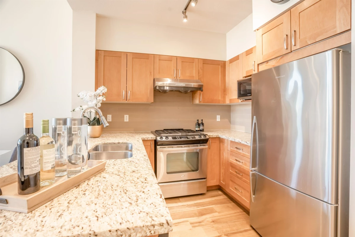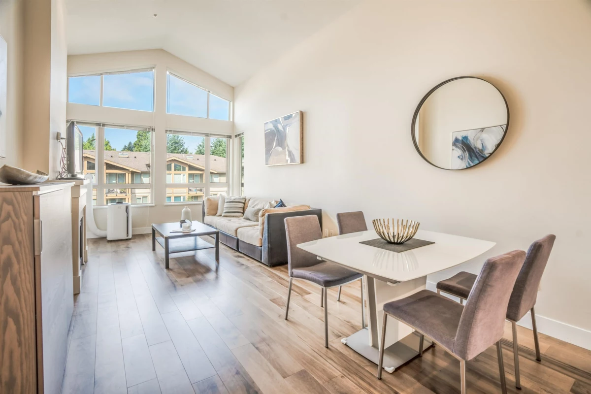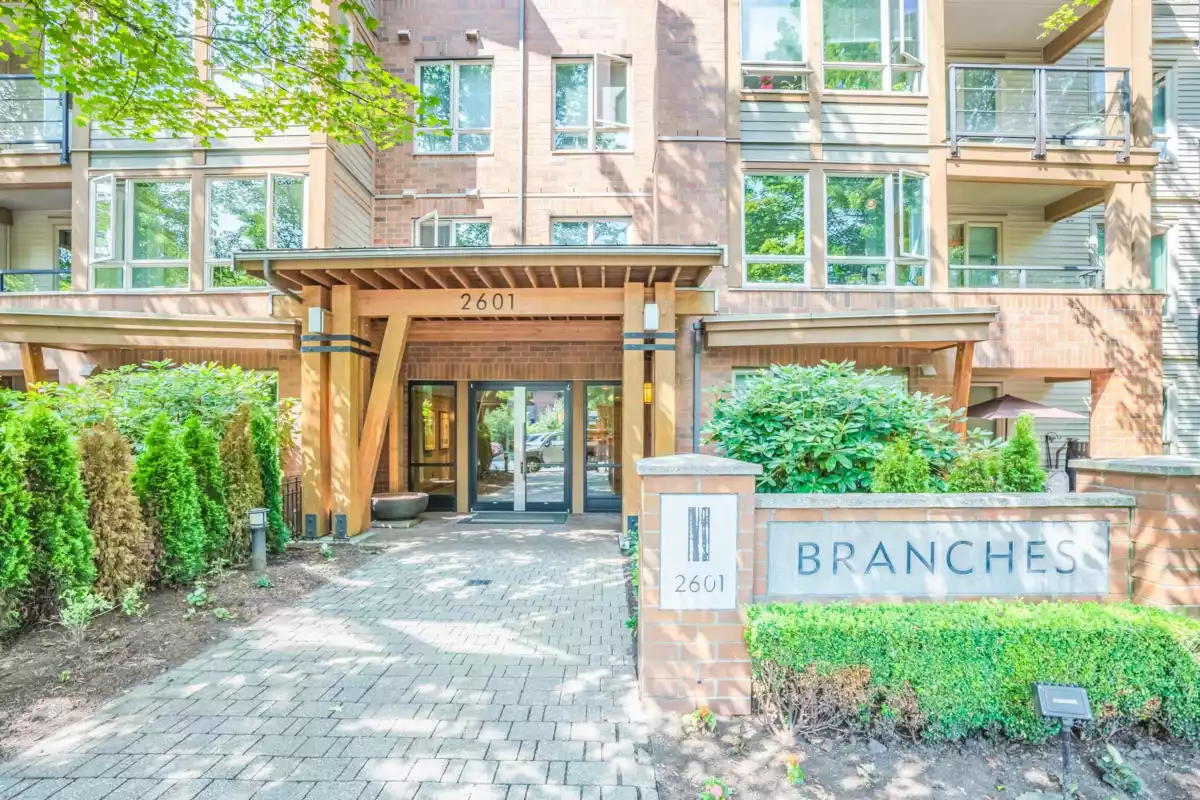Welcome to Branches! Gorgeous Penthouse suite in the sought after Branches building. This gorgeous top-floor offers 901 sqft and showcases 14’ vaulted ceilings for an airy, bright & spacious feel, overlooking the well-manicured courtyard lawn w/ the mountain backdrop perfecting this view. Beautiful kitchen with granite countertops & stainless steel appliances. The primary bedroom includes a sizeable 5-piece ensuite with twin sinks, and a walk-in closet. Residents of Branches enjoy exclusive access to a gym, amenities room & rentable guest suites. Steps away from Lynn Valley centre which offers groceries, stores, banks, Winners, restaurants & much more.