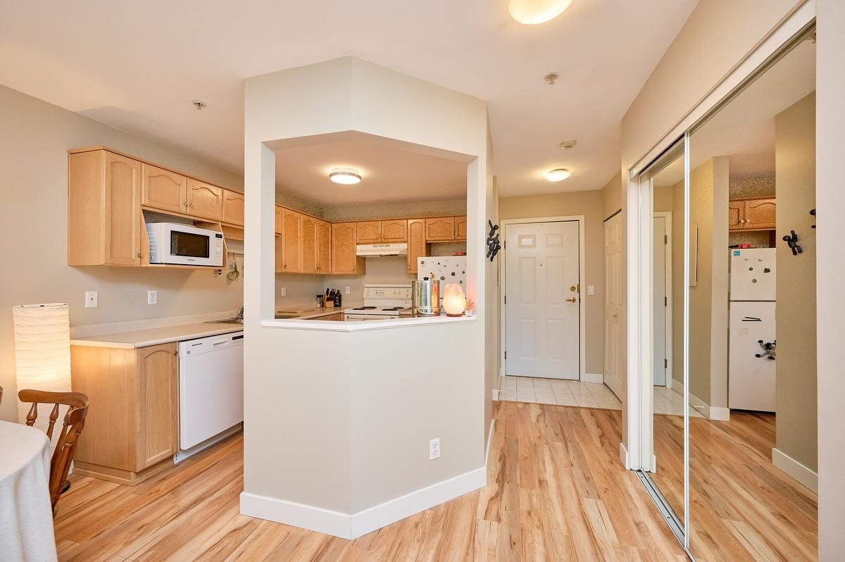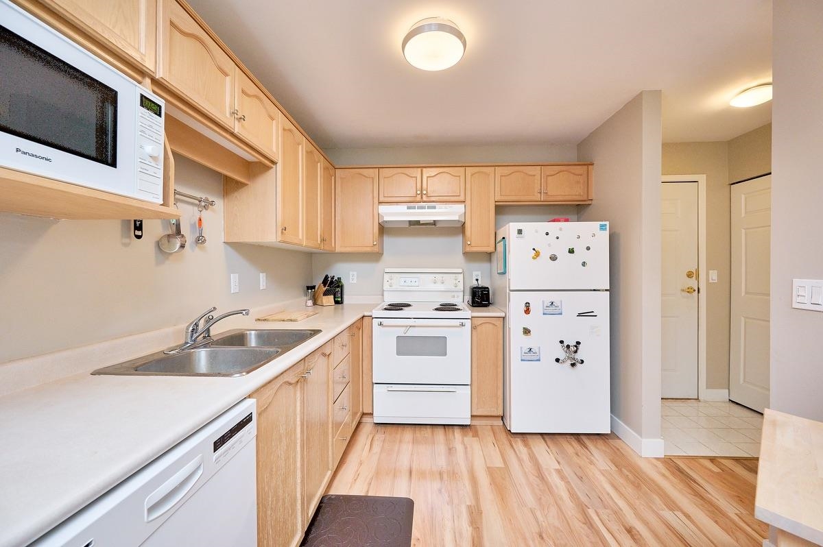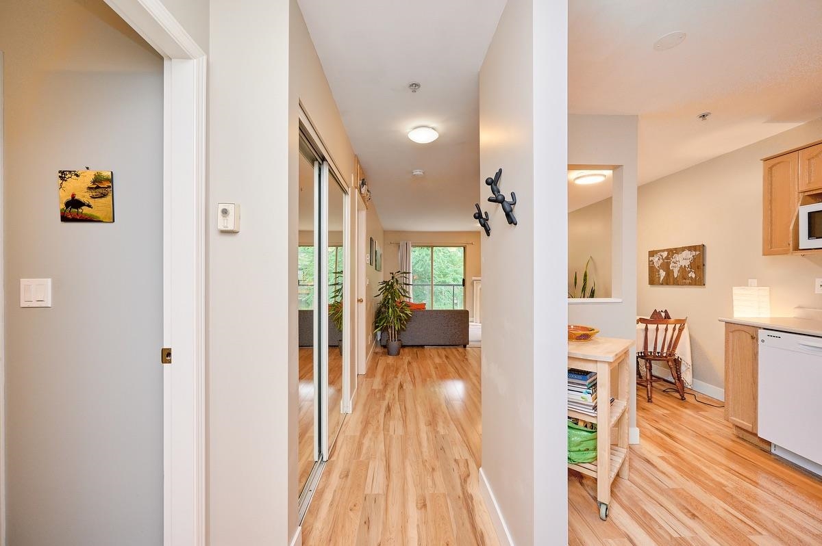 Well priced Top-Floor Gem! Sunlit South-Facing 1-Bdrm Home! This bright & inviting home is located in a fully rain screened bldg for peace of mind. The open-concept layout features a spacious kitchen with ample cupboard & counter space, a cozy dining nook, & a large pass-through to the dining area. The living room incl. a charming corner gas f/p & sliding doors leading to a private balcony with serene, tree-lined views. The oversized bdrm offers a walk-in closet & convenient cheater en-suite access. Unbeatable Location: Just steps to the shops, restaurants, & services of downtown PoCo. The bldg backs onto the scenic Coquitlam River & trails, with all levels of schools nearby & a short walk to the West Coast Express. Addt'l amenities incl. bike storage & rec room! By Appt Only