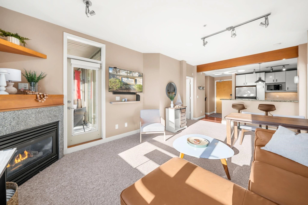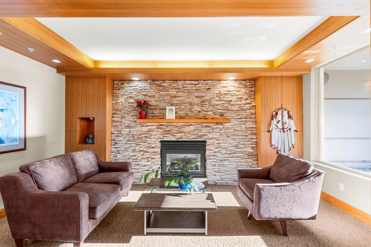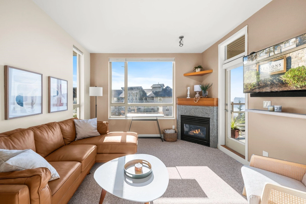 Experience elevated living at Seasons, a rare sub-penthouse corner suite with 2 bedrooms and 2 bathrooms, soaring 9-foot ceilings, and spectacular south-facing water and fountain views. The gourmet kitchen features stainless steel appliances, granite counters, and a sleek eating bar, while the inviting gas fireplace adds warmth. Enjoy in-suite laundry, 2 side-by-side parking stalls, and a storage locker. Exclusive amenities include a gym, party room, theatre room, and on-site resident manager. Just moments from Parkgate Shopping Centre, this home blends sophistication, comfort, and convenience.