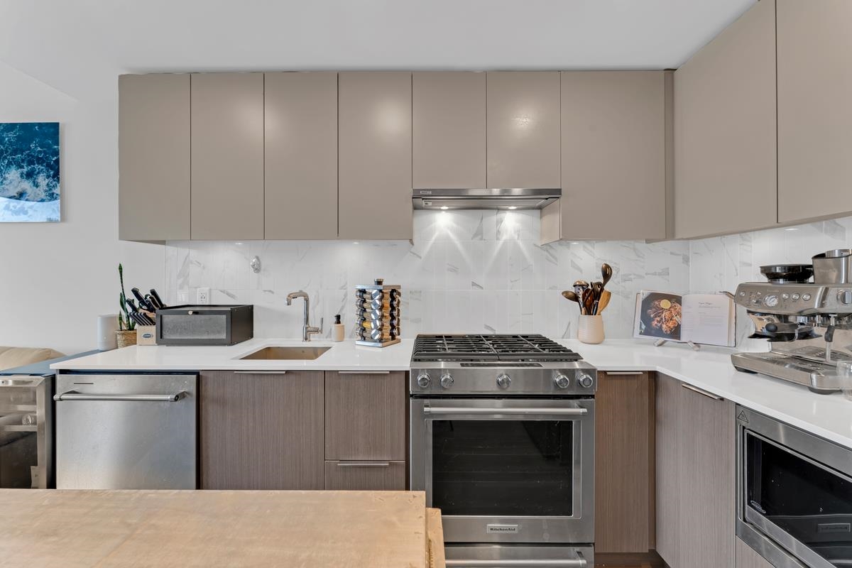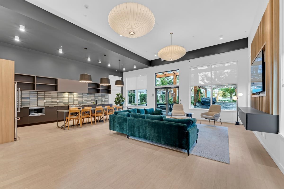 Welcome to Port & Mill by Streetside. This one bedroom + den offers north facing Burnaby mountain views with plenty of room in den for office, second bed, crib or storage. The large kitchen is completed with quartz counters, gas range and modern cabinets. Primary bedroom connects to the bathroom for convenience and ease. This is one of the most functional layouts the building offers. It is situated in the perfect location for all amenities including skytrain and groceries. This suite provides in suite laundry, one parking and one storage unit. The strata is complete with a gym, playground, outdoor BBQ and amenity room with full kitchen. Unit 409 is waiting for you to call it home - explore the possibilities with this wonderfully bright space!