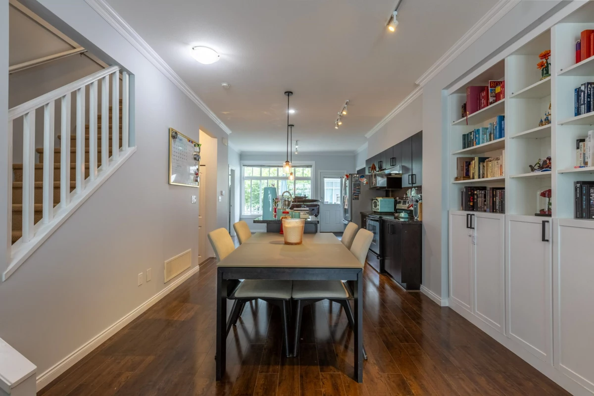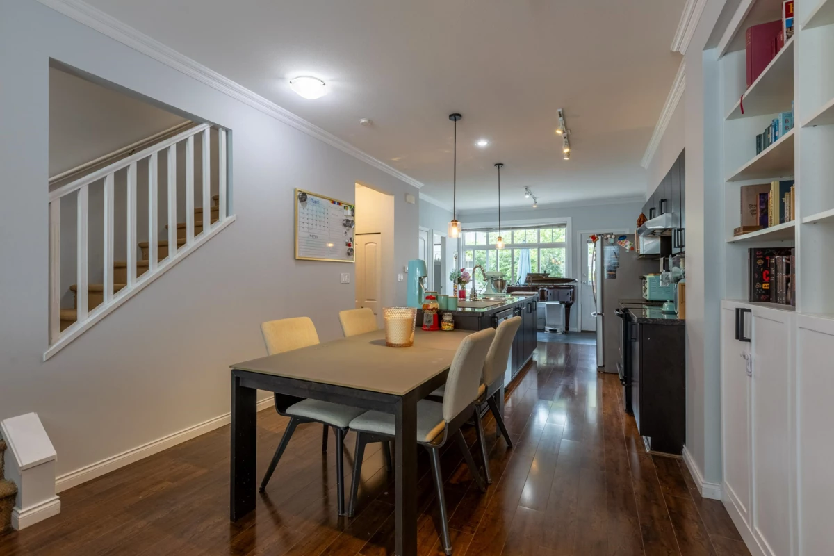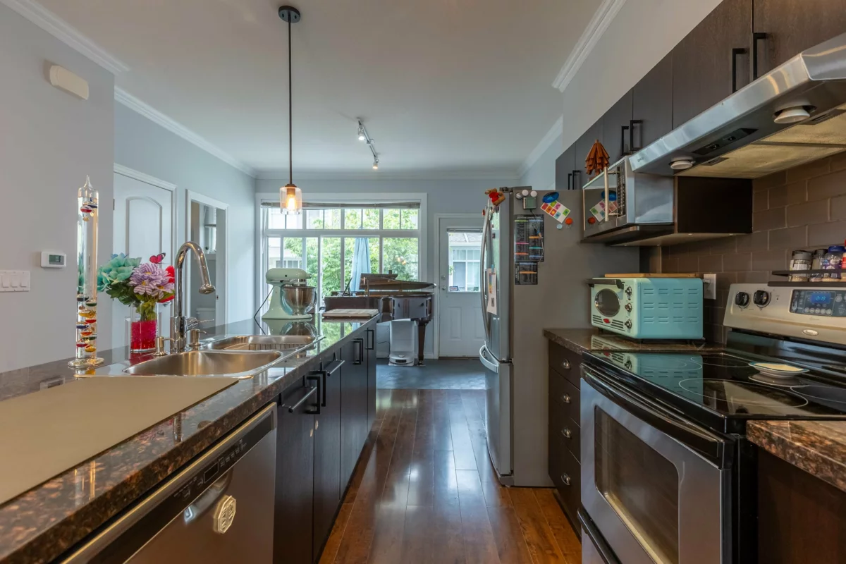 Very Affordable 3 bedroom, 2.5 baths in Two Blue II. Great Central location that is an easy walk to parks, schools and shopping. Watch the kids play in the family sized, fenced yard from the level main floor walk out. Large Granite Island is great place to gather, spread out or create a gourmet meal. Space is open to the living room, so you never lose touch with your company. Lots of custom built in cabinetry/shelving was a huge selling point for the Owner. Large tandem garage with separate work shop area. Two pets are allowed. Only blocks away to the new sky train station for an easy commute.