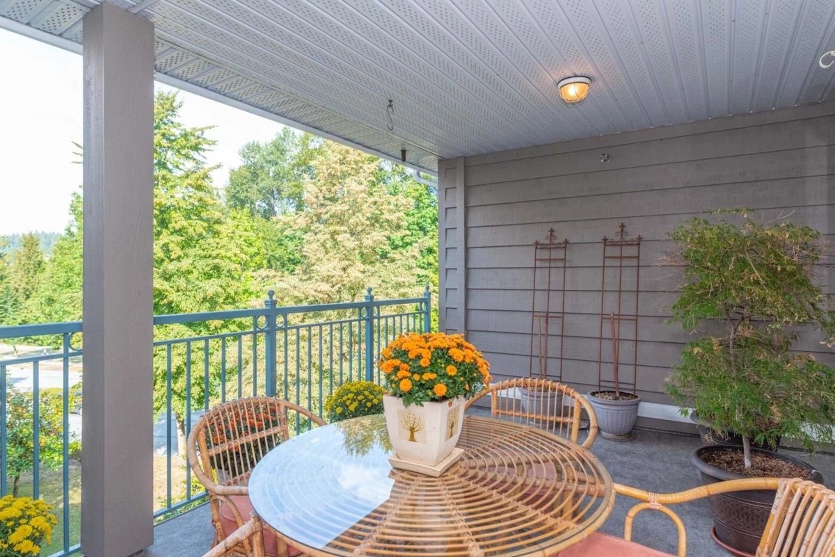 IMMACULATE 2 BED 2 BATH TOP FLOOR CONDO. Popular 'Lakeside Terrace' has a Whistler type vibe. Stunning ponds, fountains & walkways right beside Lafarge Lake. This large condo has many updates. Newer S/S appliances & washer/dryer, cabinets, beautiful hardwood flooring throughout, tile floors in kitchen & bath, granite counters. Breakfast bar. Master has a lg w/i closet, 4 pc ensuite w/ separate w/i shower. French doors from 2nd bed to main area & has a gas f/p. Nice large laundry/storage room. A huge covered deck to view all four seasons of Lafarge Lake. 1 parking & 1 locker. Amenities incl indoor pool, hot tub, steam room, great gym, bike room. Walk to skytrain, shopping, Douglas College, Coq Center, restaurants & more. 1 dog & 1 cat ok. THIS WON'T DISAPPOINT! OPEN HOUSE SUN SEP 17, 2-4