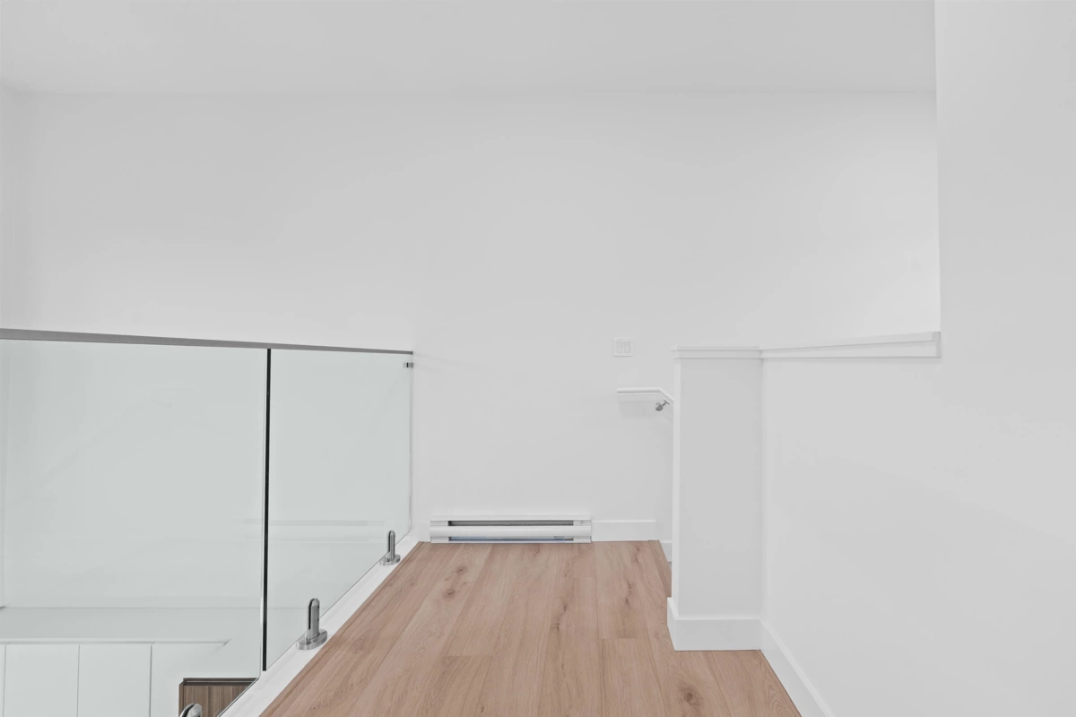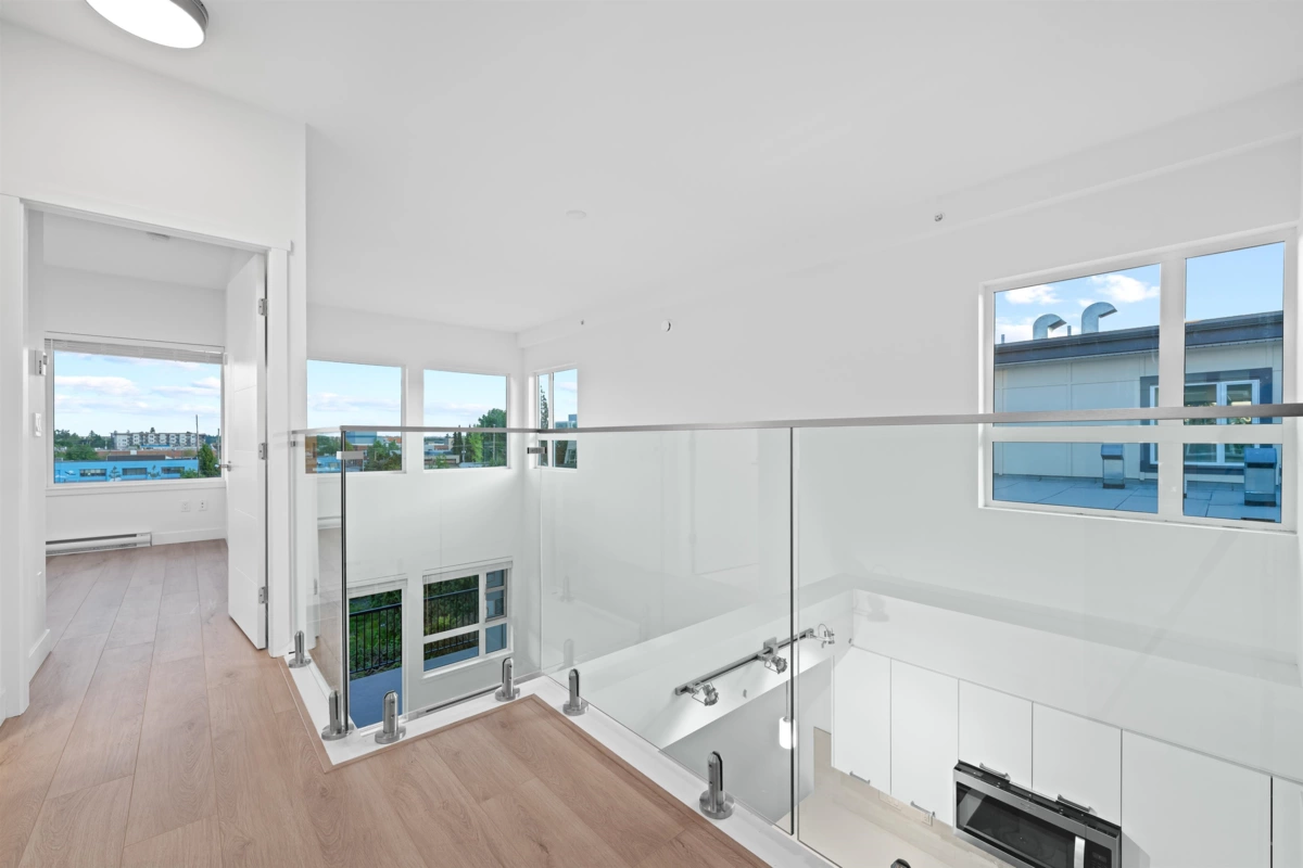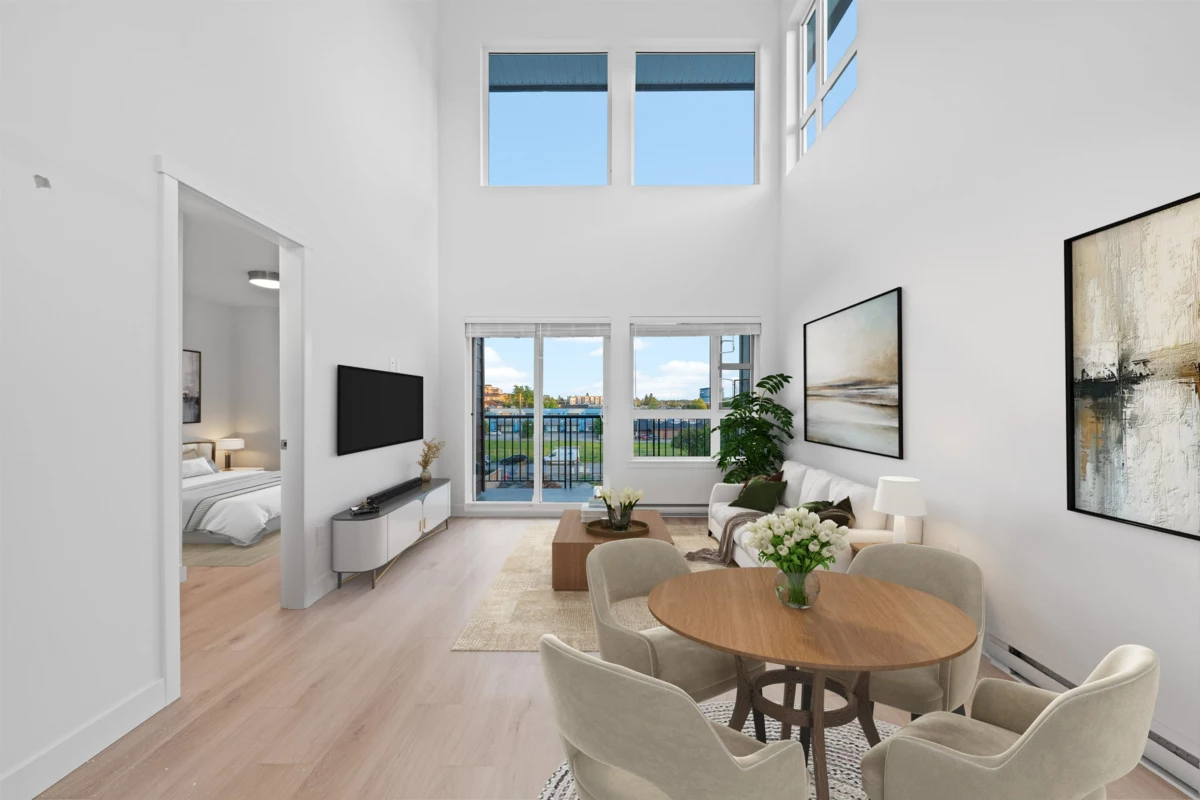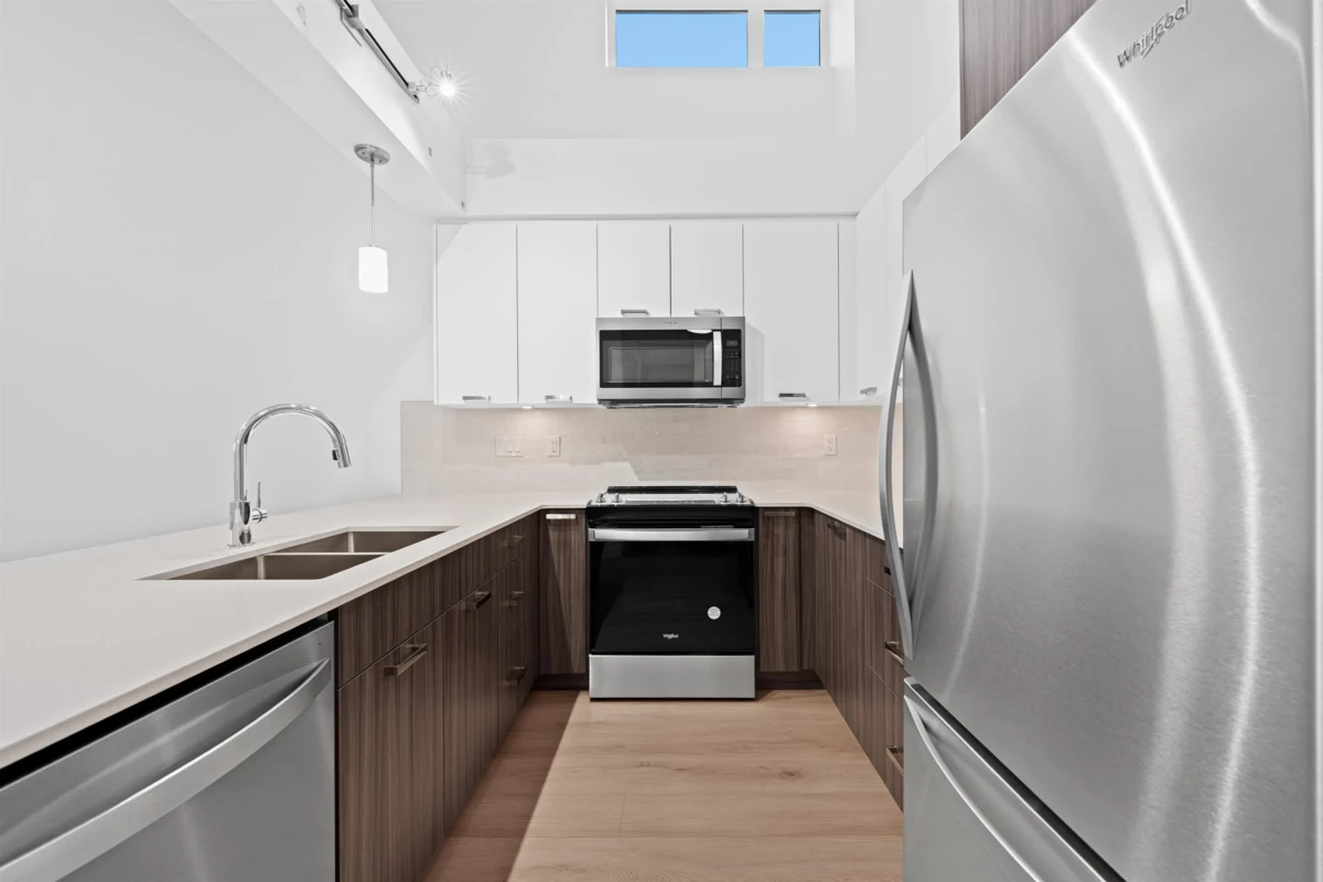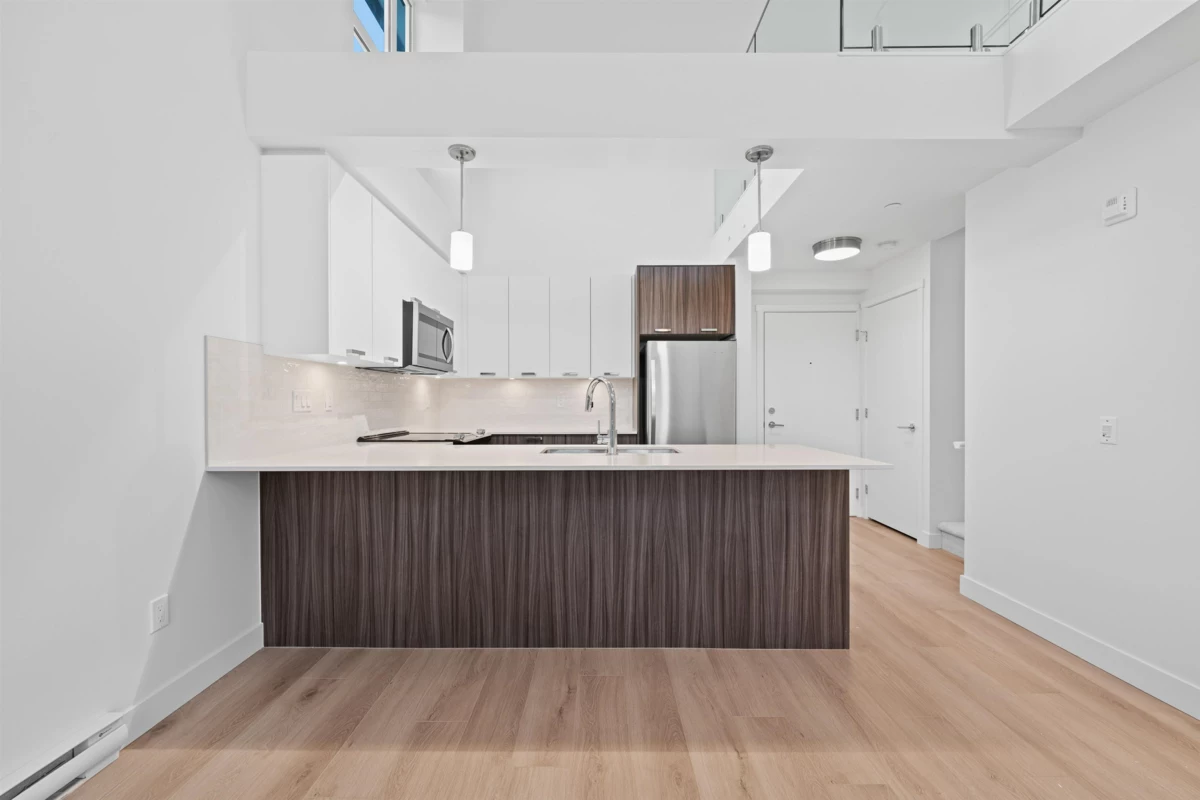 Elevated Loft Living — 2 Bedroom at Edge 2. Bright two-level loft-style penthouse in a substantially rebuilt building, located in the heart of Maple Ridge just steps to shops, dining, and transit. Unlike typical lofts, the upper-level bedroom is fully enclosed for true privacy, making this a functional 2-bedroom home. Soaring 18 ft ceilings and expansive windows flood the space with natural light. The modern kitchen features quartz countertops, soft-close cabinetry, and stainless steel appliances. The main level includes a spacious bedroom with walk-in closet and cheater en-suite. Laminate flooring throughout, custom shelving in upped bedroom closet. 1 parking and storage included. Pets and rentals welcome.