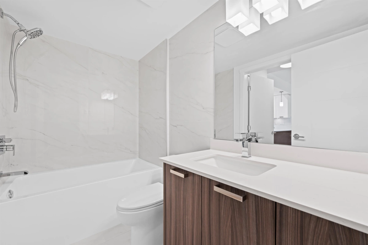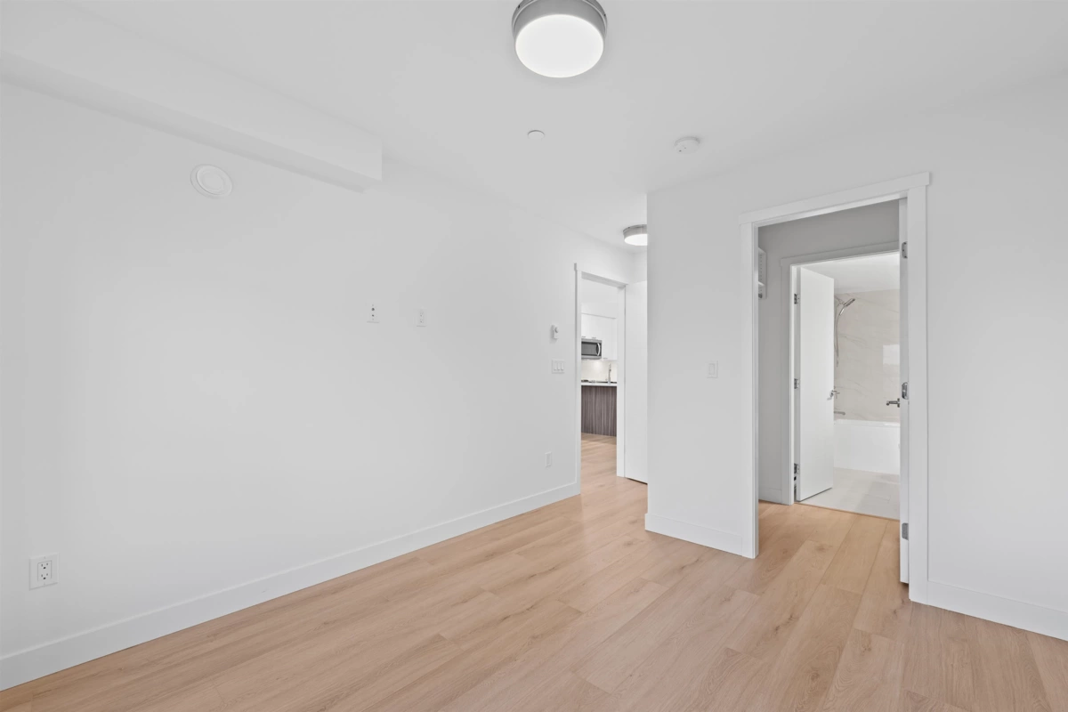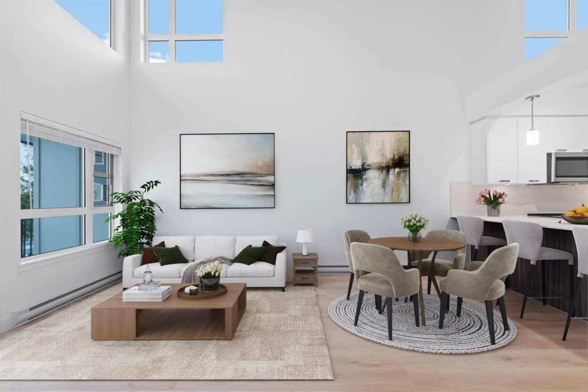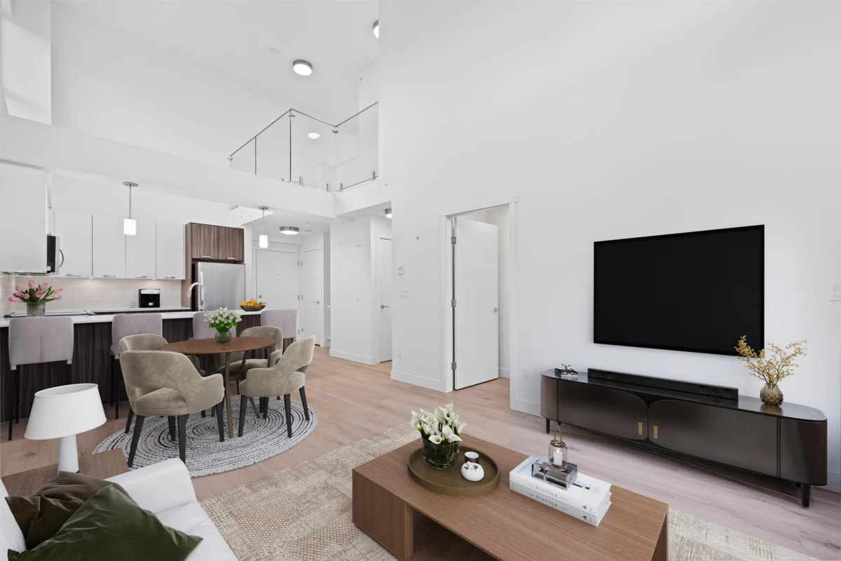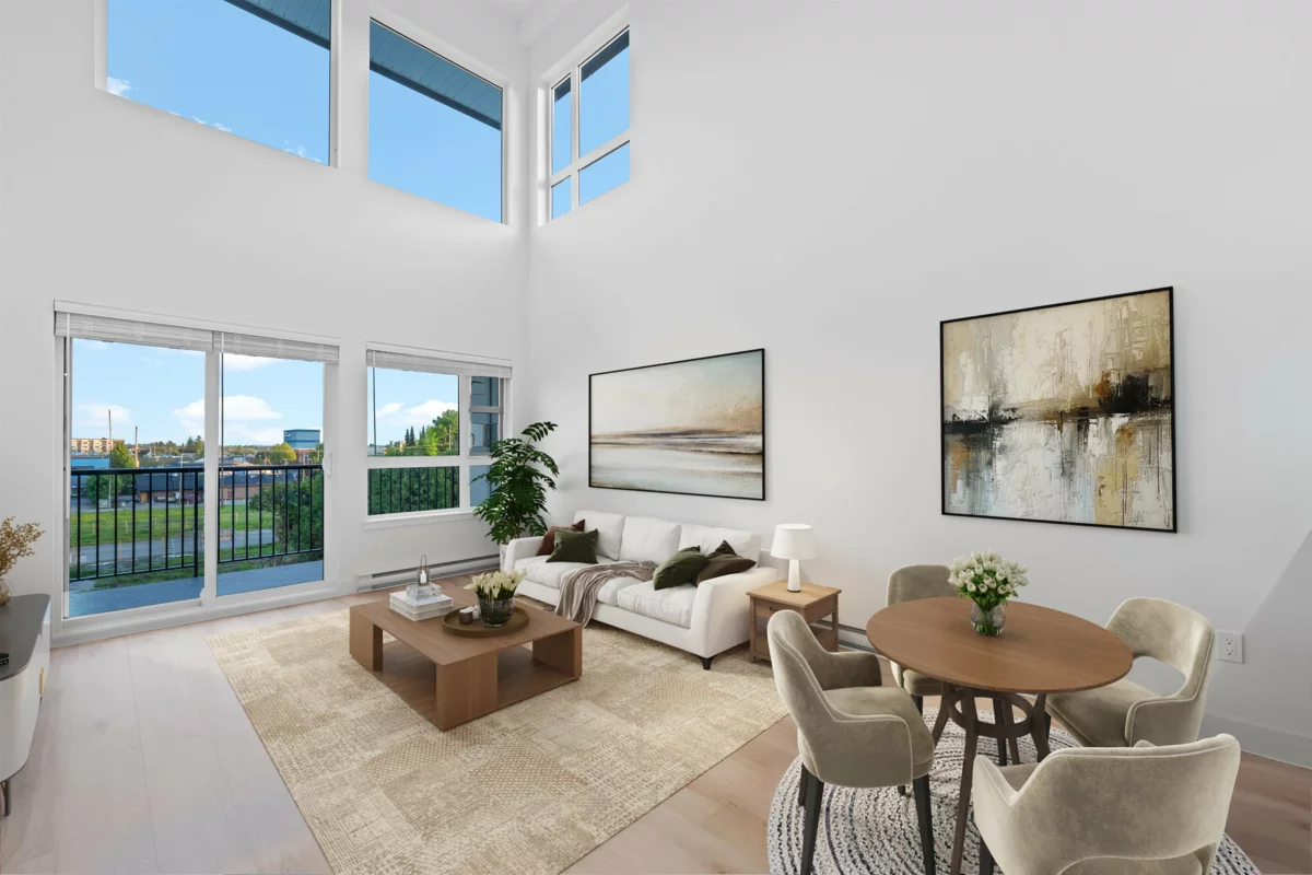 Elevated Loft Living — 2 Bedroom at Edge 2. Bright two-level loft-style penthouse in a substantially rebuilt building, located in the heart of Maple Ridge just steps to shops, dining, and transit. Unlike typical lofts, the upper-level bedroom is fully enclosed for true privacy, making this a functional 2-bedroom home. Soaring 18 ft ceilings and expansive windows flood the space with natural light. The modern kitchen features quartz countertops, soft-close cabinetry, and stainless steel appliances. The main level includes a spacious bedroom with walk-in closet and cheater en-suite. Laminate flooring throughout, custom shelving in upped bedroom closet. 1 parking and storage included. Pets and rentals welcome.