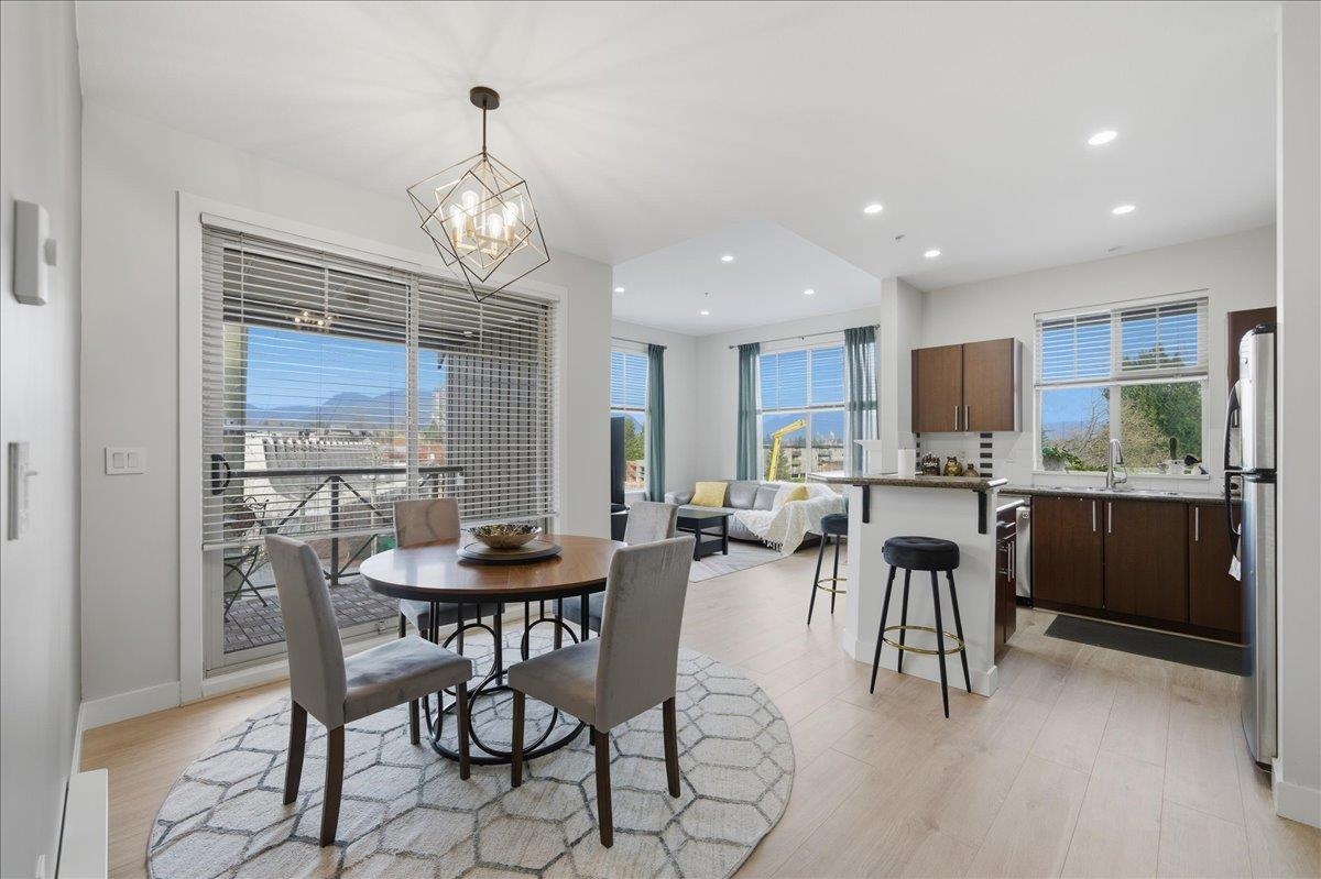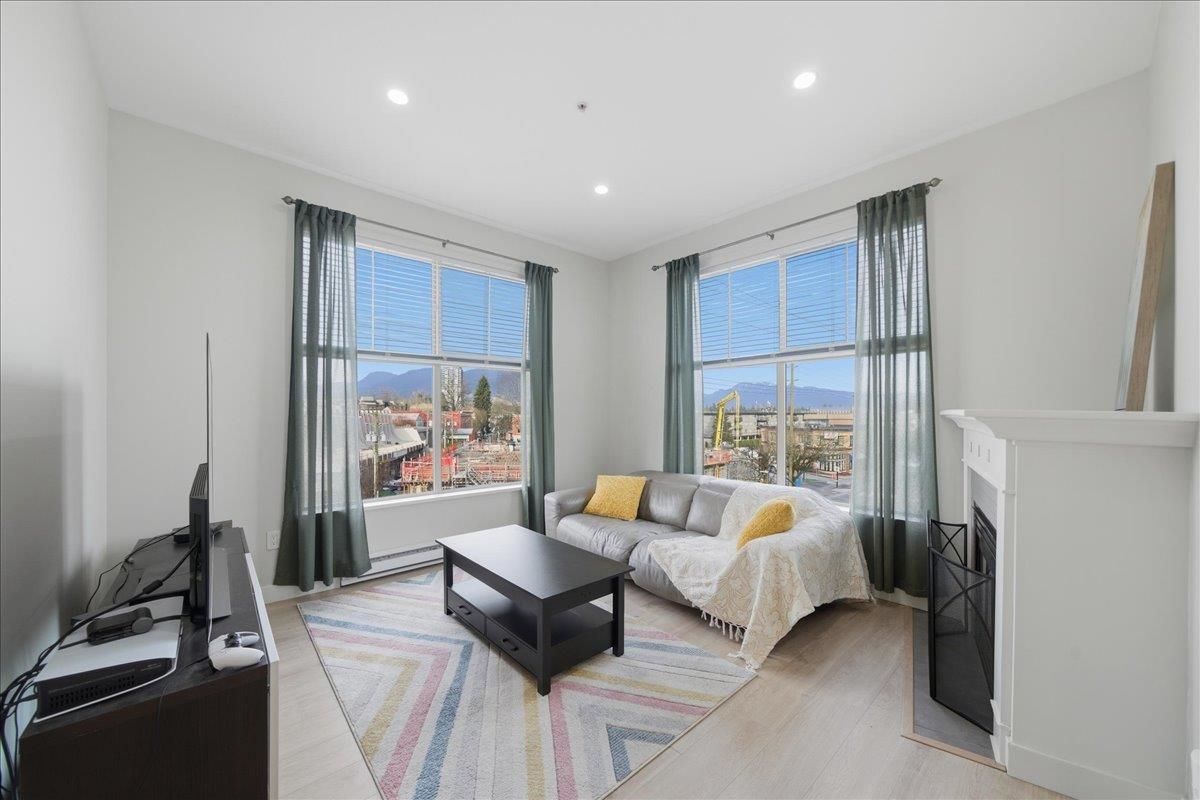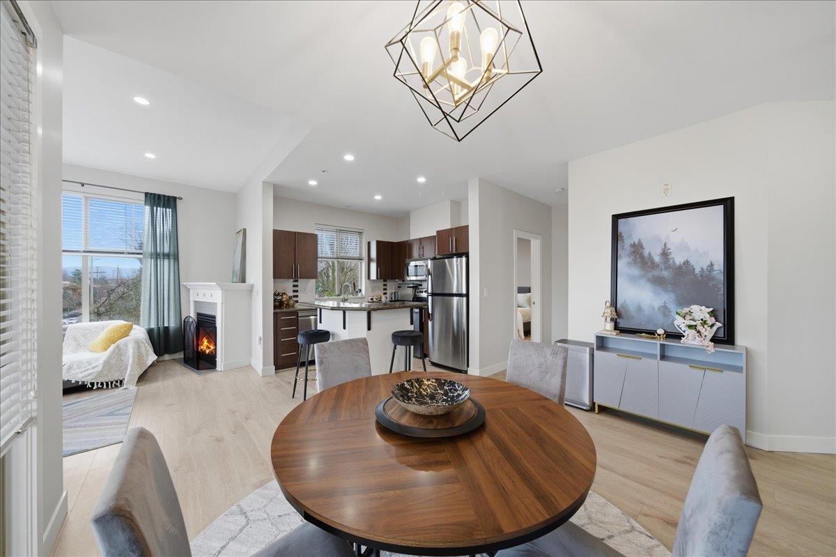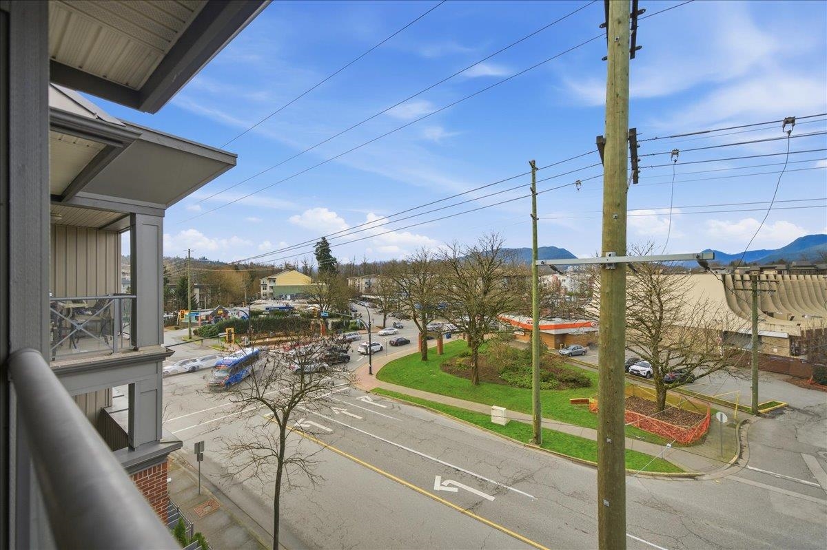 Vibrant community and perfectly located 1,041 SqFt home. 2 Bed 2 Bath Top Floor Corner on quiet side of building in downtown Port Coquitlam. Stunning with mountain views. Bright, open layout has vaulted ceilings in LivRm with gas fireplace, Separate Dining Space, NEW Laminate Flooring & fresh paint throughout. Kitchen has granite counters & S/S appliances. Primary Bedrm fits large furniture with double walk-through closets to private ensuite. Enjoy in-suite laundry/storage, & separate locker. Building is Pet Friendly with Amenities: gym, meeting room, & guest suite. Steps from the new PoCo Community Centre, Leigh Square, cafes & restaurants. Walk to Gates Park, the Traboulay Trail, & off-leash dog park. Prime location for commuters, easy access to West Coast Express & bus routes.