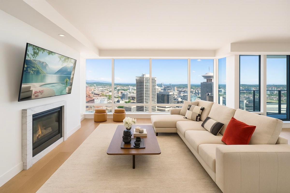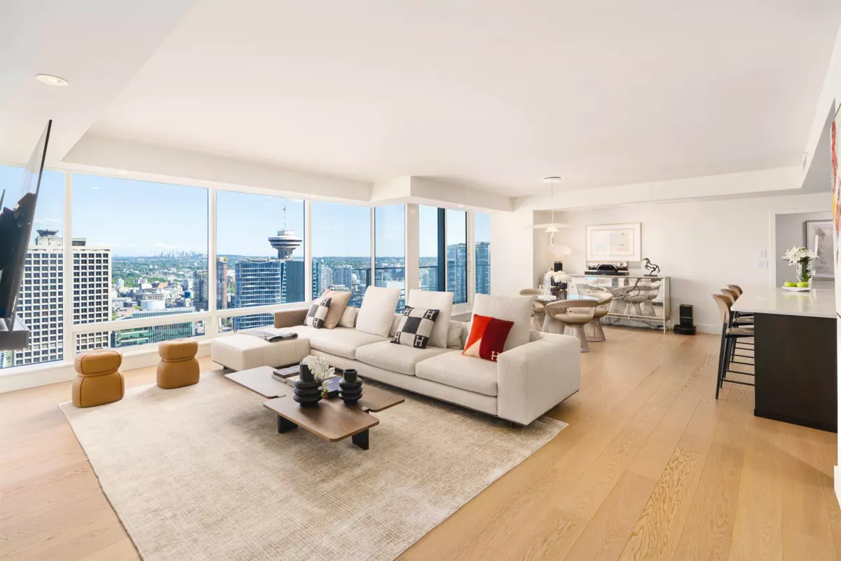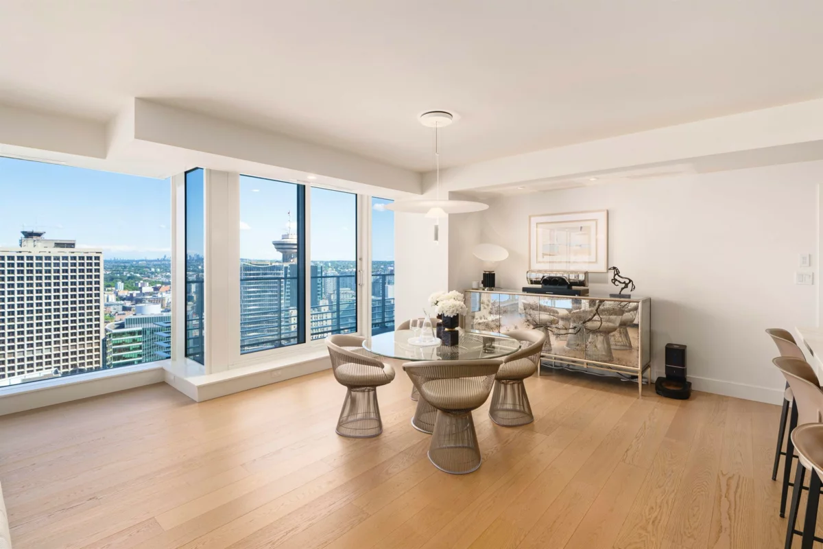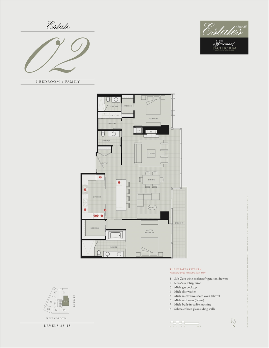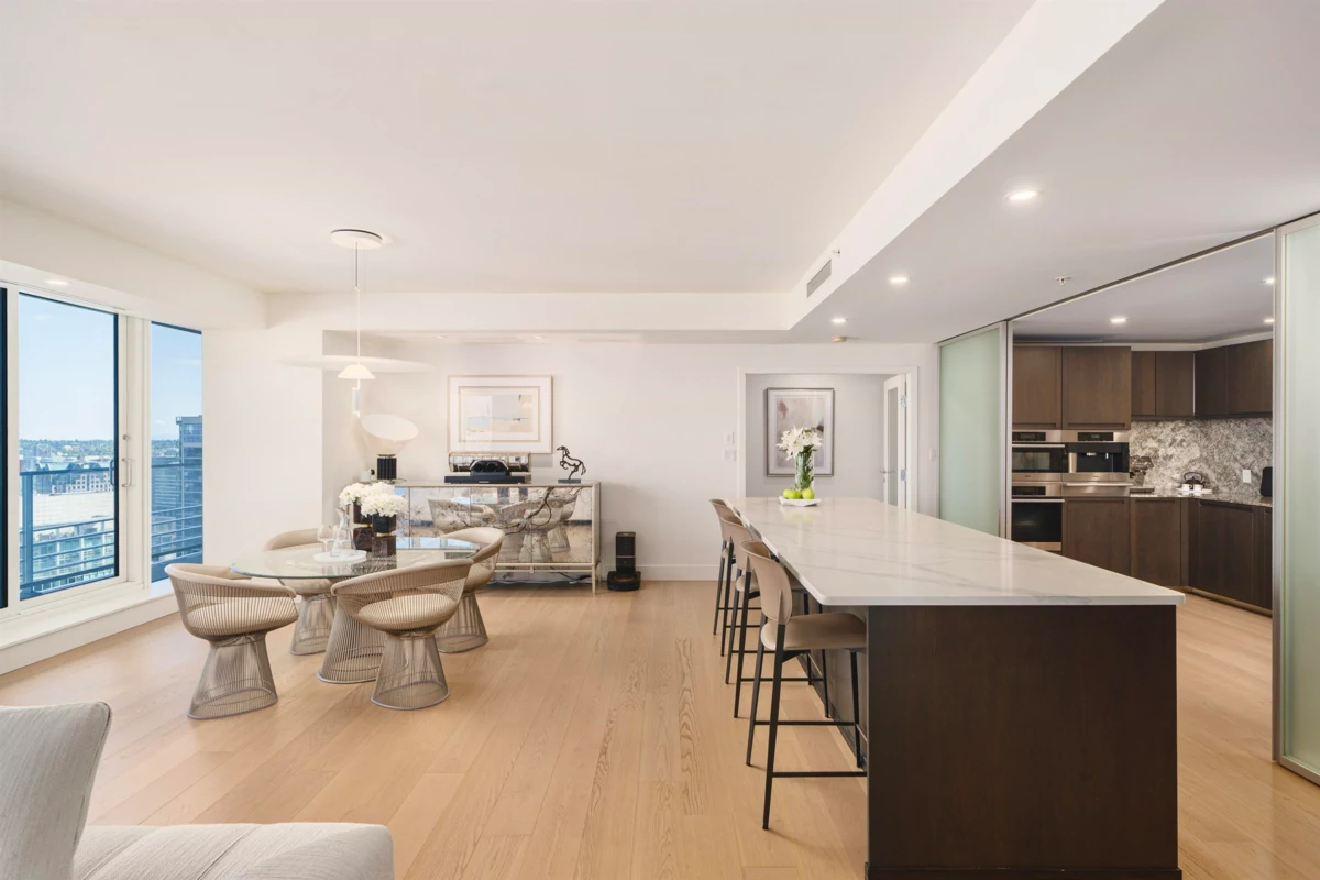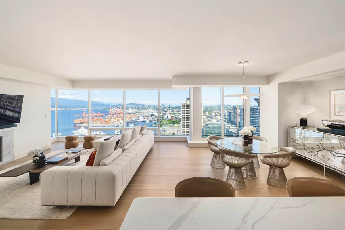 Rarely available, exquisite 02 home in the prestigious Fairmont Pacific Rim. Unobstructed, stunning views of ocean, harbour & northshore mountain from the 5th highest 02 plan. A remarkably expansive, light-filled living room that welcomes the morning sun and flows seamlessly into breathtaking panoramic views. Boasting luxury upgrades in 2020: solid hardwood floor, motorized blinds & blackout shades, marble countertop, the entire laundry room (Miele washer & dryer, countertop, cabinets, sink, faucet), Nest thermostats, all lighting fixtures, water filter, painting; dishwasher & hood fan upgraded in 2024. Boffi Italian kitchen, Miele & Sub-Zero appliances, spa ensuites. Meticulously maintained. Ready to move in. 2 parking.