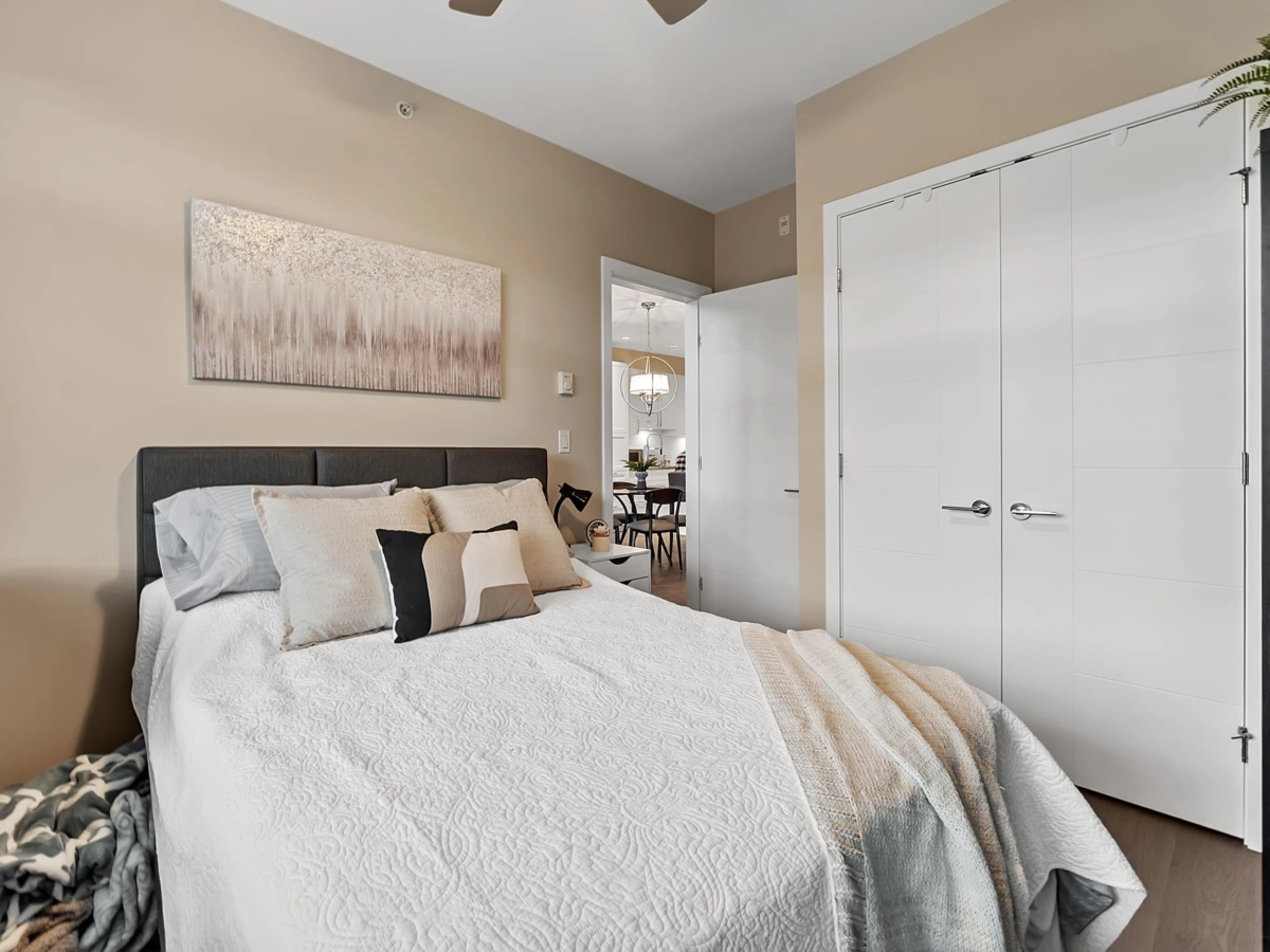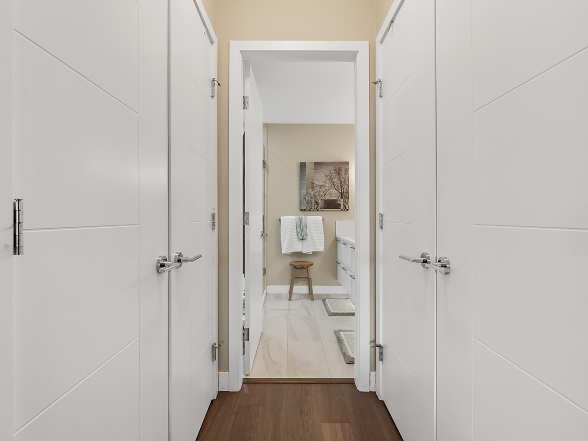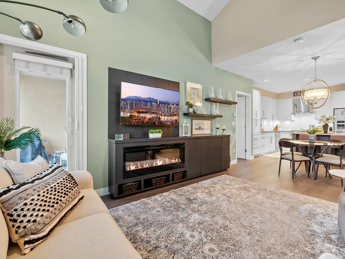 ADAGIO 1! Top-floor 2-bedroom + den residence offers refined living with open-concept layout and high-end finishes throughout. Custom features including a built-in desk, and fireplace with entertainment centre and shelving keeps the home uniform and clutter free. Enjoy lofty overheight ceilings in the living area, 9' ceilings throughout, and access to a spacious covered balcony overlooking the tranquil courtyard. The gourmet kitchen complete with stainless steel appliances, wine fridge, granite countertops, and sleek cabinetry. Exceptional amenities include a fitness centre, steam room, and a stylish clubhouse with fireplace and pool table. Ideally located steps to parks, shopping, and transit, this move-in-ready home delivers effortless luxury and lifestyle.