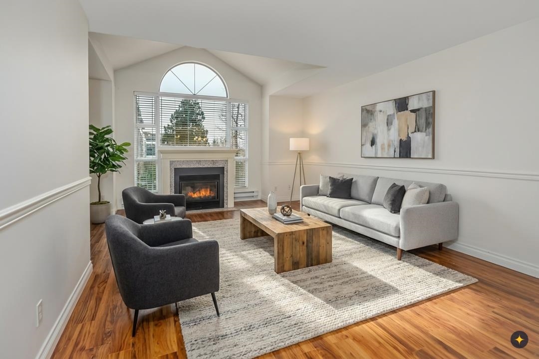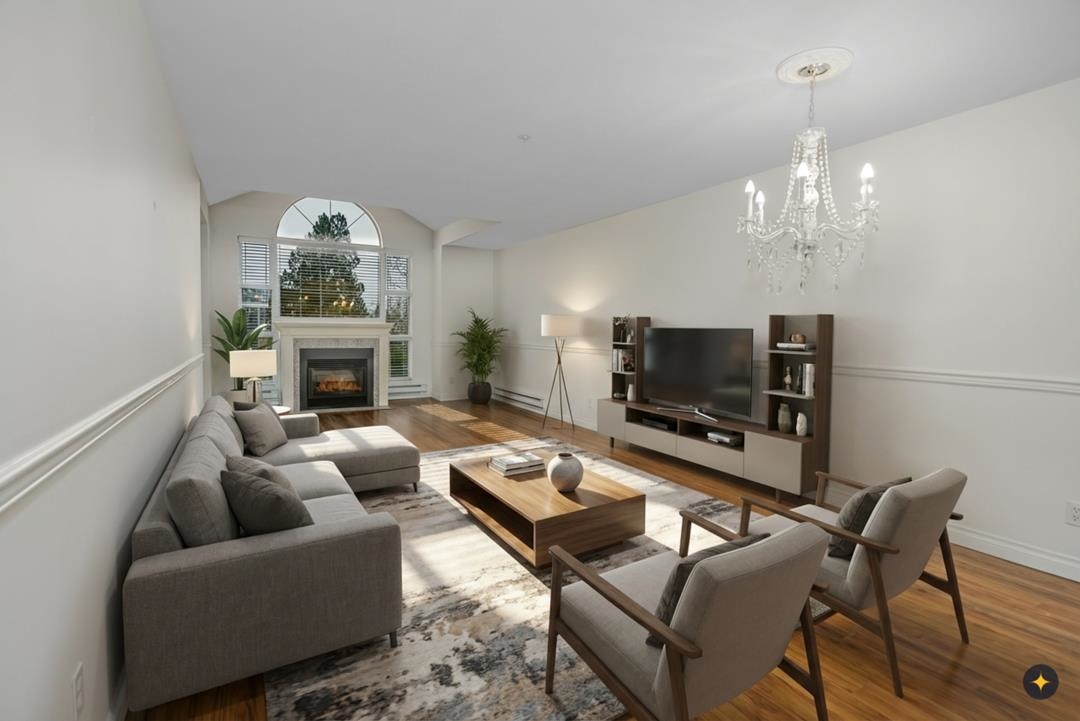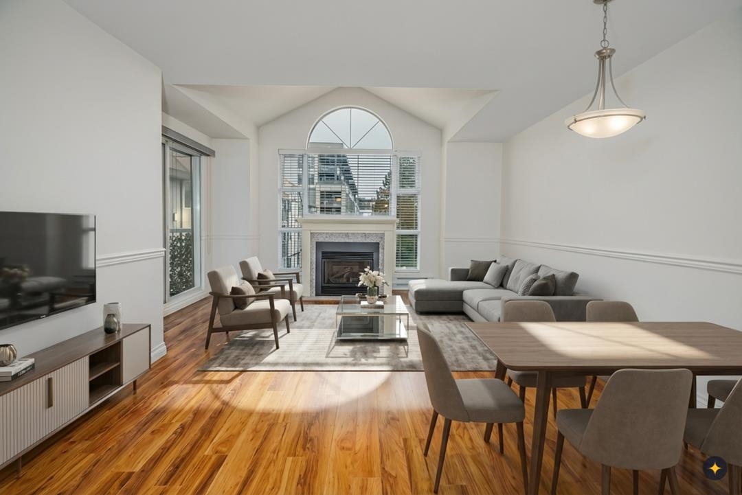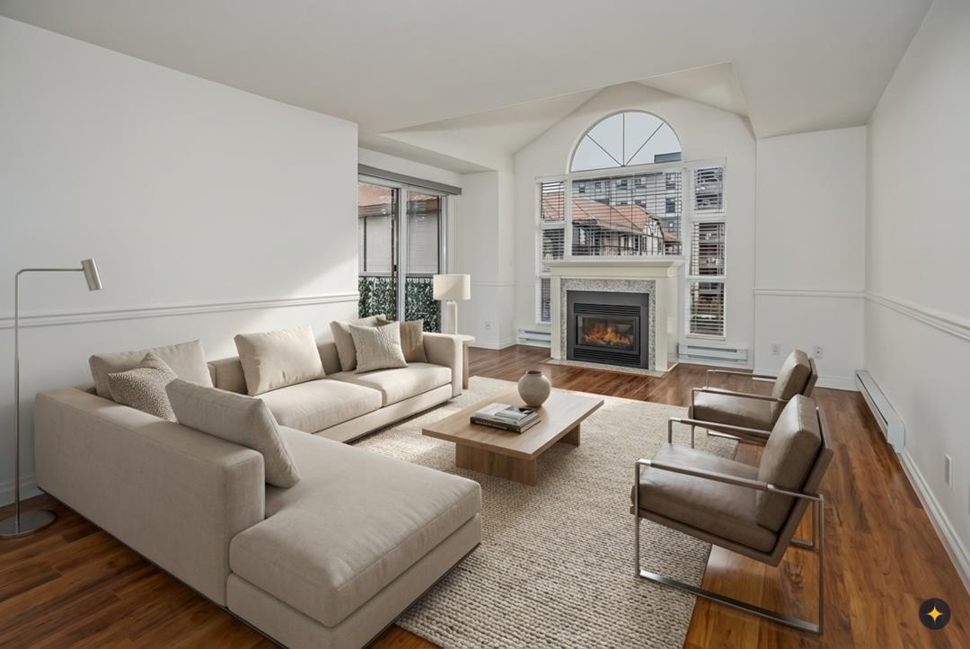WELCOME TO BRAMBLEWOODS BY THE STREAM. This spectacular 4th-floor penthouse is located on the quiet, north-facing side of the building, offering a cooler comfort during warm summer nights. The bright and spacious condo features vaulted ceilings, large windows, and cozy gas fireplace in the generous living room, complemented by a well-sized dining area. The kitchen offers white shaker cabinets and stainless-steel appliances. This home includes 2 bedrooms, with a spacious primary bedroom featuring a built-in wardrobe. Patio doors open from both the living room and primary bedroom, extending your living space outdoors. Enjoy walking-distance access to parks, trails, & shopping. This well-maintained 55+ building allows 1 small dog or cat. Don't miss this opportunity - Home Virtually staged.