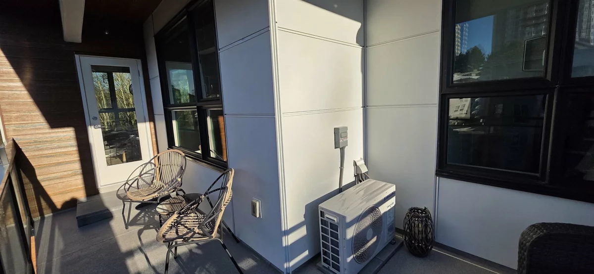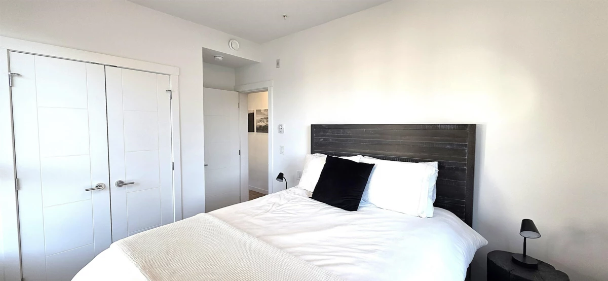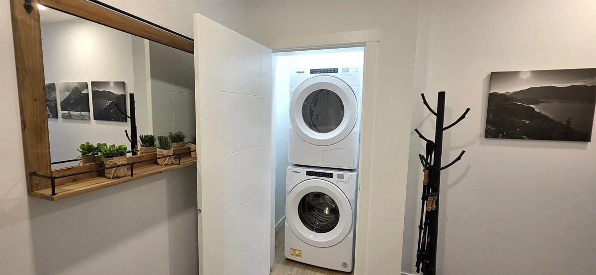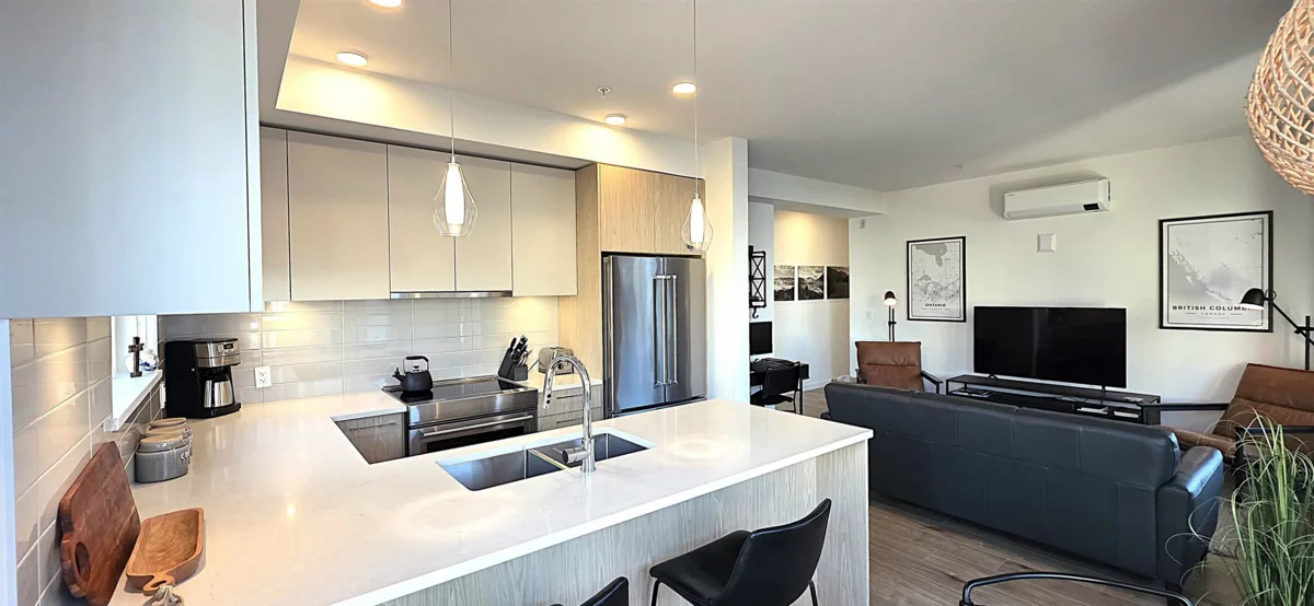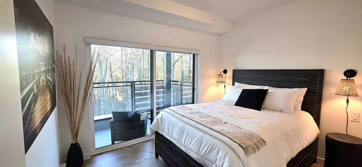 "NATURA" Life in a forest settings. Prime corner suite with balconies, 1 is off the primary bedroom with a treed private relaxing view. 2 bedrooms, 2 baths on the 4th floor. Stunning open plan with kitchen, living and dining rooms, kitchen has stainless steel appliances, island with bar seating. 10 foot ceiling with large windows give the suite amazing natural light. A/C. Wow, the resort—style amenities start with a massive rooftop patio with BBQ, firepit, with a huge adjoining family room and kitchen, sitting room off foyer with fireplace, huge patio with gazebo off back of building with stairs down to walking trails EV stations, car and pet wash area, clubhouse, bike room and repair station, storage on same level garden area, all this is included! Close to Seven Oak Mall, Mill Lake.