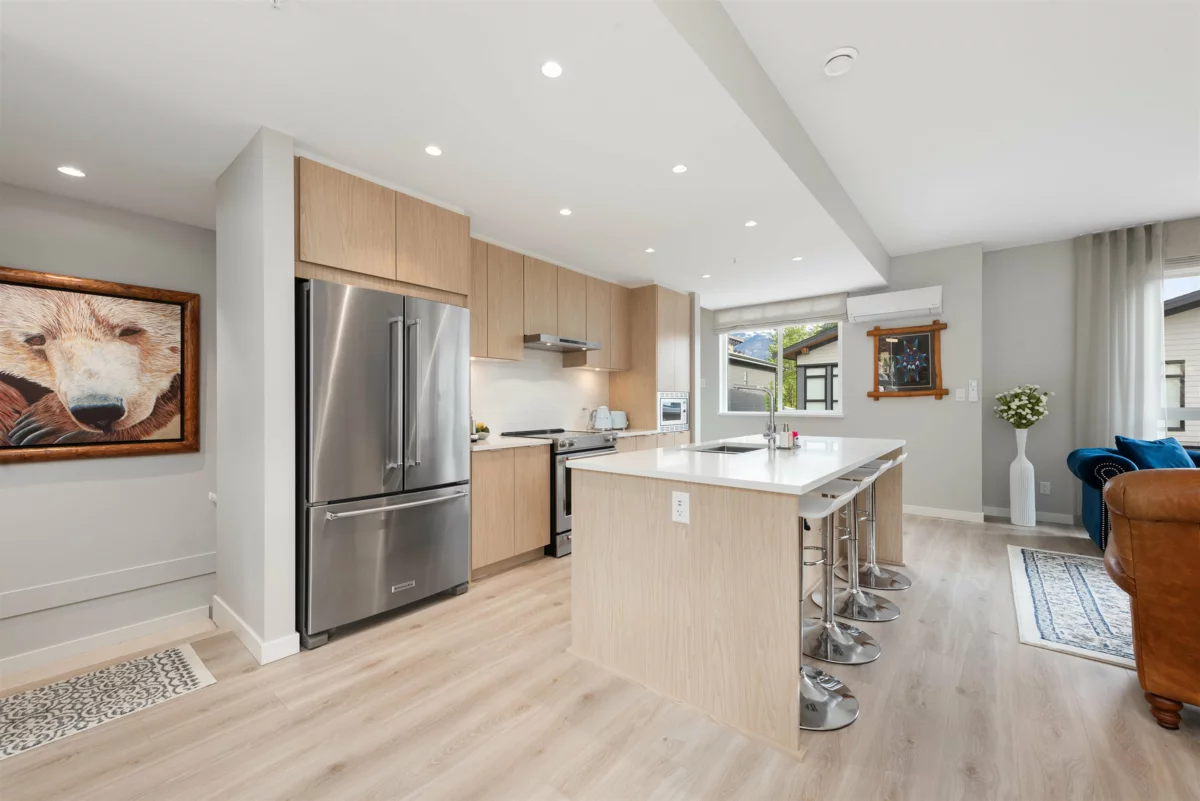 Modern Mountain Living at Highline! A newly built stylish 3 bed, 2.5 bath end-unit townhome offers 1,532sqft across three bright, functional levels. Open-concept living & kitchen w/ ~9ft island, large windows showcase views & flood the home w/ natural light. Dbl garage w/ Clever Quarters storage system & EV charger—room for parking & gear. Add’l upgrades incl. heat pump w/ A/C, floating wine rack, premium elec fireplace, accent walls, & built-ins throughout. Step out from living floor to a sun-filled, fenced patio & yard—relax or entertain. A fantastic location at Garibaldi Springs w/ 90+ acres of protected greenspace & trails lead to Jack’s Trail & Alice Lake. This home has it all—location, style, comfort & adventure! |OPEN HOUSE SAT JAN 24 12-2pm| video tour- https://youtu.be/fehX0JYg1JU