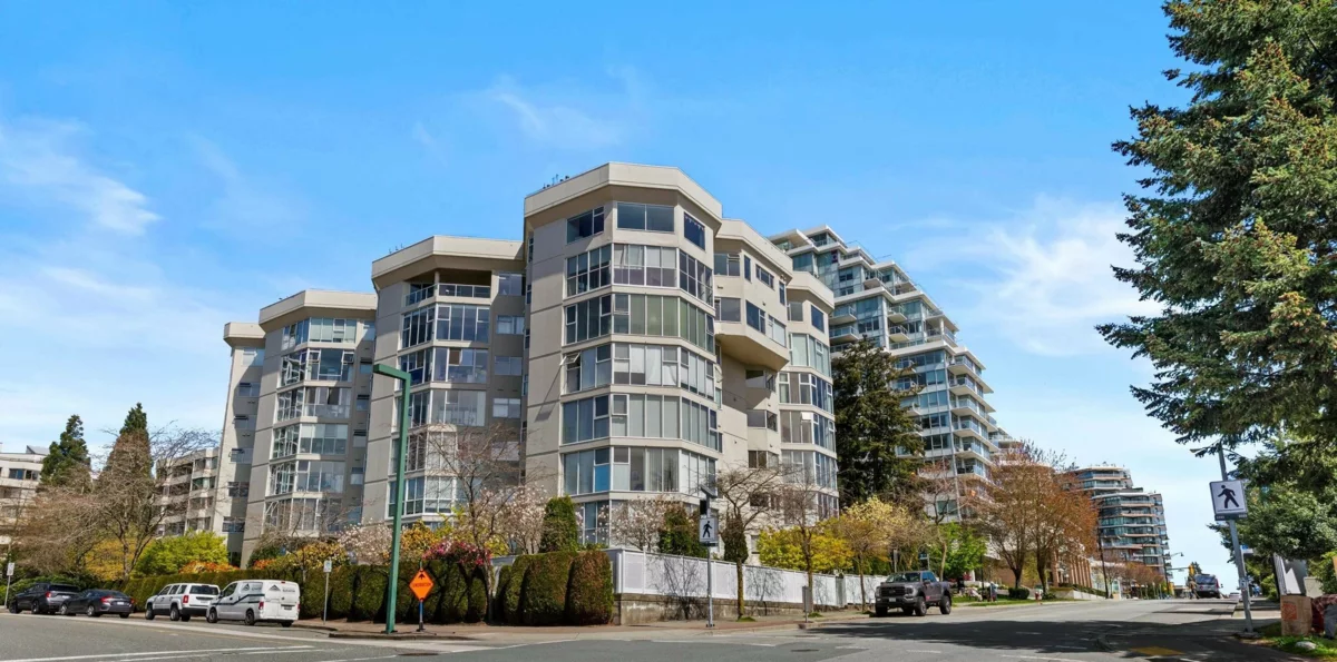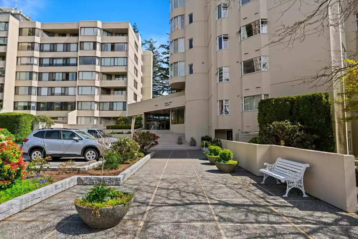 Welcome to White Rock Square II, a proactive, friendly 55+ concrete building in the heart of White Rock. Perched at the top of the hillside, this home showcases iconic panoramic White Rock ocean views & an easy, level stroll to Semiahmoo's shops, dining, healthcare, & transit. This bright 2 bed, 2 bath home offers 1,327 sqft plus an enclosed solarium with sweeping views - perfect for year-round morning coffee & evening sunsets. Enjoy the spacious sunny living/dining areas & large kitchen with updated appliances. Also featuring a king-sized primary bedroom with ensuite & huge walk-in closet. There's also a full-size laundry room with lots of storage potential. Heat, gas & hot water included. 1 parking & 1 storage locker. Sorry, no pets allowed. Smoking is also not allowed.