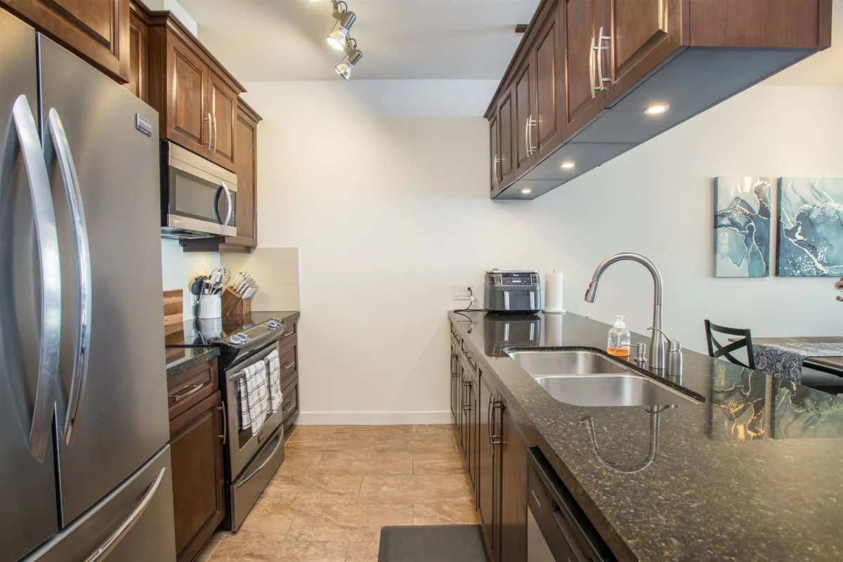 Welcome home to Wellington Station! Great 1 bedroom, 1 bathroom and den home on the top floor. Extra high ceilings in the living room and large windows make this home feel larger and open. Real wood cabinets, stone counters and stainless steel appliances in the kitchen. Primary bedroom is equipped with built in closets. Heated bathroom floors & fog free mirrors. This home has lots of extras. Close walking distance to shopping, eating, transit outside development and easy driving to WCE, HWY 7, GE/PR Bridges and more!