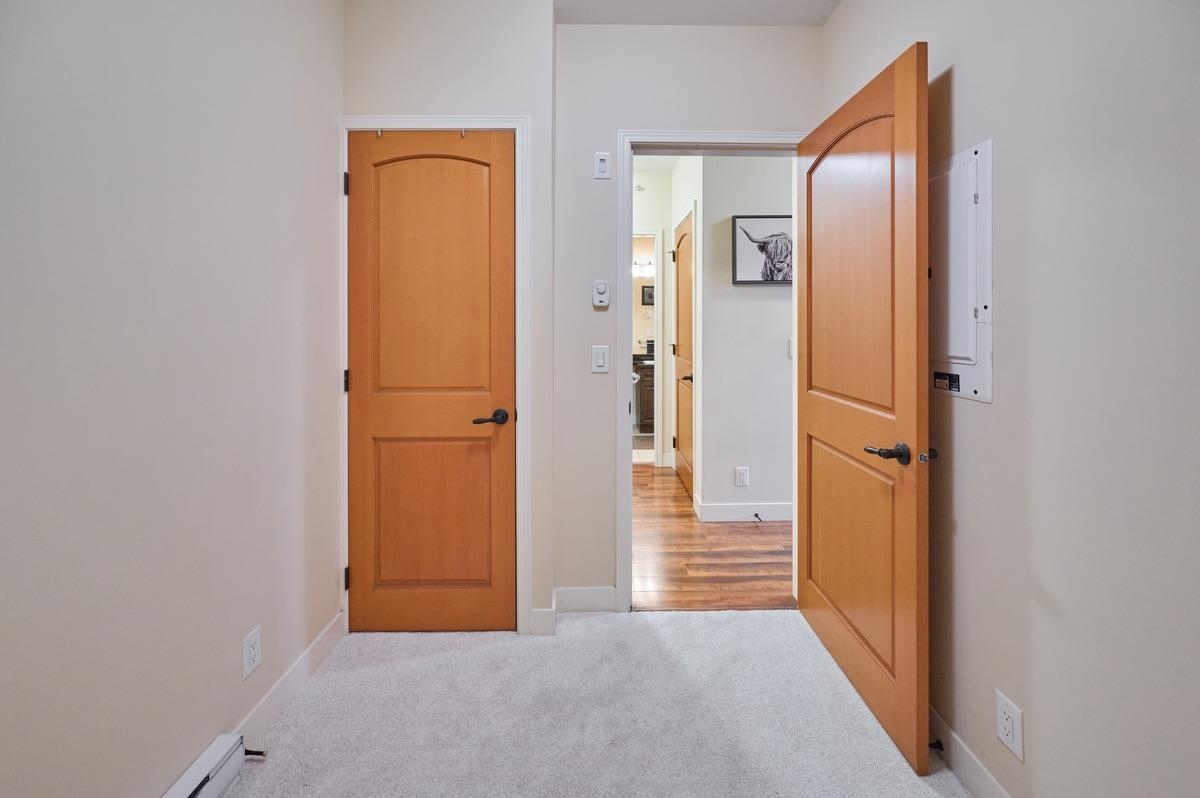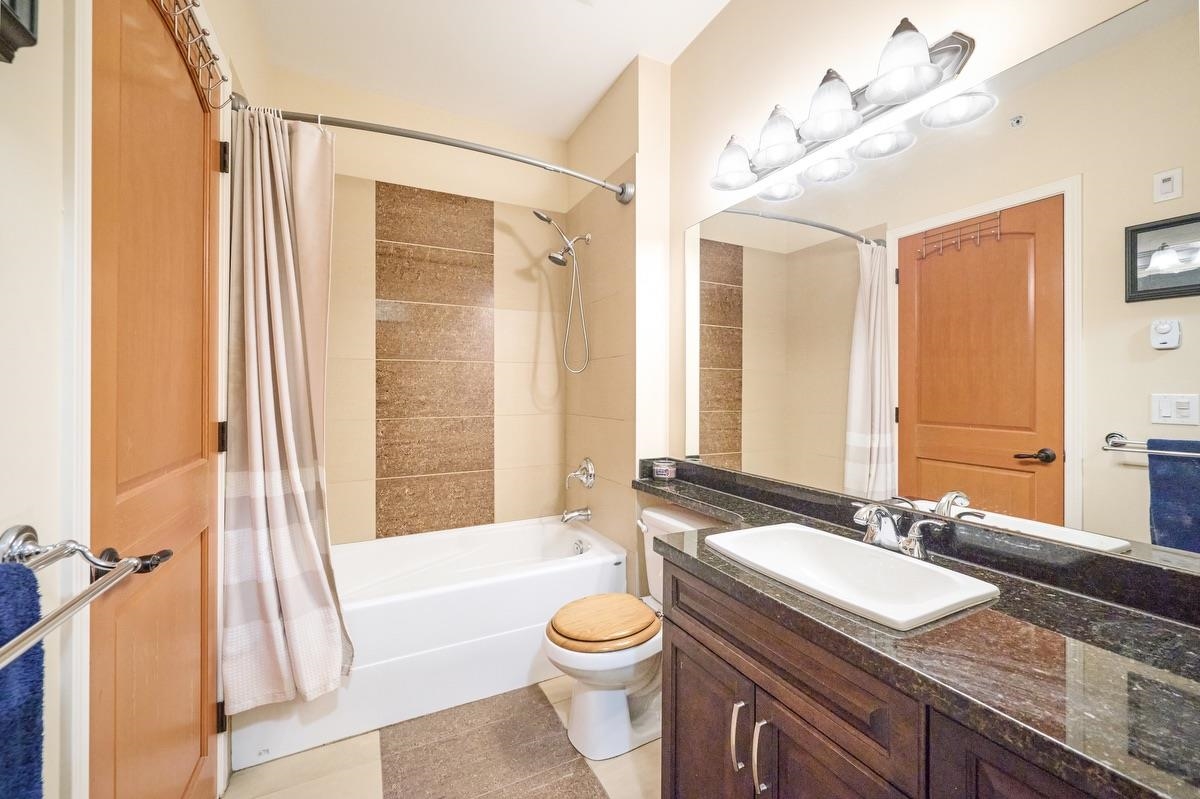 Experience modern living at its finest in this top-floor 1 bed + den at Kensington Park, crafted by Quadra Homes. Boasting 752 sq. ft. of thoughtfully designed open space, this unit features stainless steel appliances, granite countertops, solid maple raised panel cabinet doors, a built-in microwave, and garburator. 7ft solid fir interior doors, High ceilings throughout, Cathedral ceiling in livingroom, built-in A/C, and elegant laminate & tile floors create a bright, inviting atmosphere. Enjoy in-suite laundry and a covered patio with stunning Mount Baker views. With superior soundproofing and concrete-topped floors, plus proximity to schools, transit, and shopping, this home perfectly balances comfort, style, and convenience.