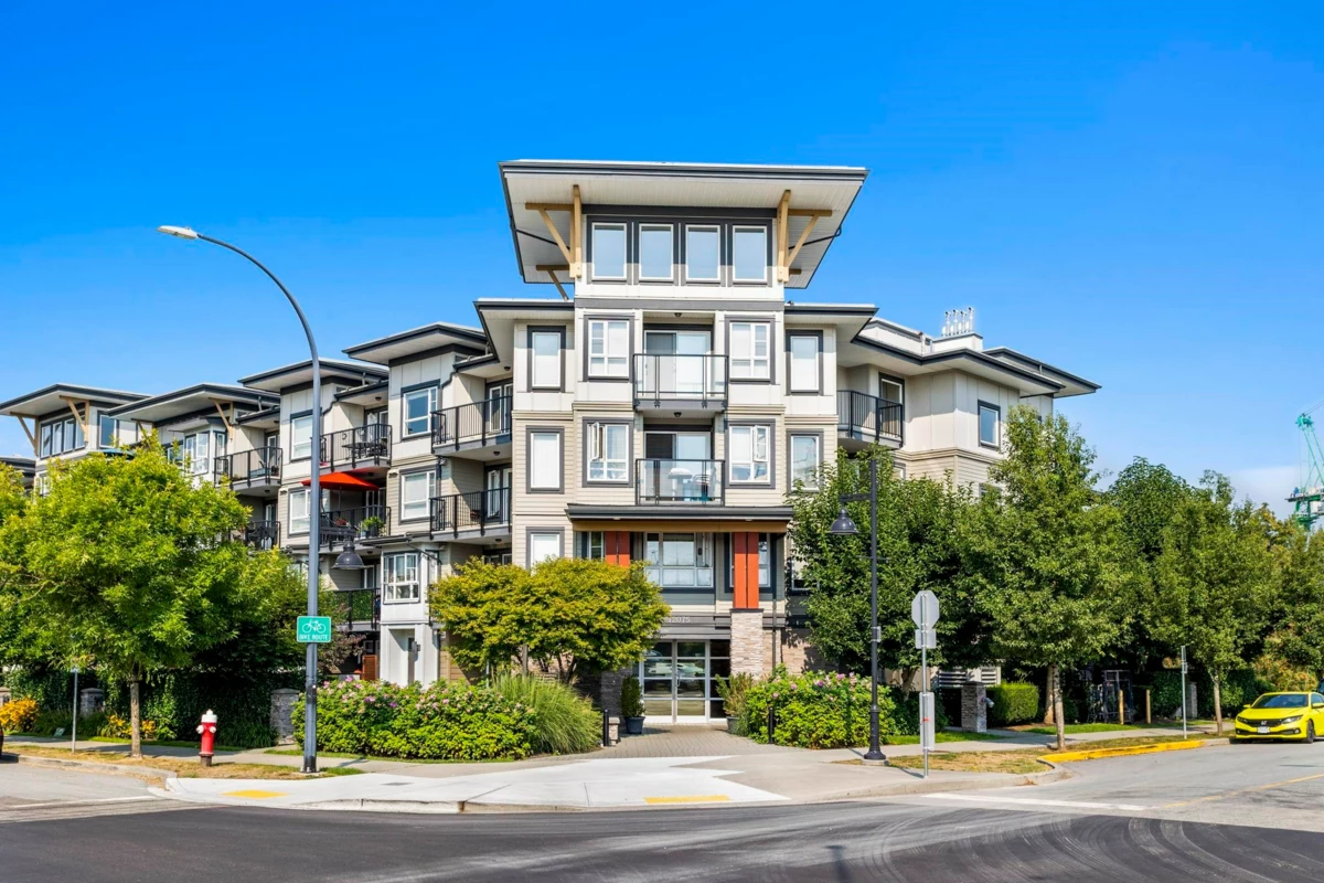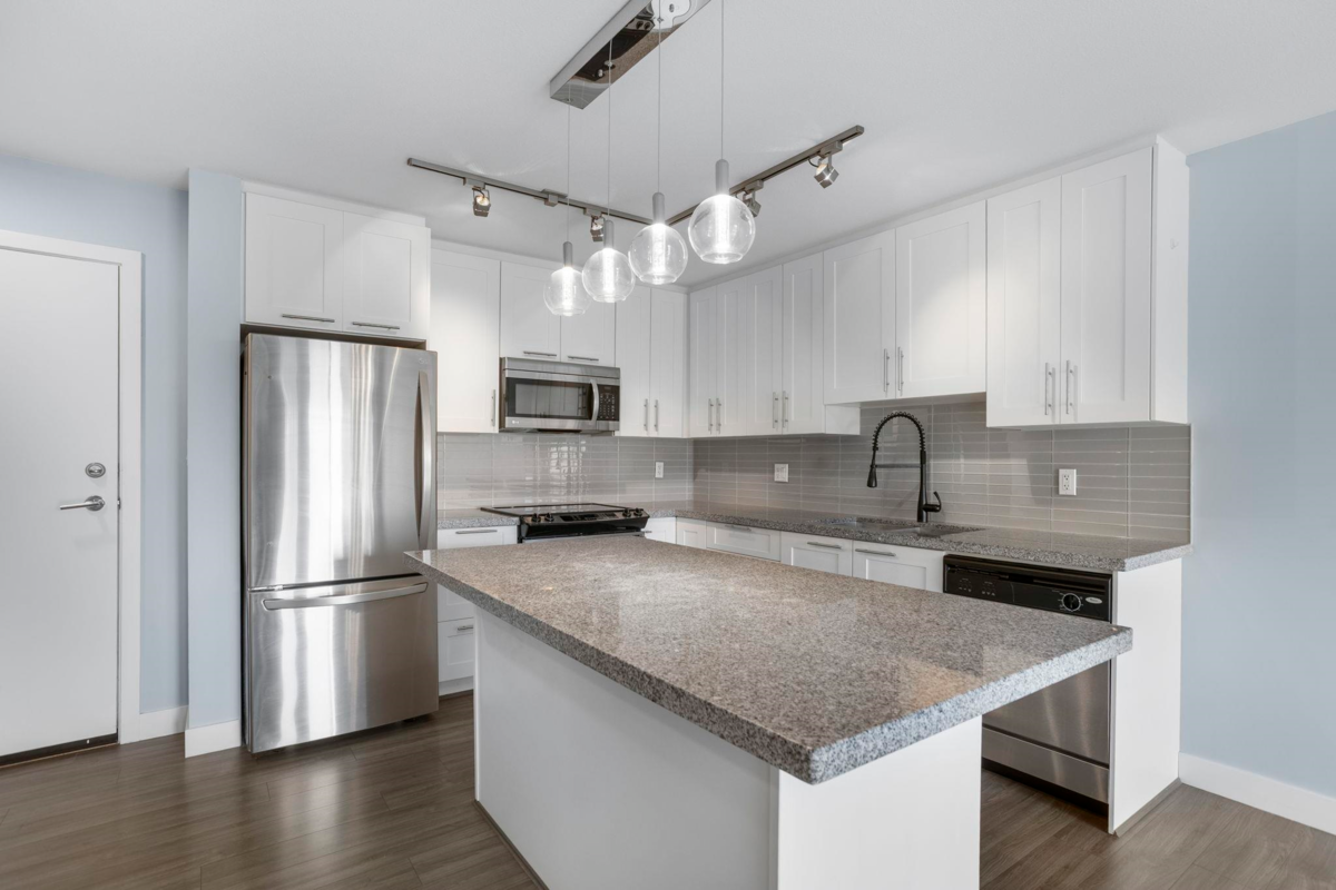 Top Floor Living at EDGE on EDGE! Welcome to 12075 Edge Street, a bright south facing 1 bedroom + large open den condo in immaculate condition and move in ready. The modern open concept layout features a gourmet kitchen with white shaker style cabinets, stainless steel appliances, and a spacious island perfect for entertaining. The primary bedroom boasts 11’ vaulted ceilings, a walk in closet, and a 4 piece ensuite with a sleek updated shower glass door panel. The versatile den works perfectly as a home office or flex space. This pet friendly building (1 dog or 1 cat) also allows rentals. Ideally located close to schools, shopping, restaurants, the library, leisure centre, bus loop, and just minutes to the West Coast Express. Call today!