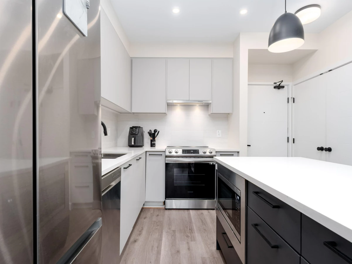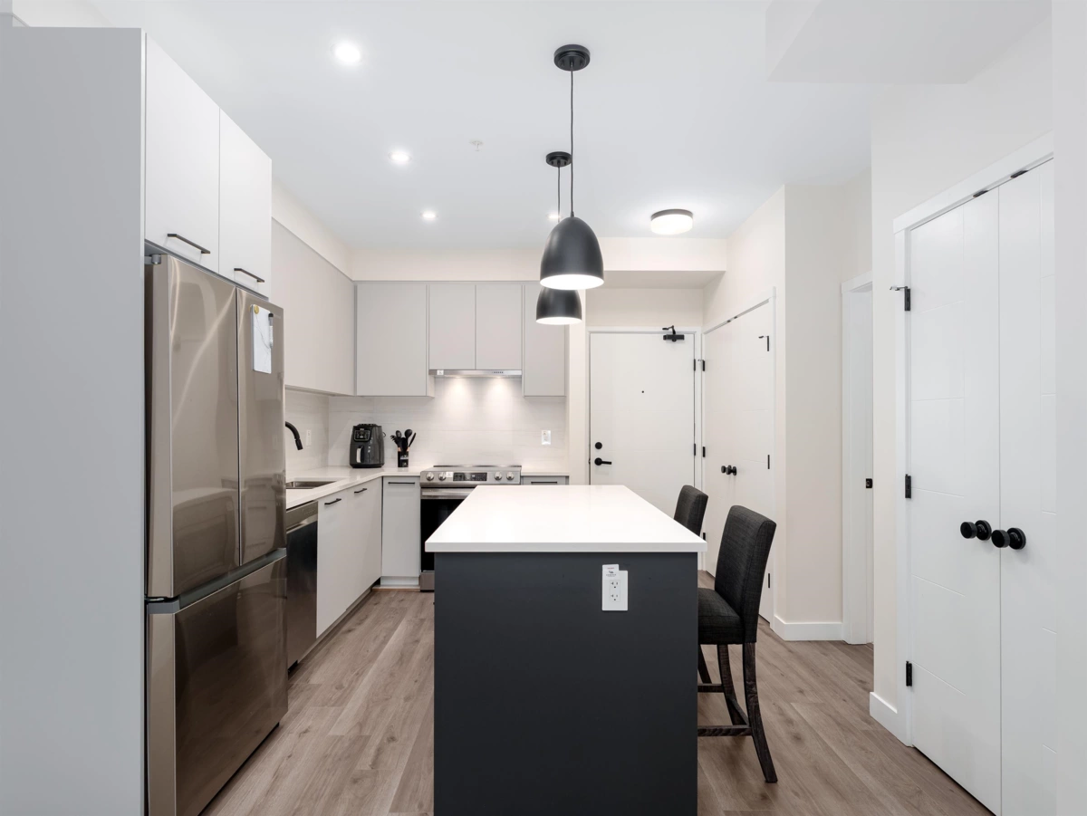 Welcome to Eastin Condos by Essence Properties! This penthouse bright 1 bed/1 bath home offers stunning mountain views, upgraded appliances, enhanced flooring, and a custom shower surround. The open layout includes a modern kitchen with quartz counters, sleek cabinetry, and premium finishes. Enjoy your private balcony, secure parking, storage, and the convenience of the 1Valet smart building system. Residents also have access to a fitness studio, lounge with kitchen & co-working space, landscaped courtyard, dog wash, and children's play area. Close to Willoughby Town Centre, schools, parks, this home blends comfort and convenience in the heart of Langley. Offers to be reviewed January 26 at 6pm.