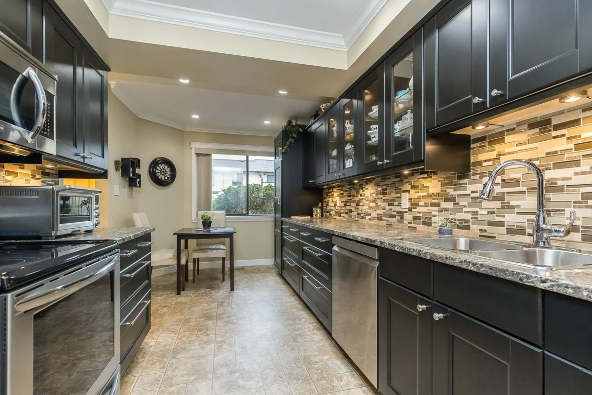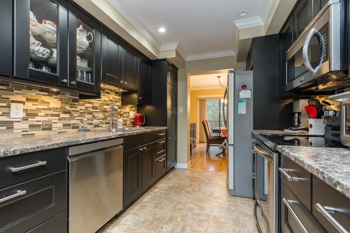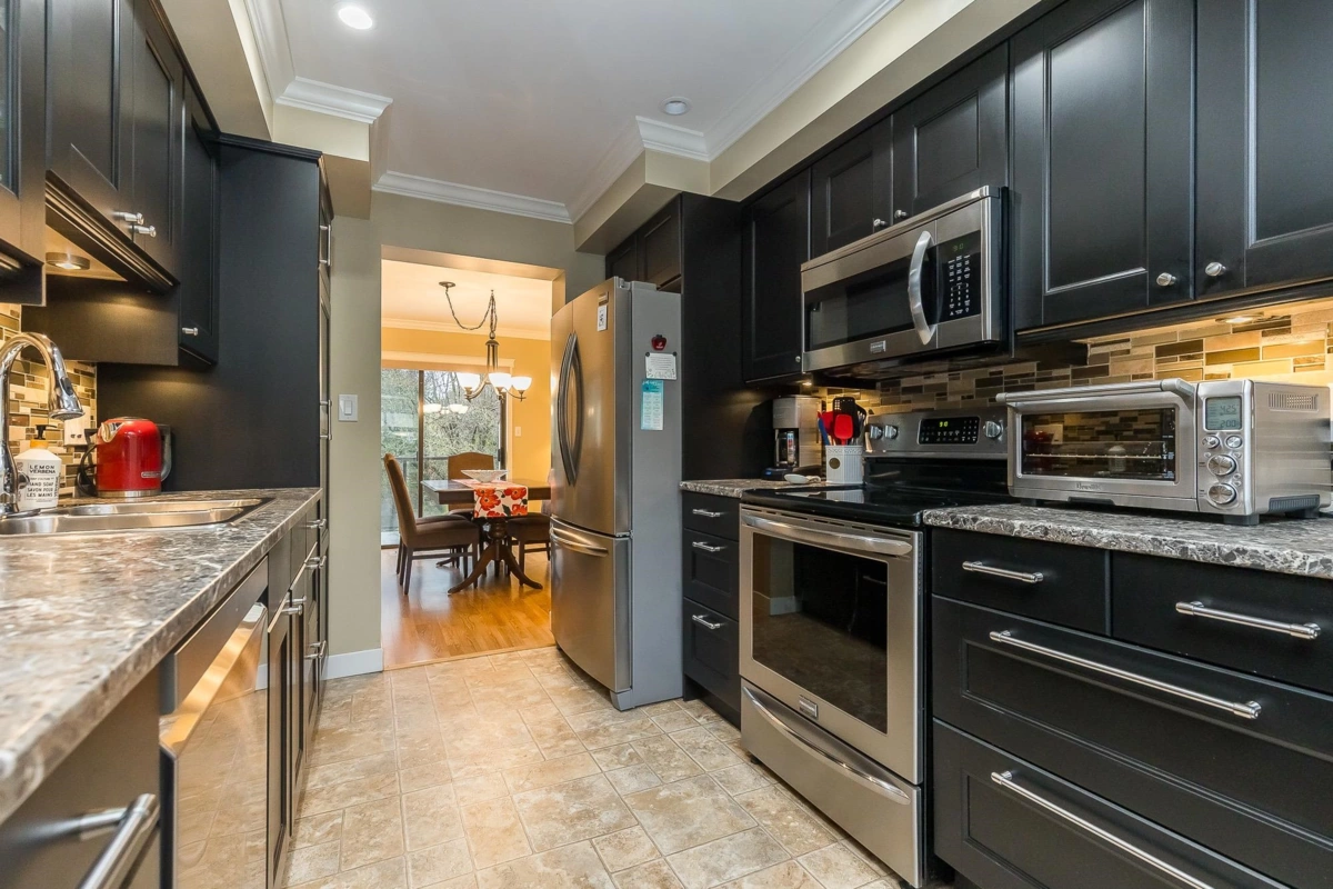 GREENBELT! One of the most amazing settings you'll find anywhere in a townhome development. Savour the solitude on your huge back patio set against a park, walking trails and large common area lawn perfect for the grandkids to run around. While living in this oasis at the center of the city you're mere minutes from all levels of shops and services. Spacious over 2100 sq ft home with a daylight walkout bsmt. Great floorplan with a stylish updated kitchen with S/S appliances & separate breakfast nook and dining room. Large Primary Bdrm with big walk-in closet and a private sundeck & additional storage room. Single carport + space for a 2nd vehicle behind. Well run and maintained complex. Open to ages 55+ and small pets. Available for immediate occupancy.