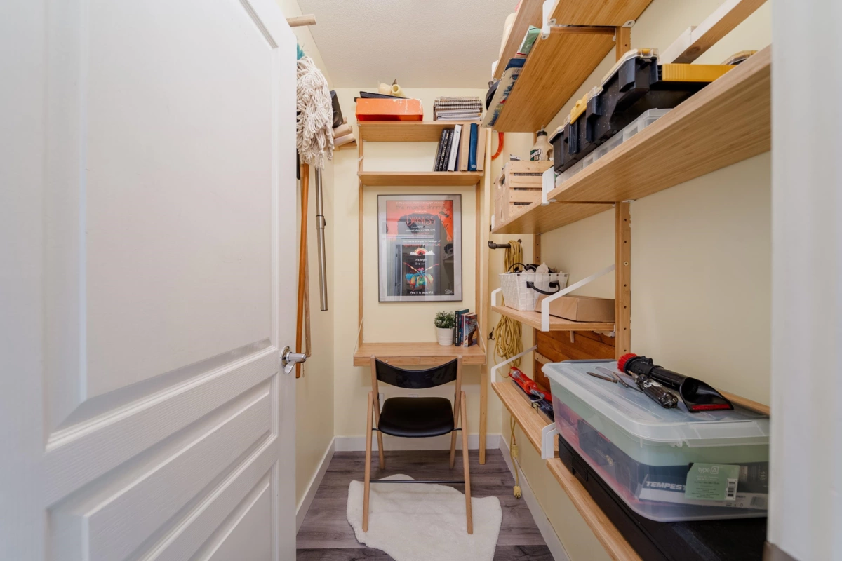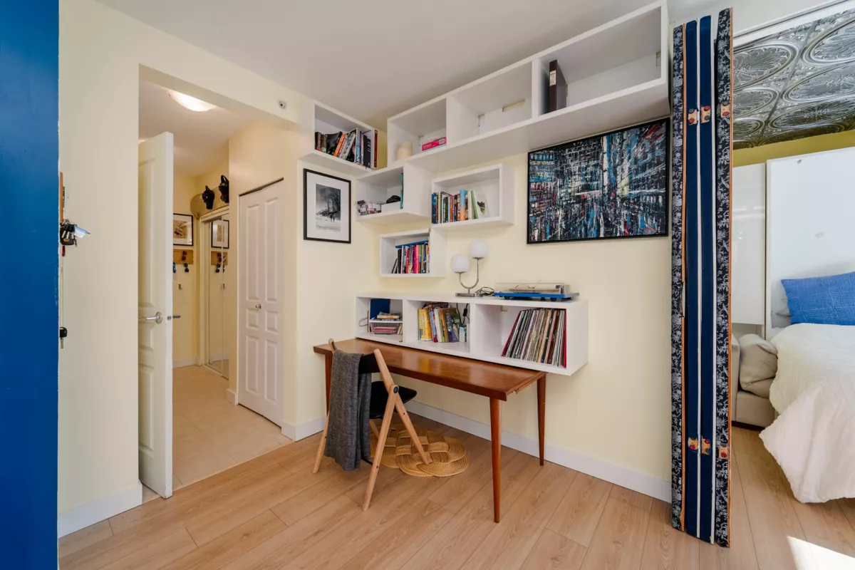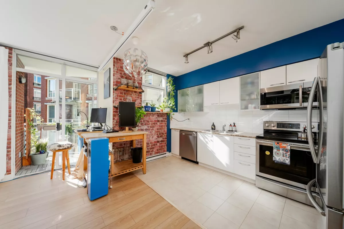 TRANQUIL Yet EVERYTHING AT YOUR DOOR! Groceries, transit, bright & modern junior one-bedroom condo w/flex room, positioned on the QUIET SIDE of the building overlooking the PEACEFUL COURTYARD. Designed for both comfort and function, this home features a smart floor plan with 9-foot ceilings, oversized windows, and elegant Winter Oak laminate flooring. The sleek kitchen boasts granite countertops, stainless steel appliances, and eat in space. Other features include a versatile flex room, IN-SUITE LAUNDRY and BALCONY. 1 PARKING underground, 1 STORAGE LOCKER. gym. Located in a vibrant & walkable neighborhood just steps to transit, Trout Lake, library, groceries, great mix of cafes. Murphy bed can be removed. High style, low maintenance, ready to move in! *OPEN HOUSE: Sat, Jan 31, 12 to 1:30.