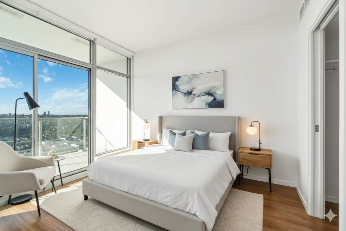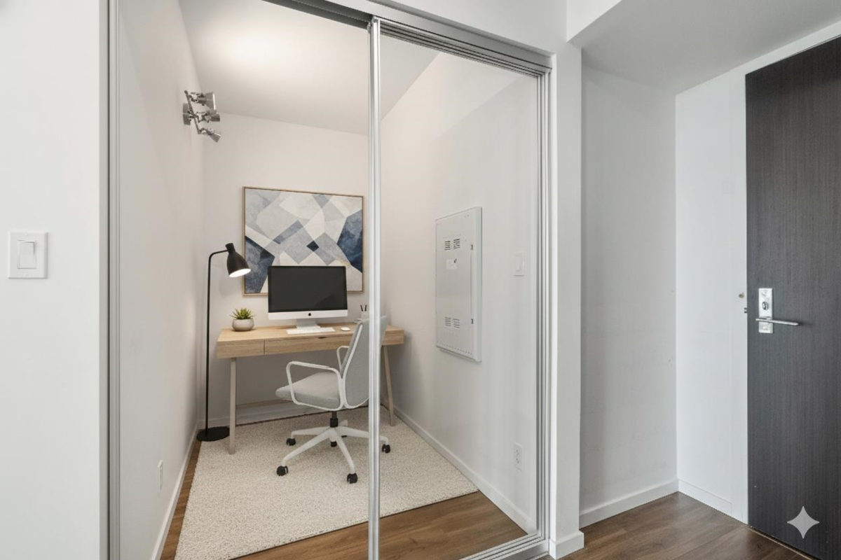 Triomphe Residences — Exceptional 2 bedroom, 2 bathroom + den home offering breathtaking south-facing panoramic views from the 42nd floor. This well-designed residence features central air conditioning and heating for year-round comfort, a functional open-concept layout with separated bedrooms, a modern kitchen, spacious dining area, and a bright living room that opens to a large covered balcony, ideal for entertaining or unwinding. The versatile den with sliding glass doors is perfect for a home office or flex space. Includes 1 parking stall and 1 storage locker. Enjoy resort-style amenities including an outdoor heated pool, fitness centre, recreation and music rooms, guest suites, EV charging, and 24-hour concierge.