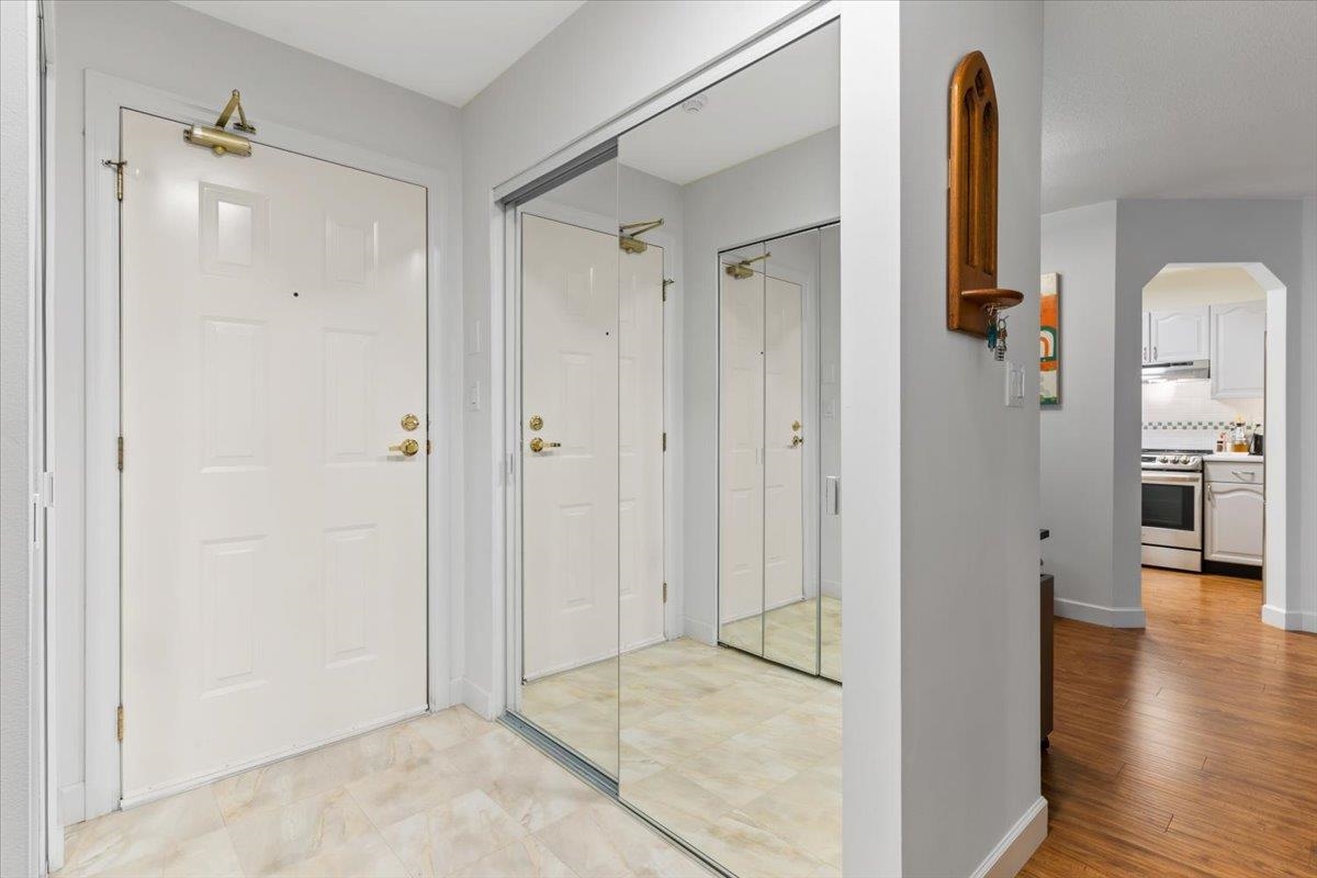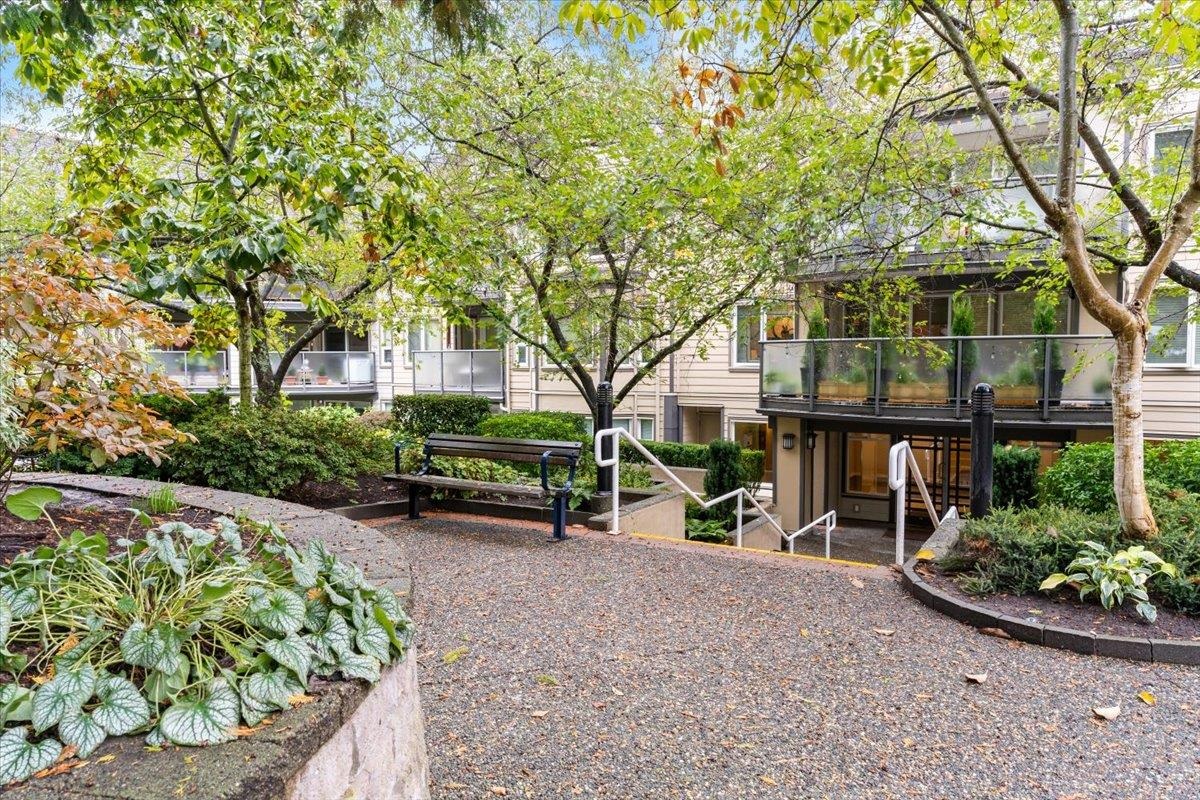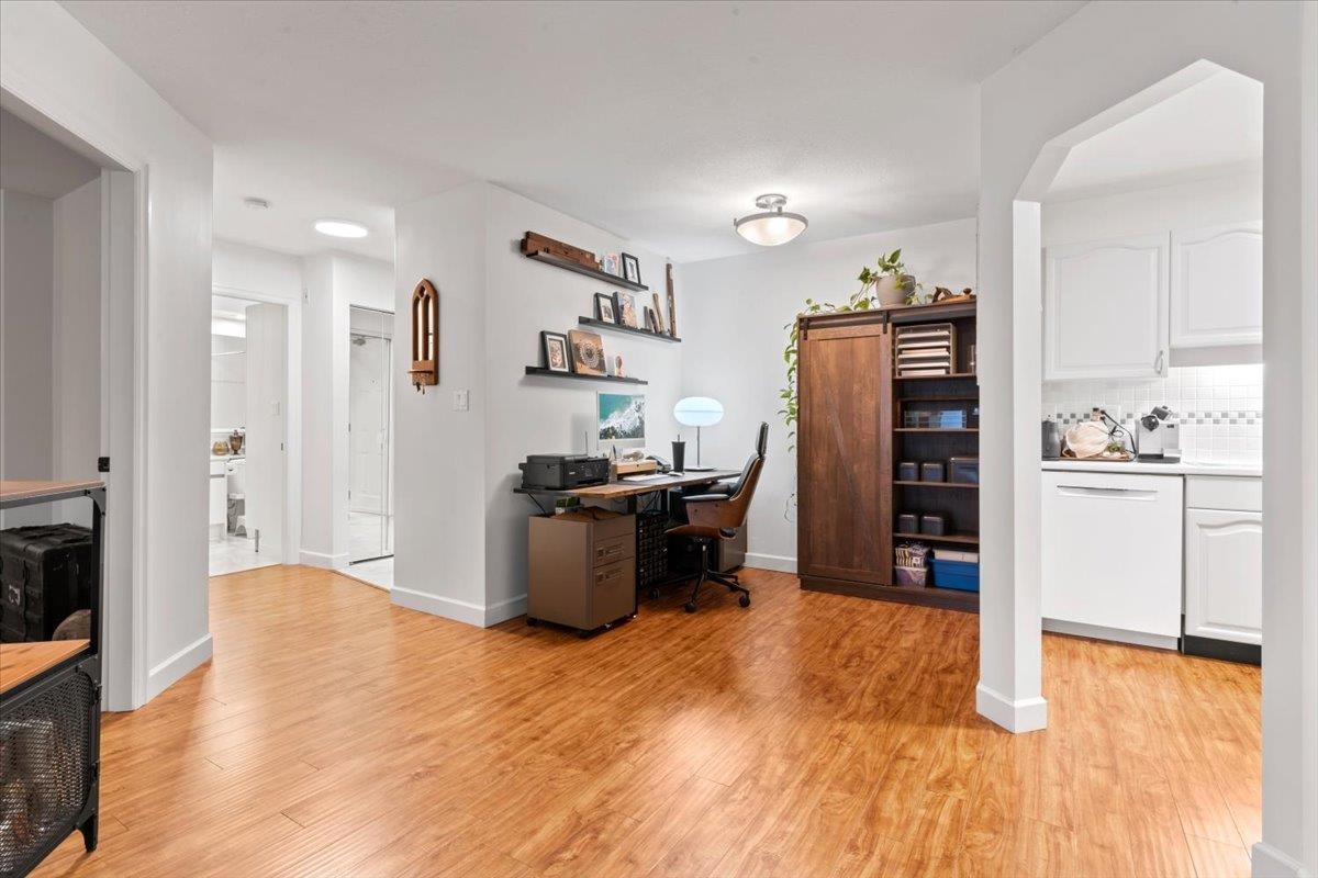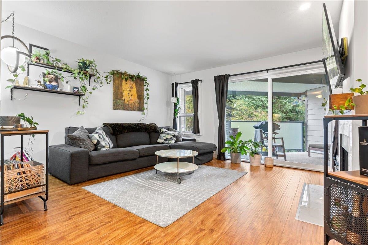 This top-floor unit at Mission Woods, a private complex with lush grounds, features a spacious 1-bedroom layout, a gas fireplace in the living room, a large deck overlooking the courtyard, and a flexible space for dining or office use. Surrounded by trails and close to schools, daycare, Skytrain, and shopping. The well-maintained building offers upgraded amenities, including an elevator, windows, and a proactive strata. The unit has an updated kitchen, 1 parking spot, and 1 storage locker, along with visitor parking, a workshop, library, gym, and an infra-red sauna. Open House Oct 21 & 22 from 2-4pm