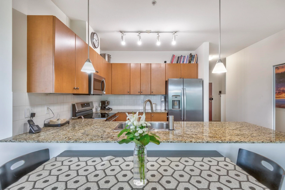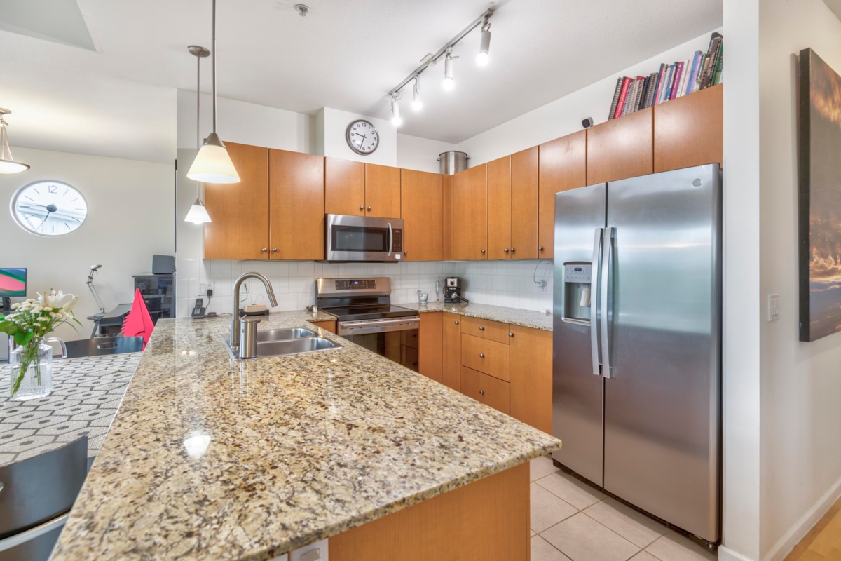 Fabulous quiet corner penthouse with views and high vaulted ceilings, wood flooring, 3 bedrooms, den, 2 baths AND 2 large balconies overlooking peaceful serene garden makes this unit worth it! Two parking stalls (plus the ability to rent extra parking). Also comes with 1 locker and bike room. Granite counter tops, new S/S appliances, vaulted 15' ceilings in living room, bedrooms and 9' ceiling elsewhere. Wood flooring throughout. Great family oriented complex complete with outdoor swimming pool, hot tub, sauna, gym, playground & garden. Excellent walking score and wheel chair accessible. Sizing up or down, this place is for you! Don't miss out - sizing up or down this is the one! Make your appointment to view!