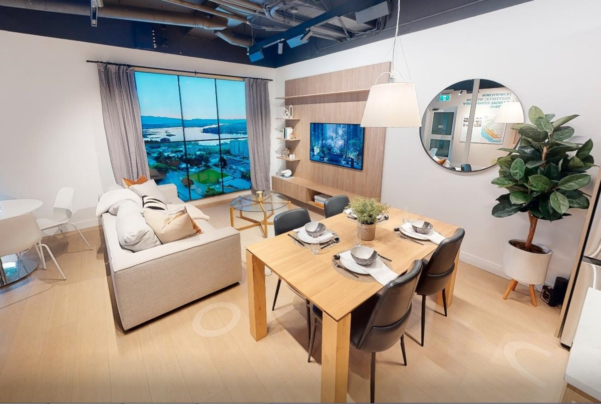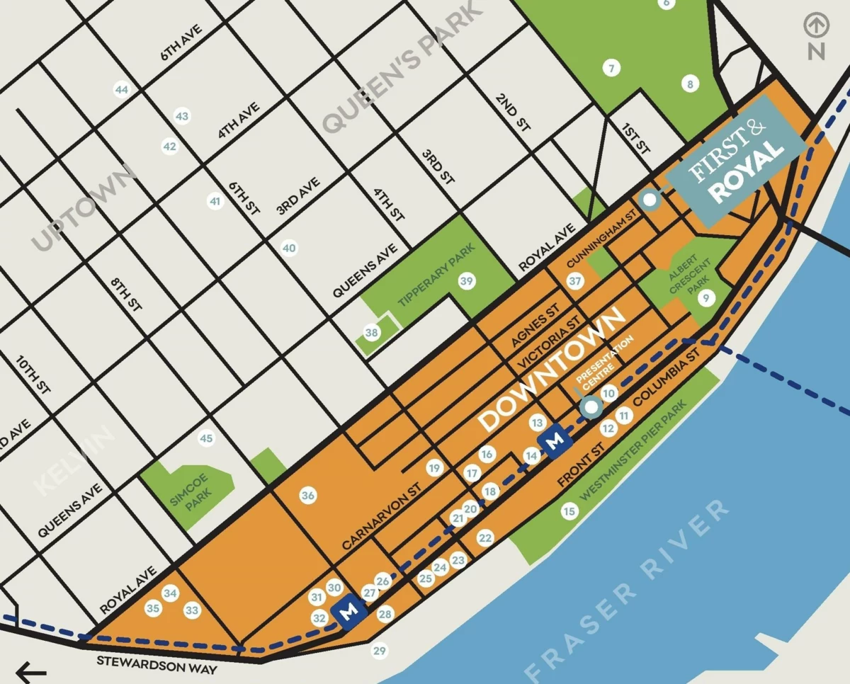 Desirable South-East RIVER VIEW! Centrally located in New Westminster's historic downtown neighbourhood at First & Royal by Areva Living. Functional 417 SqFt - Studio & DEN + 1 Bath. Features : South-East Exposure, Portico Design - Dark Scheme Interior, HRV, s/s appliance set, private balcony, 1 EV R/I Parking & 1 Locker included, 2-5-10 NHW. Amenities include : rooftop bbq communal terrace, fitness gym, rec room, indoor theatre. Amazing transit convenience at Columbia Skytrain Station for Burnaby - downtown & Coquitlam / Surrey commute. Steps to Douglas College, Royal Columbian Hospital, Queen's Park. Desirable school catchment : Qayqayt Elementary & New West Secondary. Pets & Rentals OK! Ready to Move-In soon; ASSIGNMENT of Contract. Estimated Completion - Spring 2026.