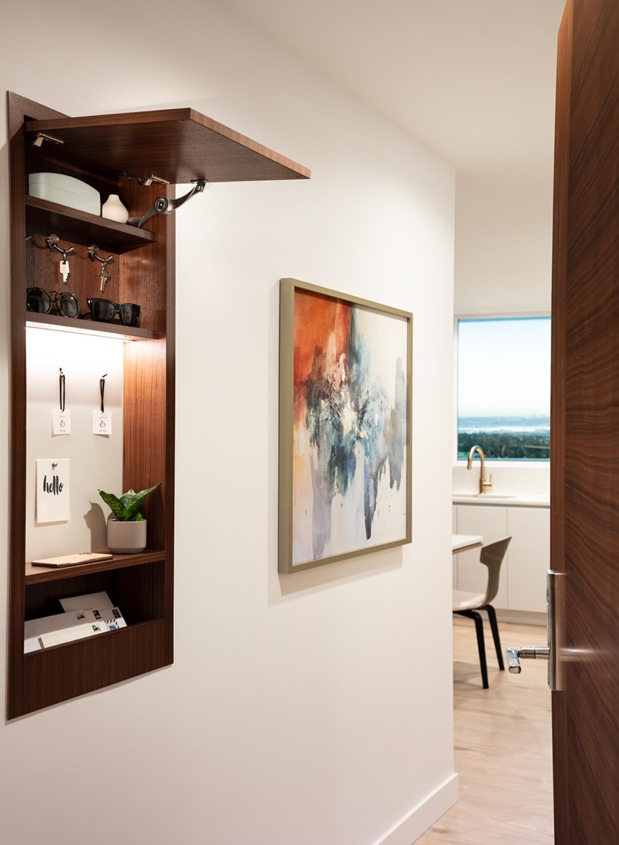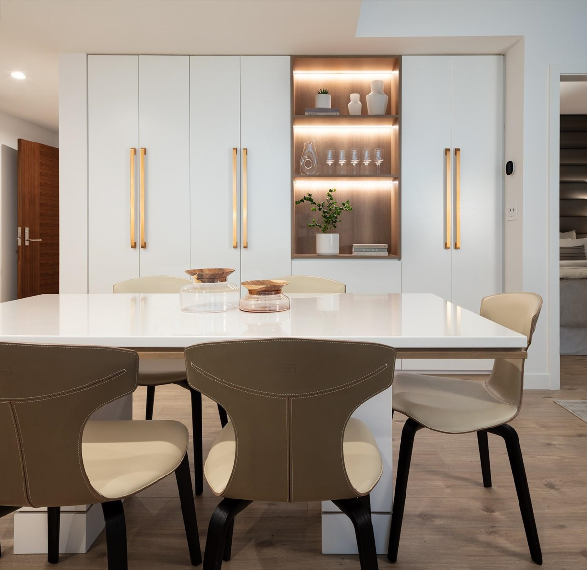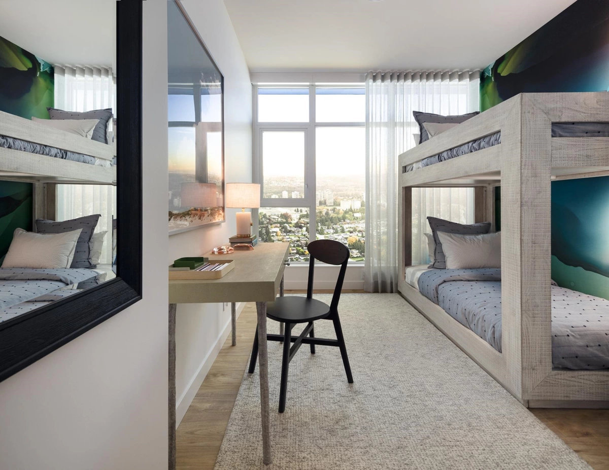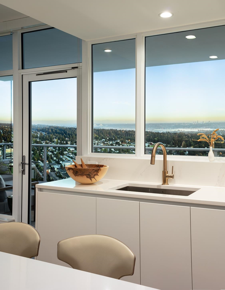 Enjoy amazing sunsets and unobstructed mountain vistas from this 2-brm 2-bath CORNER home. Huge 233sf patio! Gorgeous WHITE KITCHEN with champagne bronze plumbing fixtures + hardware, built-in pantry wall, custom cabinetry and 30} integrated Fisher & Paykel / Bosch appliances. Air-conditioned! Master brm offers built-in wardrobe, heated ensuite floors, double undermount sinks and frameless glass shower with adjustable shower head. Full-size washer dryer. Concrete Smith & Farrow tower built by Boffo Developments. Resort-style amenities include rooftop lounge, outdoor swimming pool, hot tub, fitness centre and concierge. Quiet residential street one block from Burquitlam skytrain and walking distance to Lougheed Mall. One EV-ready parking and one storage included.