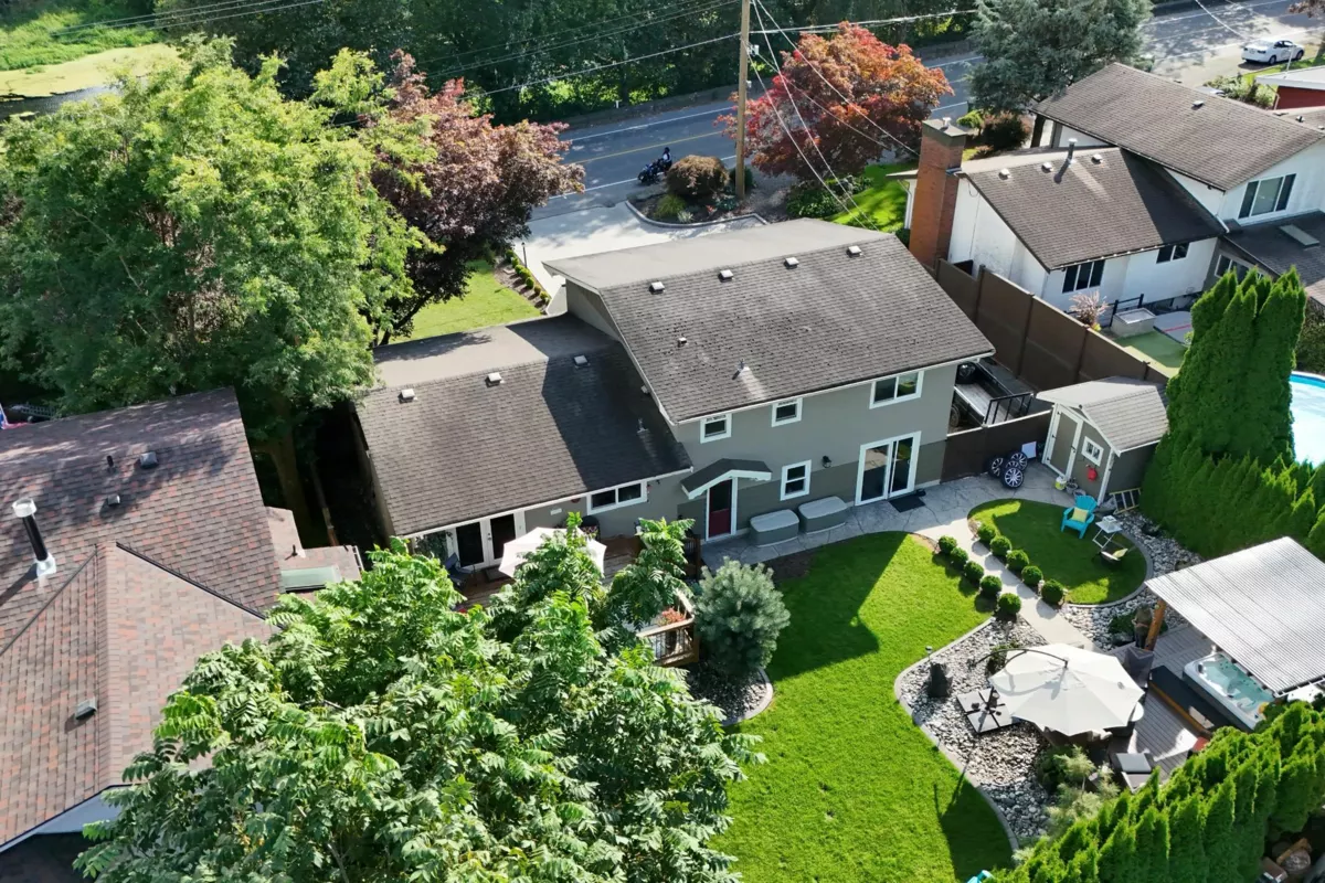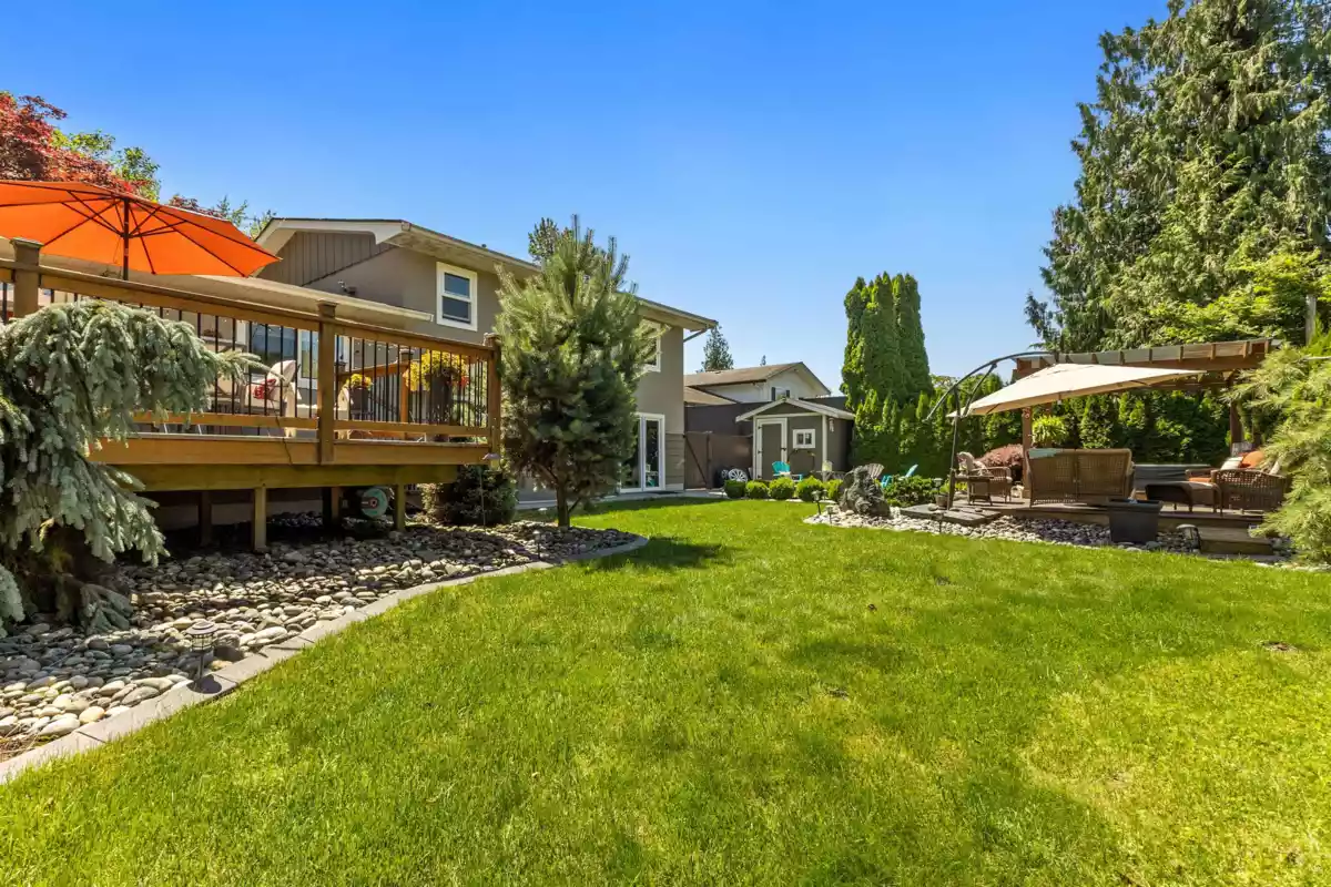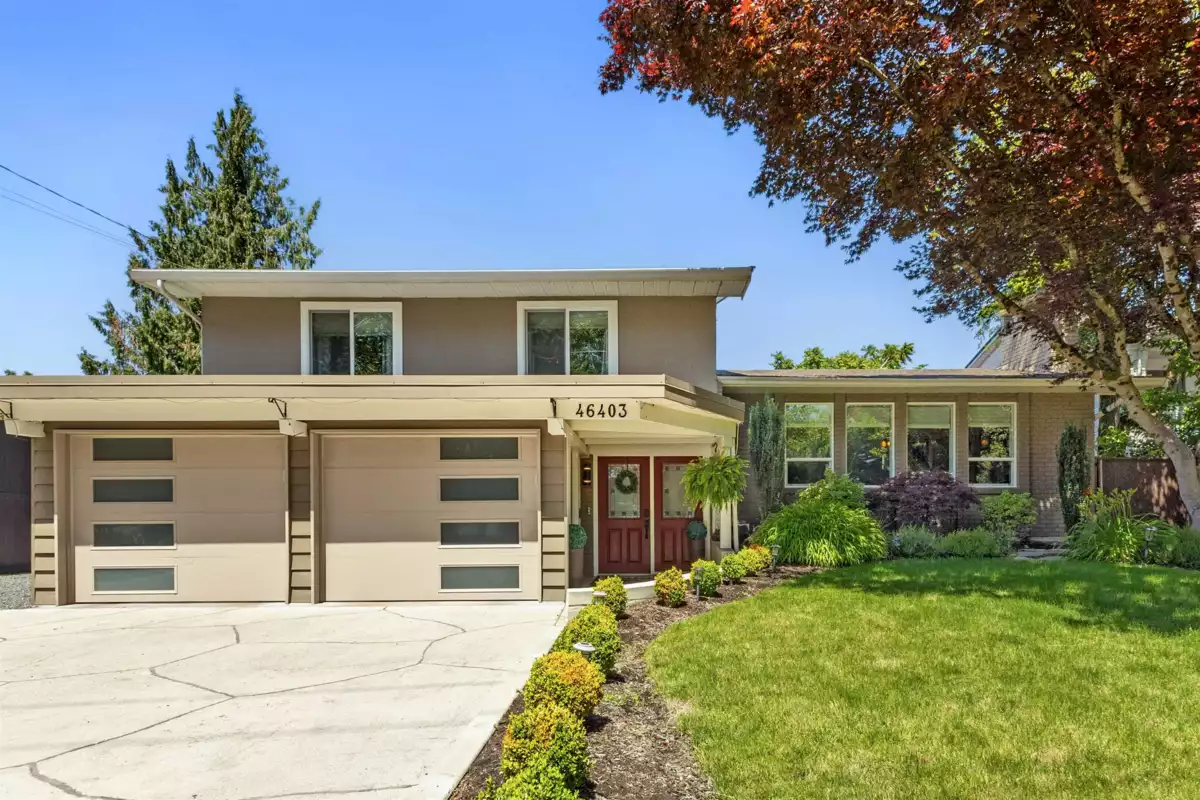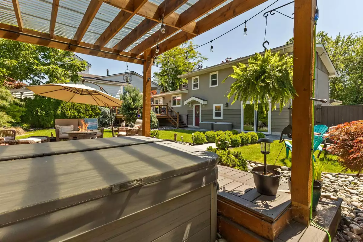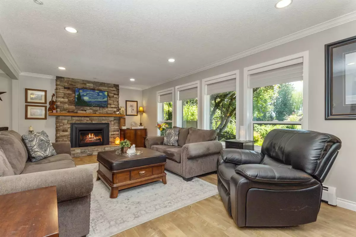 HOME FOR THE HOLIDAYS, fully updated, valuable property with views of Hope River. Fantastic living spaces on all 3 levels incl. formal level entry and family room with easy walkout to the amazing yard space. Main floor with living rm with a new natural gas fireplace and south-facing windows w/electric blinds. Modern kitchen with shaker cabinets, quartz counters, inlay sink, gas range and island open to the dining rm w/ French doors to the sundeck. Upper level with 3 good-sized bedrms, primary w/ ensuite, deluxe 5-pce main bathrm. Quality updates throughout. Excellent in the city location, 80 ft frontage, 8,712 sq ft landscaped property, in-ground sprinklers, large newer concrete driveway, RV parking, private backyard with patio, sundeck and gazebo with hot tub. Location and style!