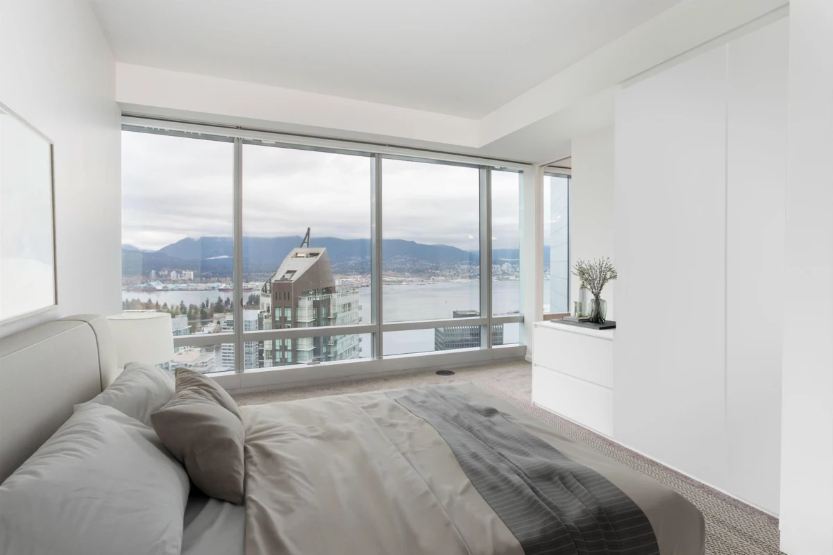 Experience breathtaking ocean vistas from this iconic Arthur Erickson designed residence at the Paradox. This ultra-luxurious 2-bedroom, 3-bathroom + flex home offers the perfect fusion of sophistication and comfort. Enjoy a spacious, light-filled living area and a gourmet chefs kitchen equipped with premium Gaggenau appliances. Both bedrooms are thoughtfully separated for privacy, each featuring its own spa-inspired ensuite with marble finishes and elegant glass-enclosed showers. Unwind while taking in spectacular panoramic views of the North Shore mountains, Stanley Park, and Coal Harbour, an impressive backdrop from dawn to dusk. Exceptional array of premium amenities, including concierge, room service, fitness centre, indoor pool, jacuzzi, Mott 32 fine dining, Karma Lounge & more