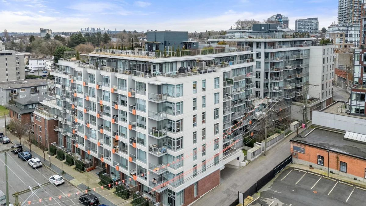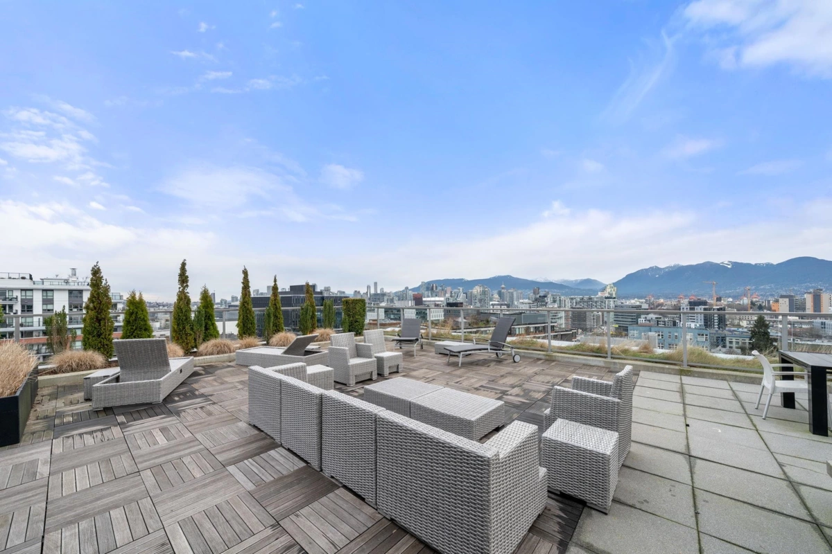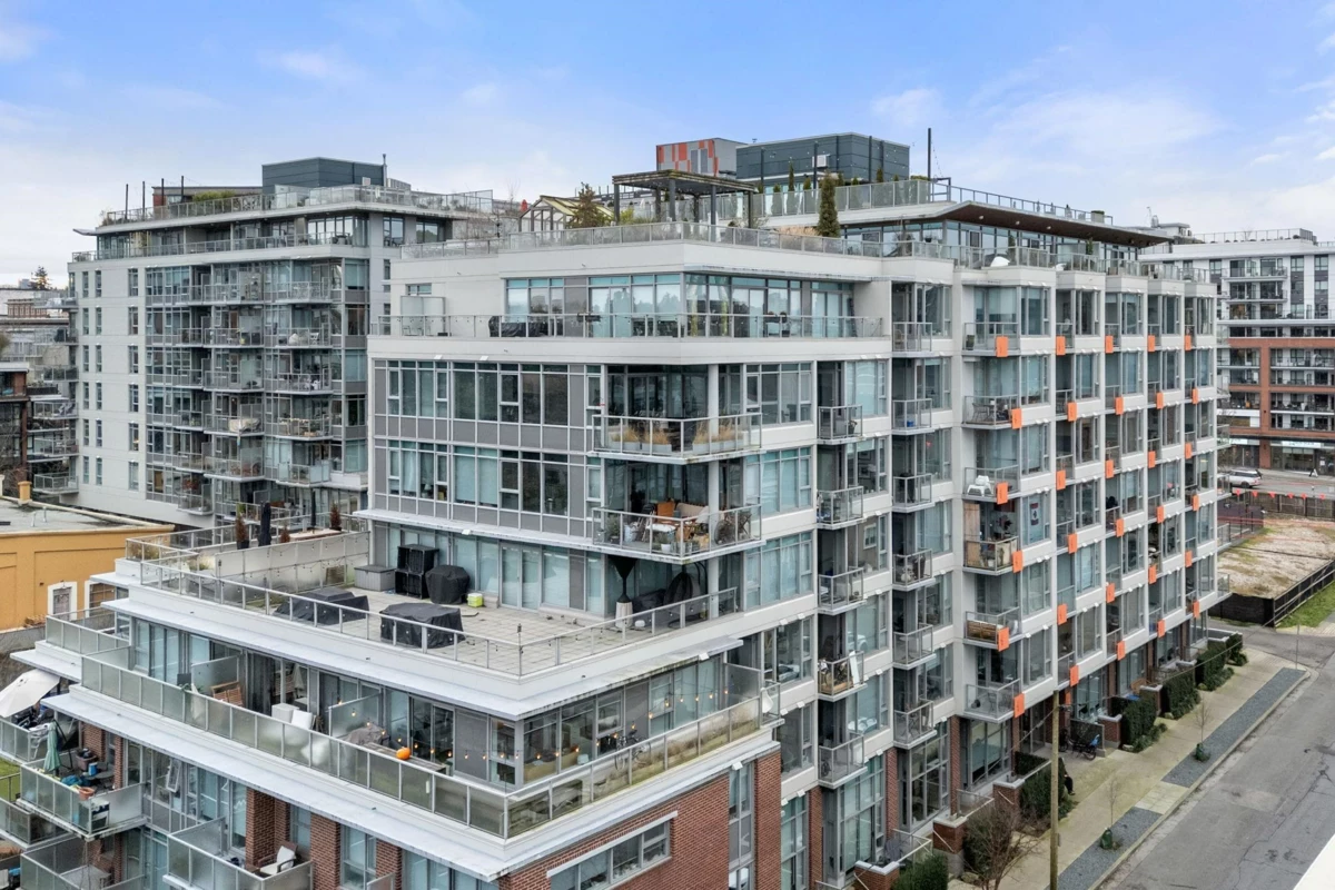 1 bedroom + spacious den home in District, a quality concrete building by Amacon, located at the heart of Mount Pleasant. This layout offers excellent separation of space with a true den, perfect for a home office, nursery, or guest room. The open-concept kitchen features stone countertops, s/s appliances, double fridge, and room for an island. Enjoy the generous covered patio year-round. You'll love the community vibe, w/ amenities including two rooftop decks with BBQs, fireplace, dining areas, garden plots, gym, meeting/work rooms, media lounge & bike storage. 1 parking & storage. Walk or bike to Mount Pleasant’s best cafés, restaurants, breweries, local shops, parks, the seawall & upcoming Broadway SkyTrain stations. The best of Main street living in this vibrant, central location.