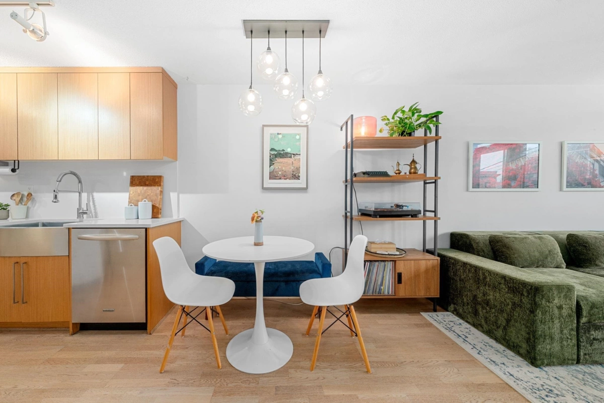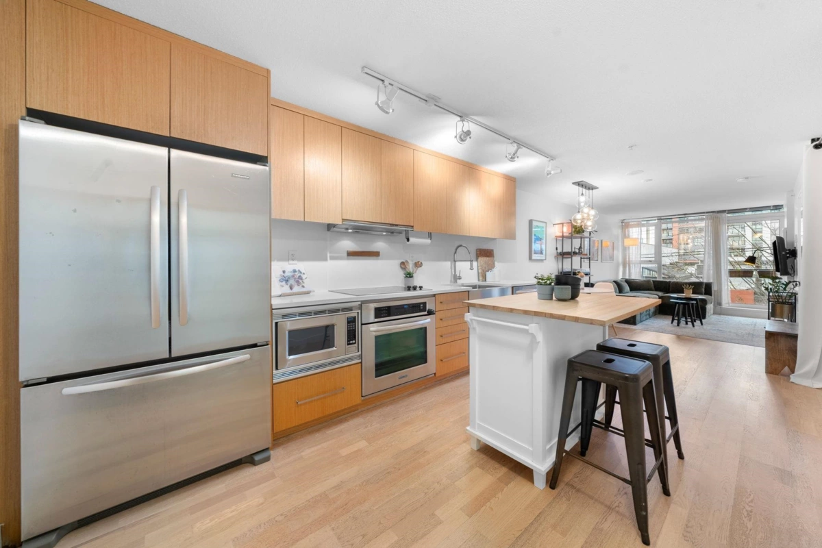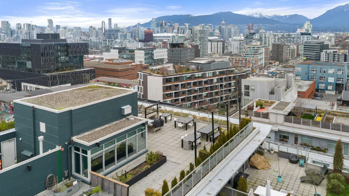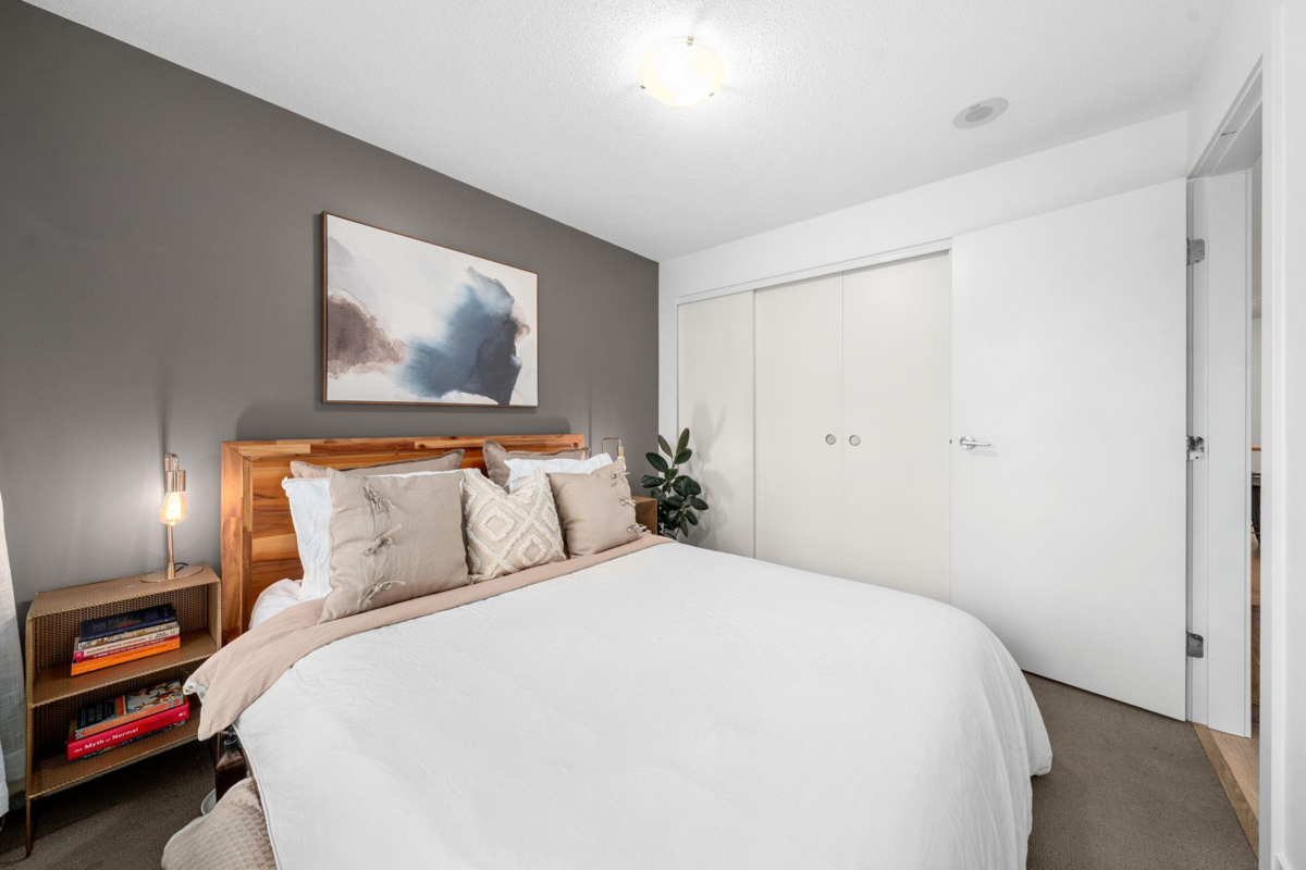 1 bedroom + spacious den home in District, a quality concrete building by Amacon, located at the heart of Mount Pleasant. This layout offers excellent separation of space with a true den, perfect for a home office, nursery, or guest room. The open-concept kitchen features stone countertops, s/s appliances, double fridge, and room for an island. Enjoy the generous covered patio year-round. You'll love the community vibe, w/ amenities including two rooftop decks with BBQs, fireplace, dining areas, garden plots, gym, meeting/work rooms, media lounge & bike storage. 1 parking & storage. Walk or bike to Mount Pleasant’s best cafés, restaurants, breweries, local shops, parks, the seawall & upcoming Broadway SkyTrain stations. The best of Main street living in this vibrant, central location.