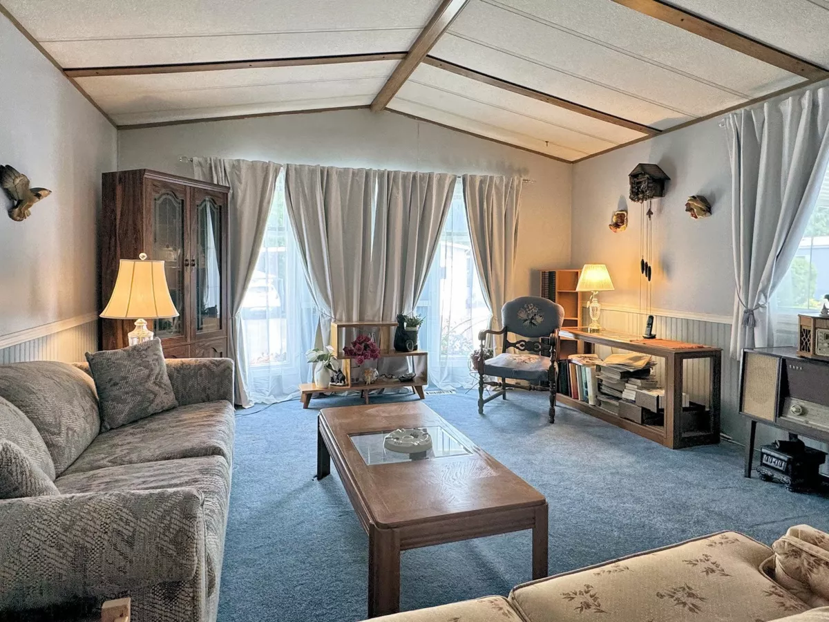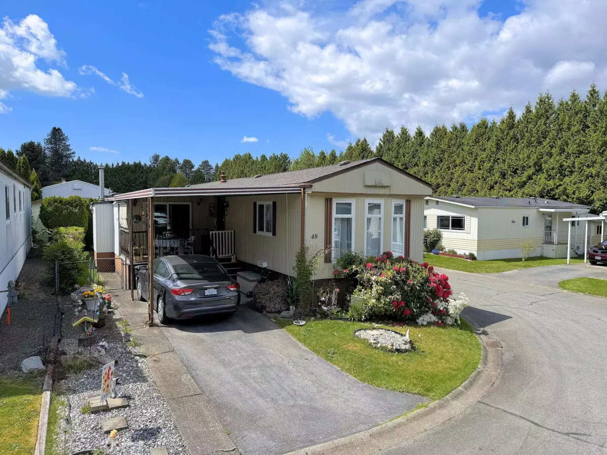 OWN YOUR LAND! Nice corner lot in this 48 lot gated STRATA 55+ retirement park with a strata fee just $189.65. The 3378 sf lot has a private hedged and fenced garden area plus covered sundeck and carport. The addition is a family room with cozy gas fireplace and a storage room. Main living area has vaulted ceilings, a spacious kitchen with new taps plus lots of cabinets and counter space. Large master bedroom has a full wall of closets. Updates include roof (2020), furnace (10 yrs), h/w tank (2023), and all vinyl windows. The resulting utility costs are about $60 per month for gas and $57 per month for hydro. it's affordable living with no threat of pad rent increases. Buy financial security, even if you need a mortgage it's cheaper than renting.