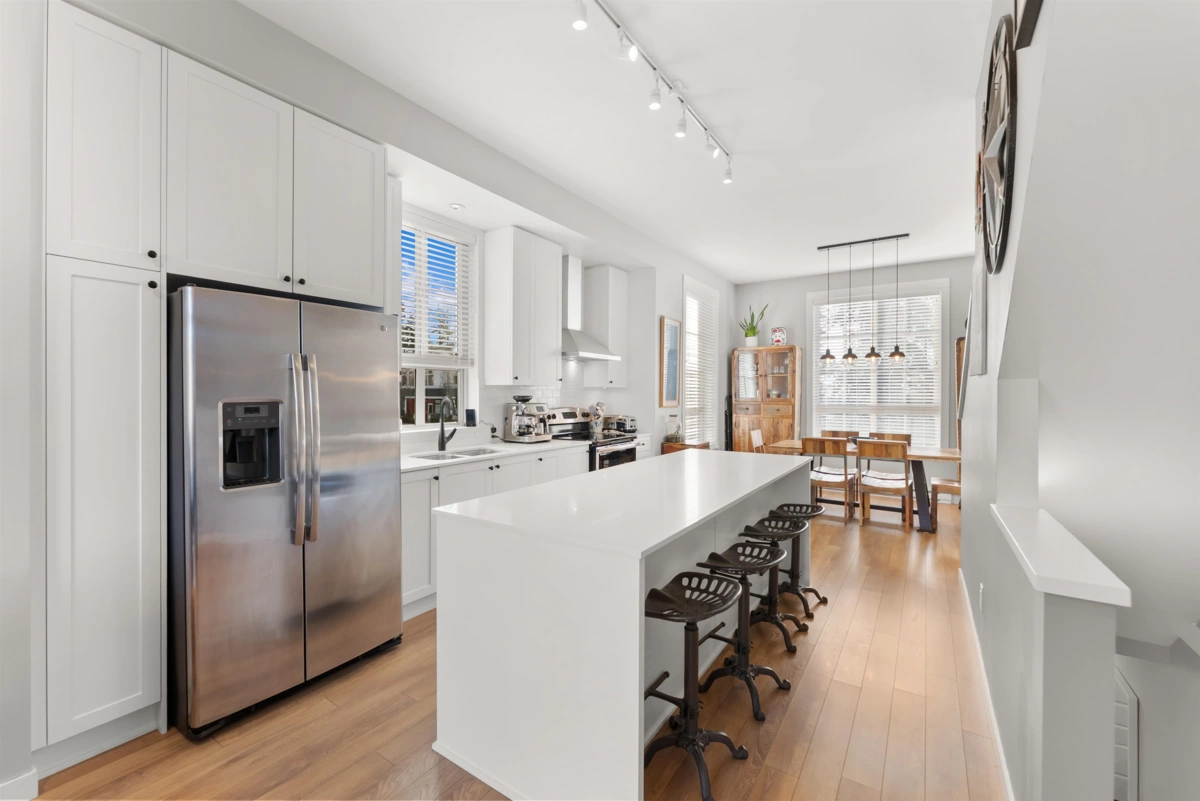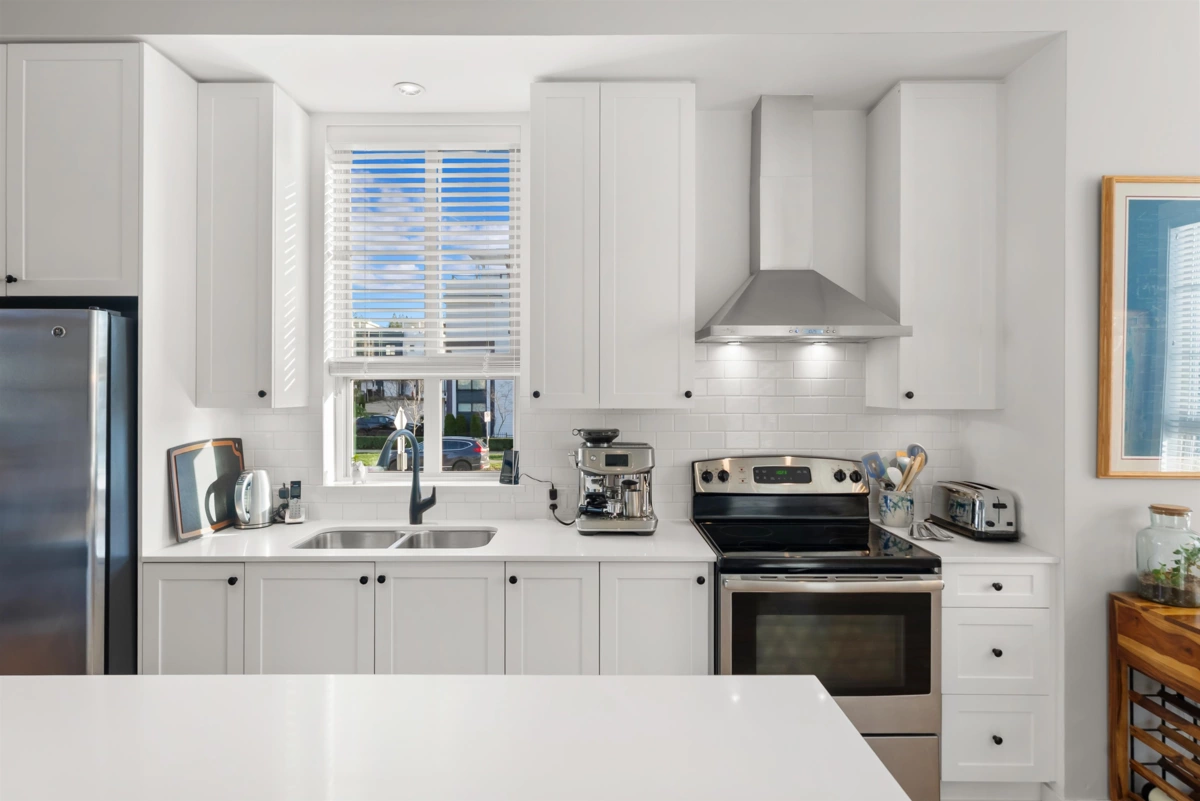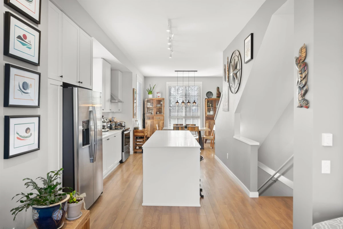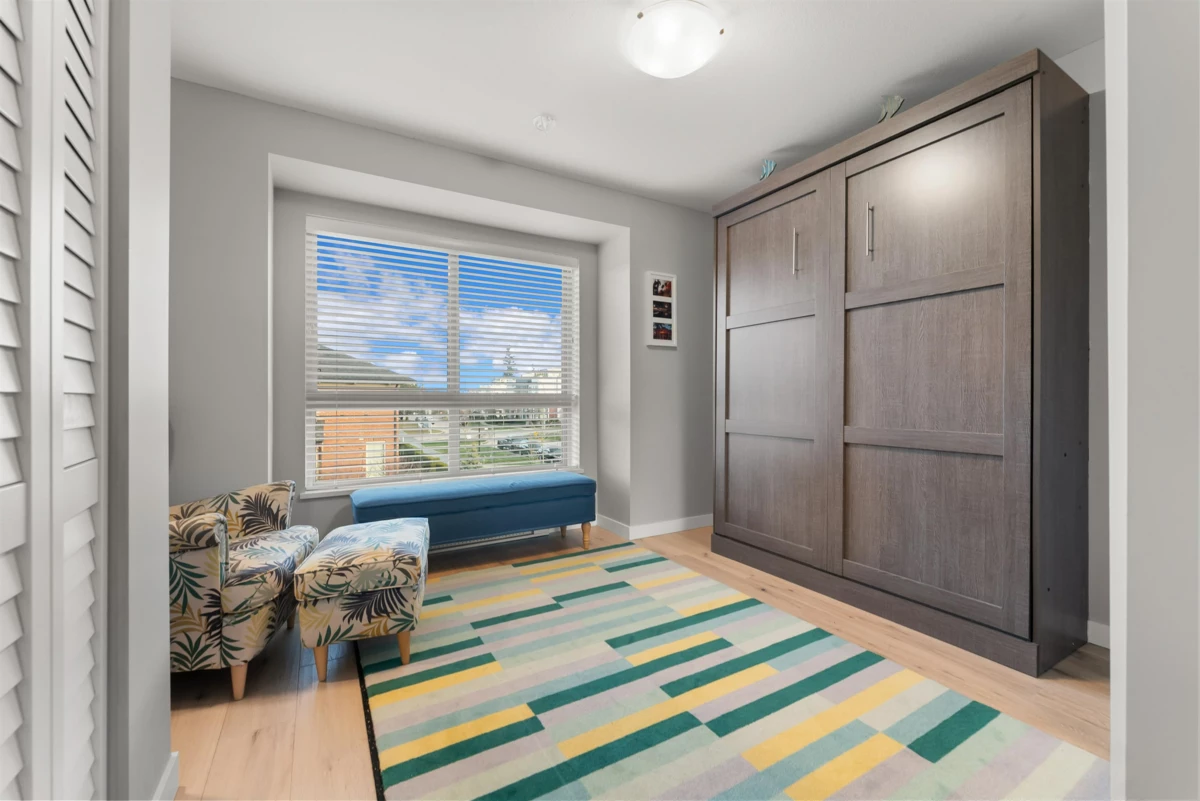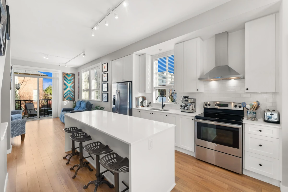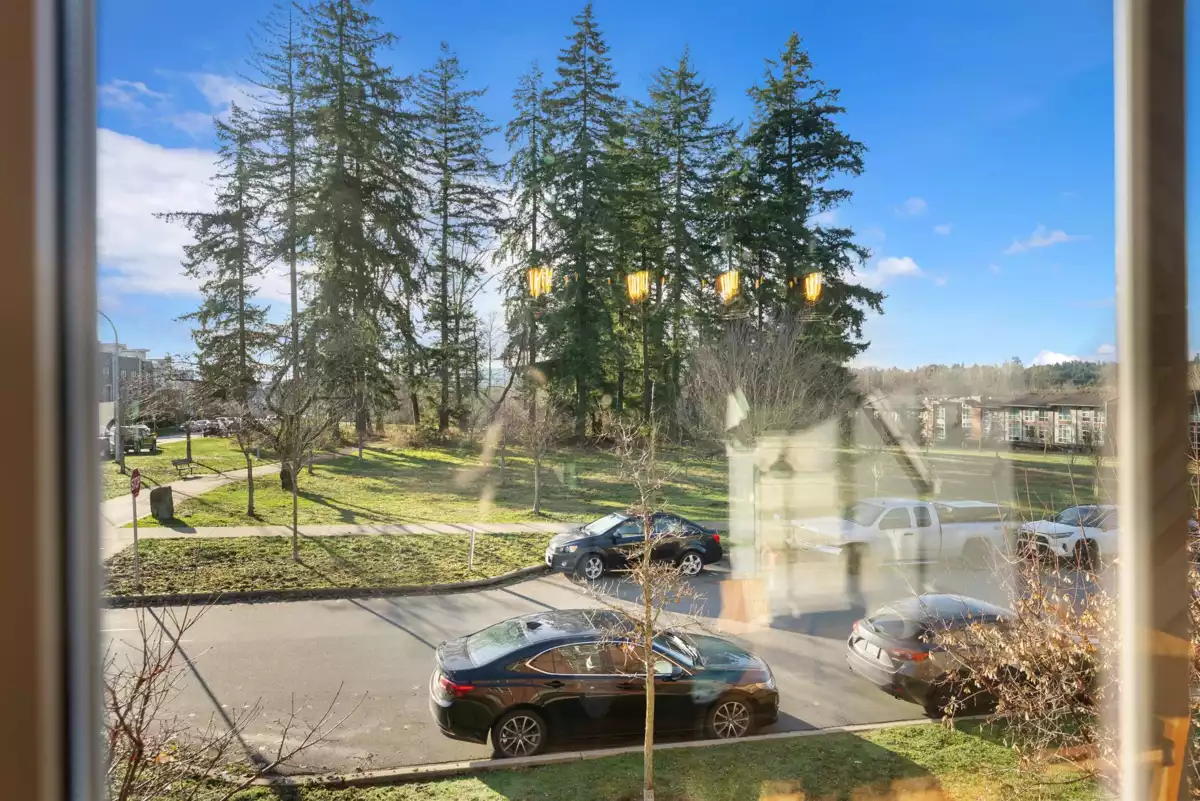 Welcome to this beautifully updated 2 bed+den, 3 bath townhome offering 1,339 sqft of thoughtfully designed living space. This coveted and true end unit overlooks the serene Oak Meadows Park, providing privacy and tranquil views. The open-concept main floor features 10 ft ceilings, an abundance of windows, and exceptional natural light throughout. The modern kitchen is equipped with stainless steel appliances, quartz countertops, and timeless shaker style cabinetry, Upstairs updates include engineered hardwood flooring, custom closet organizers, custom blinds and new closet doors. The versatile den is perfect for a home office or guest space. Enjoy the convenience of being with in walking distance to shopping, restaurants, parks, and everyday amenities, this is townhome living at its best.