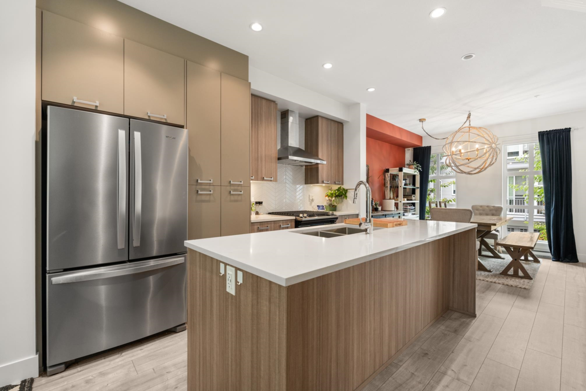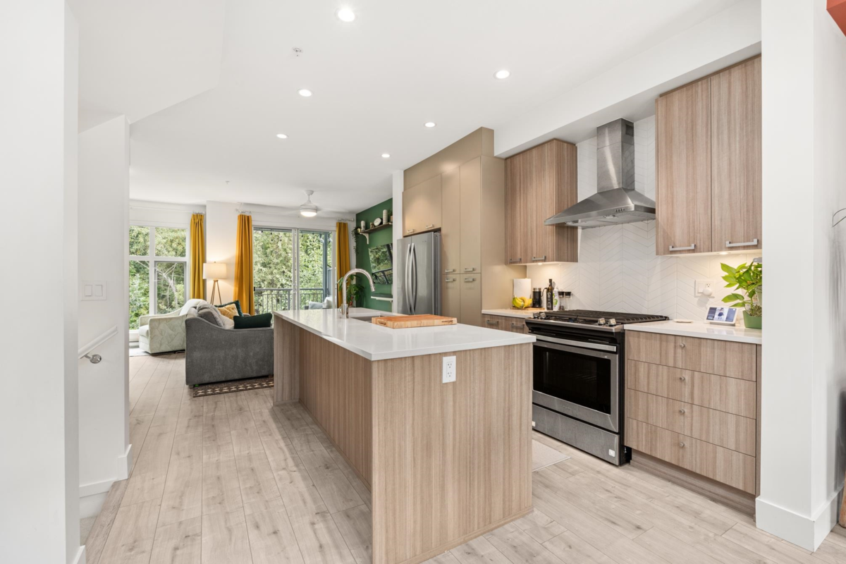 A Must-see at Creekside townhome backing onto greenbelt, built by award winning Streetside Developments. You'll love the full-height windows allowing natural light to brighten up the wide open floor plan. Living room features custom built in cabinets & adjacent office workspace plus east facing deck, overlooking protected forest. Enjoy a BBQ with natural gas hookup. Spacious dining room w/ custom chandelier can host large family gatherings, and the main floor powder room is nicely tucked away for privacy. The Master bedroom features high ceilings, walk-in closet and ensuite with 2 sinks plus an oversized walk-in-shower. The large garage accommodates two vehicles & EV charging, room for a workshop, home gym, or extra storage. Enjoy privacy in the fully fenced yard bordering the greenspace.