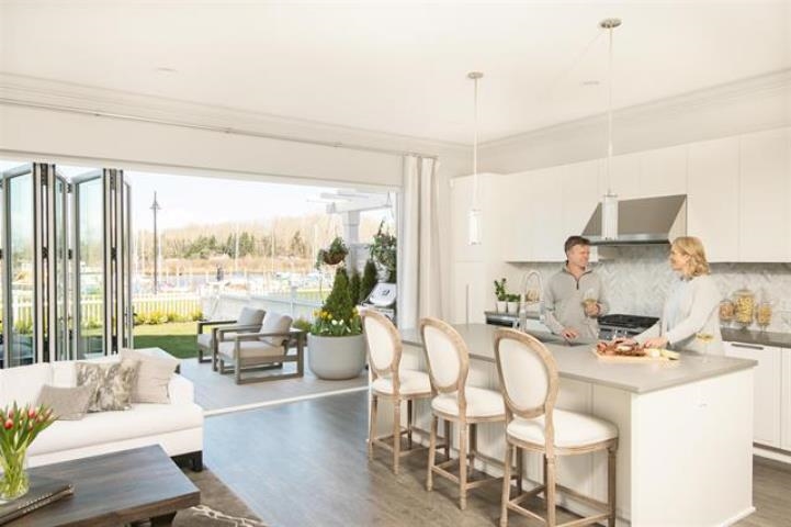 NEW DUPLEX-STYLE WATERFRONT 4 bed, 4.5 bath home apart of Polygon's Marinaside Collection at Westhampton in masterplanned community of Hampton Cove in Ladner. Enjoy 2,720 sq.ft. of living space with overheight ceilings on all 3 levels with beautiful water views. Integrated kitchen appliances includes wine fridge gas chef style range & large central island. Indoor-outdoor living combined with accordion-style doors off the kitchen & living area leading to a spacious patio & fenced yard. Upstairs has a recreation room & a covered deck approx 13x20 with a gas outlet. 4 car parking w/ EV outlet. Air conditioning included! Exclusive access to the Hampton Club - a 12,000 square foot residents-only clubhouse. 10 min to Richmond. visit us at our sales office, daily except Friday 12-6.
