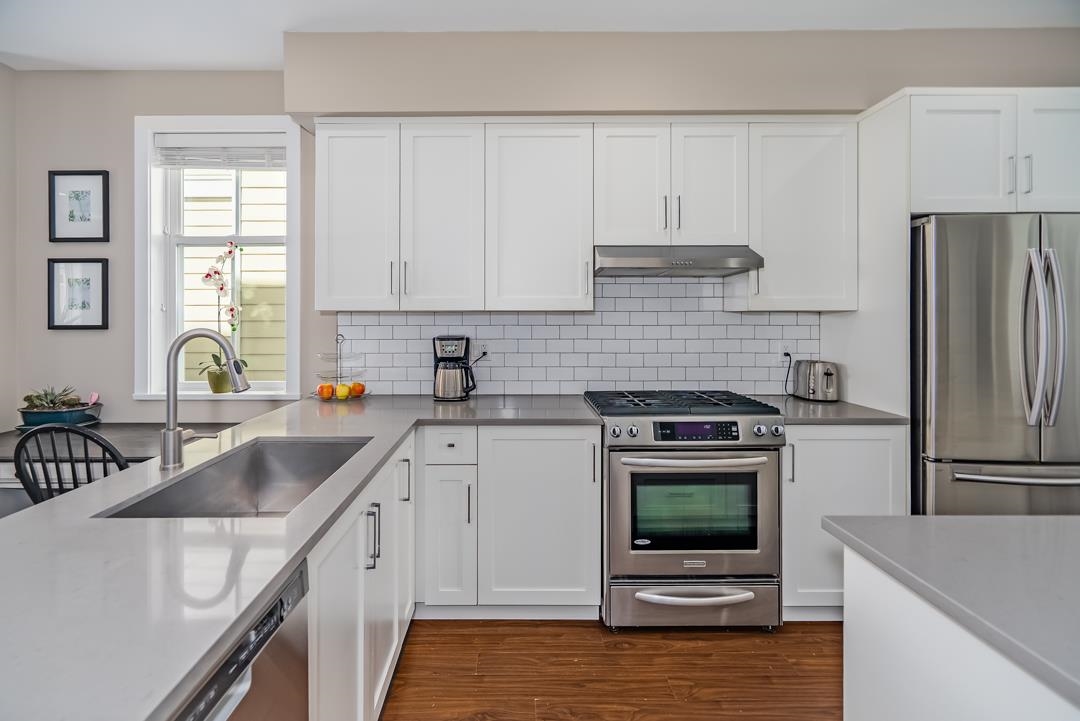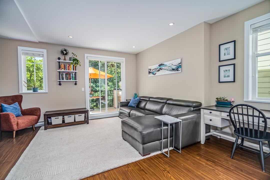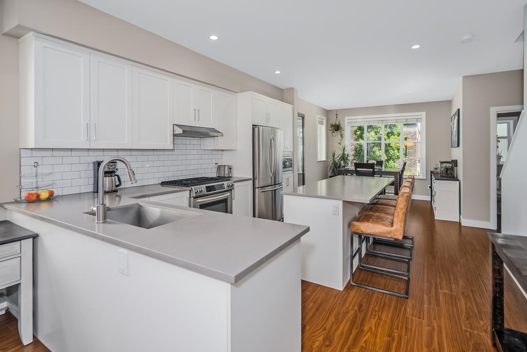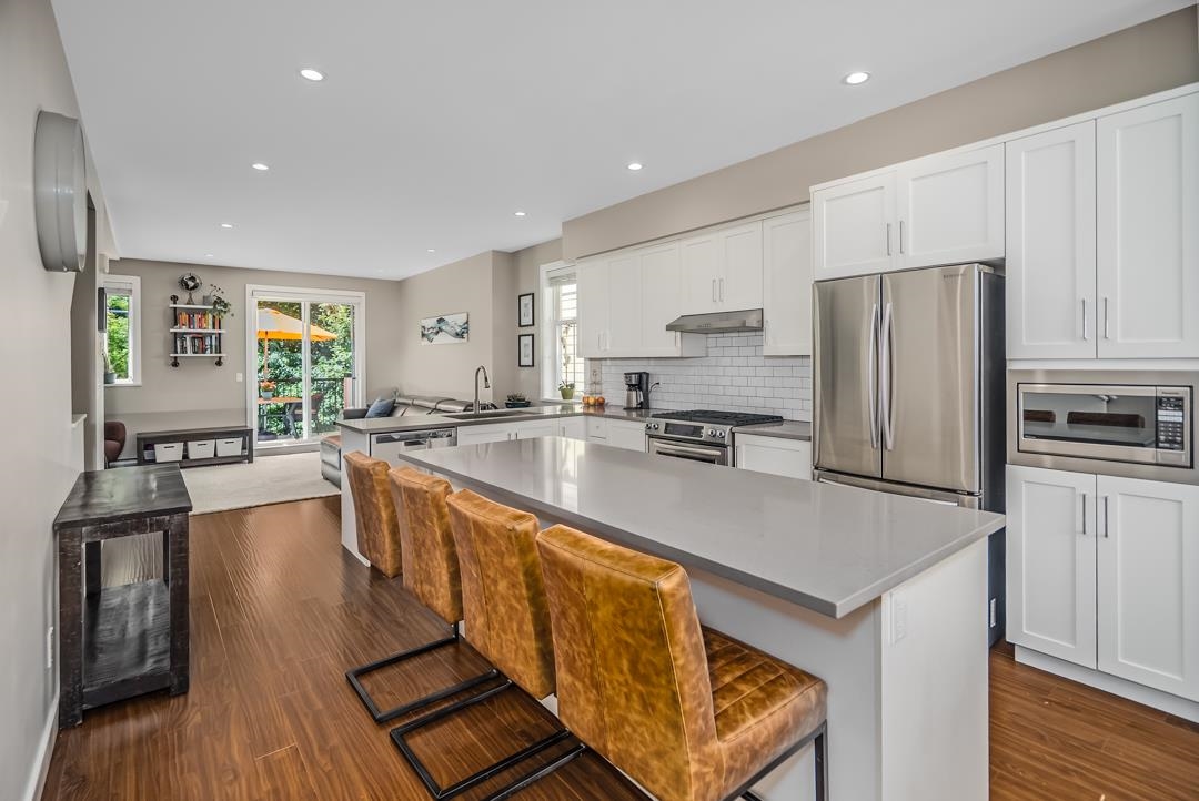 Beautiful end-unit at ‘The Woods’. Stylish 3 bed-3ba townhome offering 1718sf of living space in move-in condition! Enjoy two outdoor spaces—a private balcony off the main level and a huge 400+sf rooftop deck to soak up the sun and enjoy the views of the greenbelt! Entertainment sized kitchen island w/ quartz counters, bar seating, gas range, ample storage and powder room! End unit living offers additional windows on all floors that allow for ample sunlight to shine on in. A unique feature is the rare live/work commercial zoning which allows a legal business from your home or added flex space (gym? office?) with private entry off of garden. Family friendly living set amongst the trees between Grandview and Morgan Creek Golf Course, with easy access to shopping, schools, transit, and HWY 99