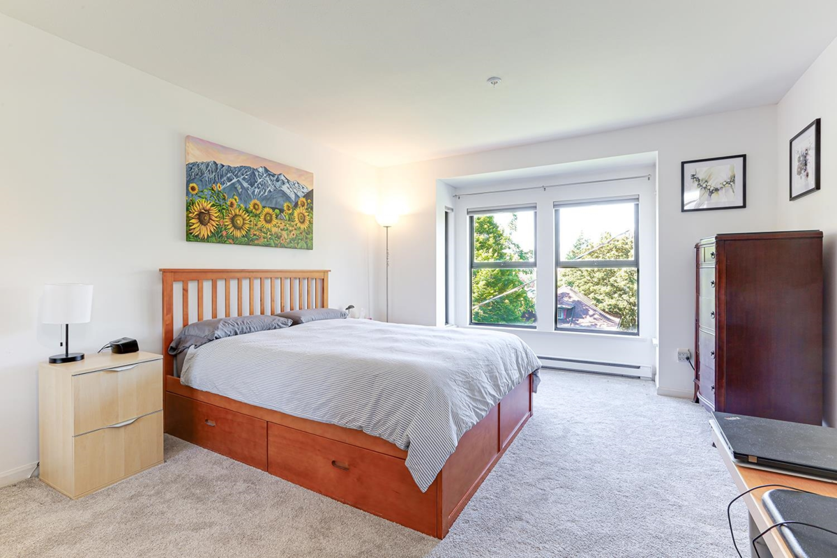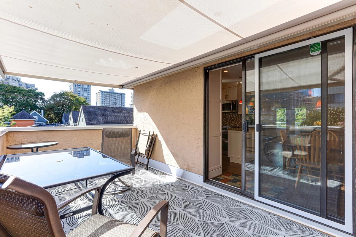 Penthouse that feels like a house! Bright & spacious 2 bed, 2 bath with windows on all sides and no shared walls—breezes and treed views in every room. Living room features hardwood floors, gas fireplace and French doors to a NW balcony. Large kitchen with white shaker cabinets, granite counters and new induction stove w/ double oven opens to a South East sundeck (15'3" x 8'8") with BBQ space, patio set and powered awning. Stairs to garden & planters. New carpet in bedrooms, heat pump (2021), roof (2017), in-floor radiant heat in both baths and entry. In-suite laundry, 1 parking, locker, 1 cat & 1 dog allowed. Prime West End—steps to Robson Street, schools, Nelson Dog Park, minutes to Stanley Park & English Bay, across from Barclay Heritage Square. Call your REALTOR. to view.