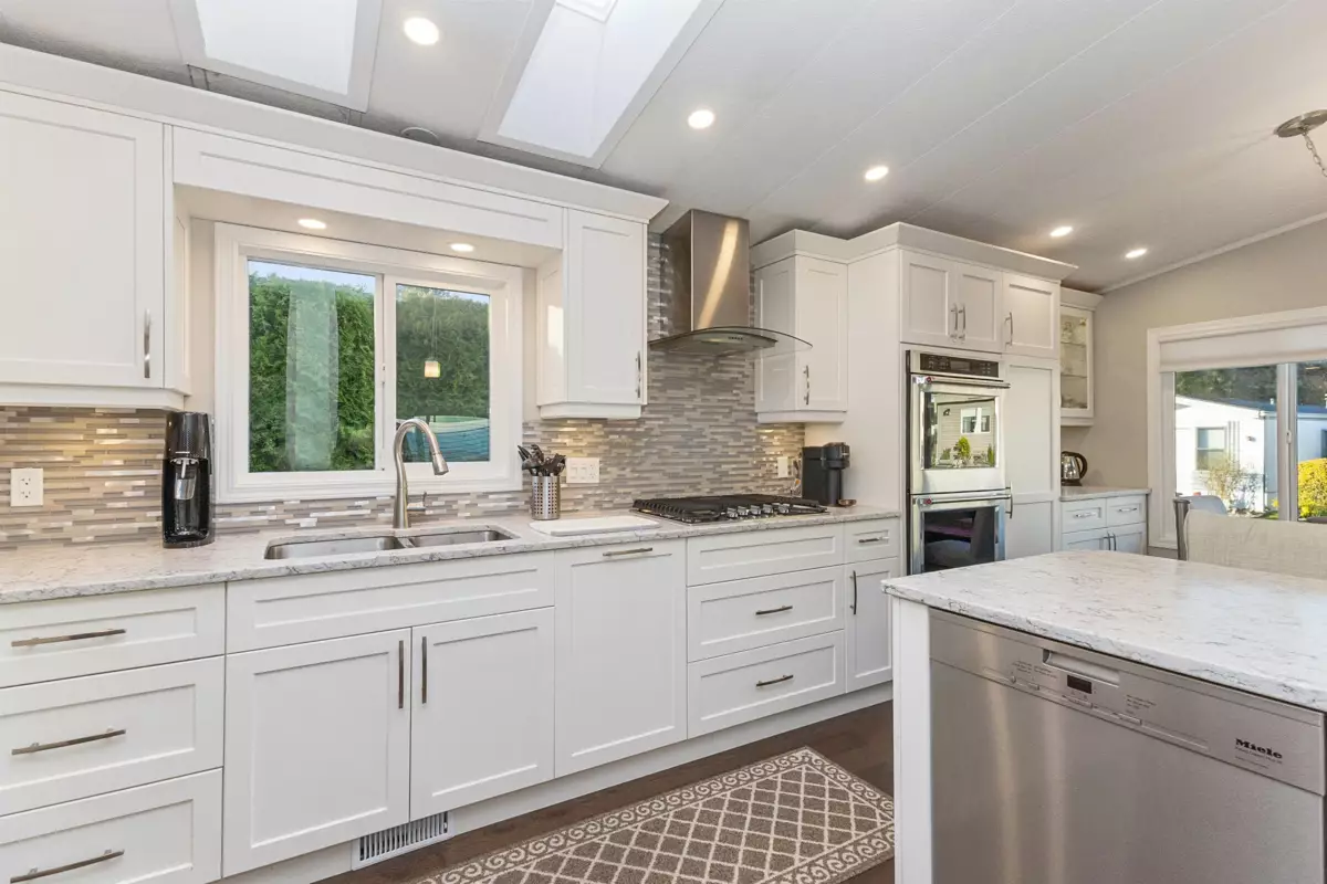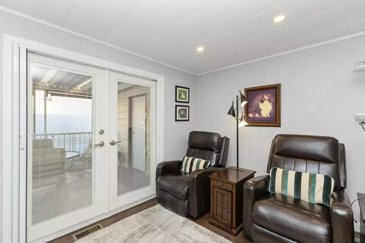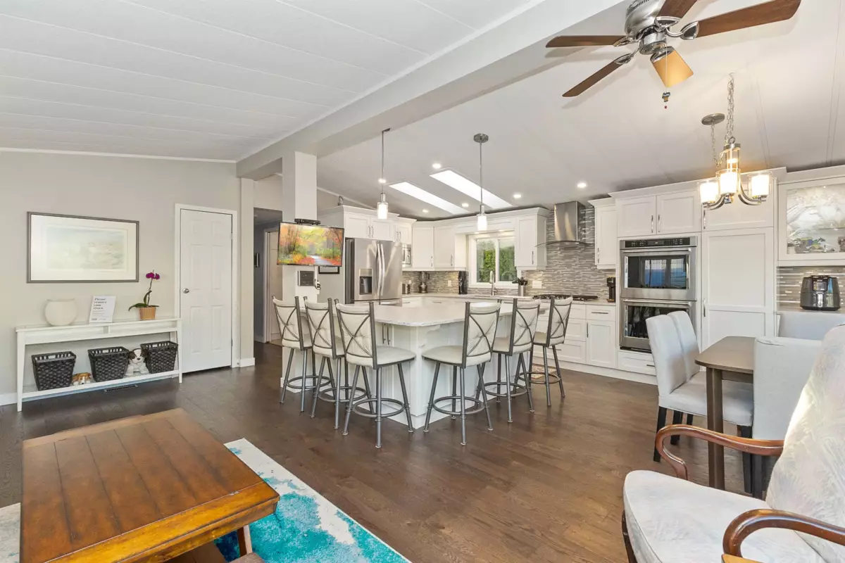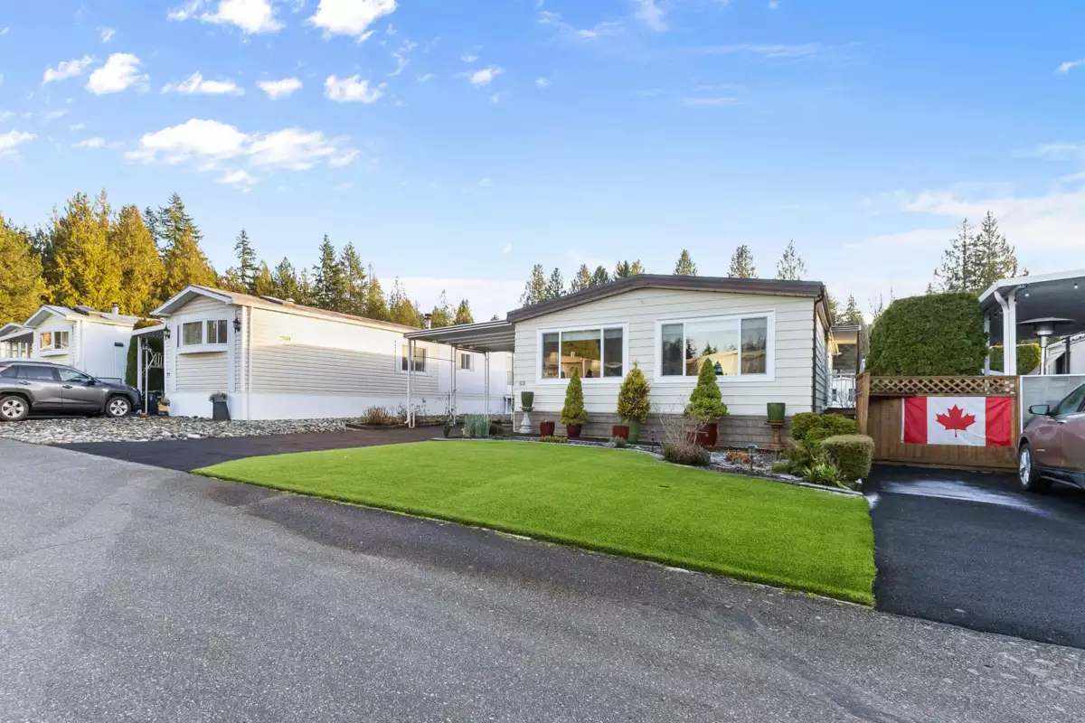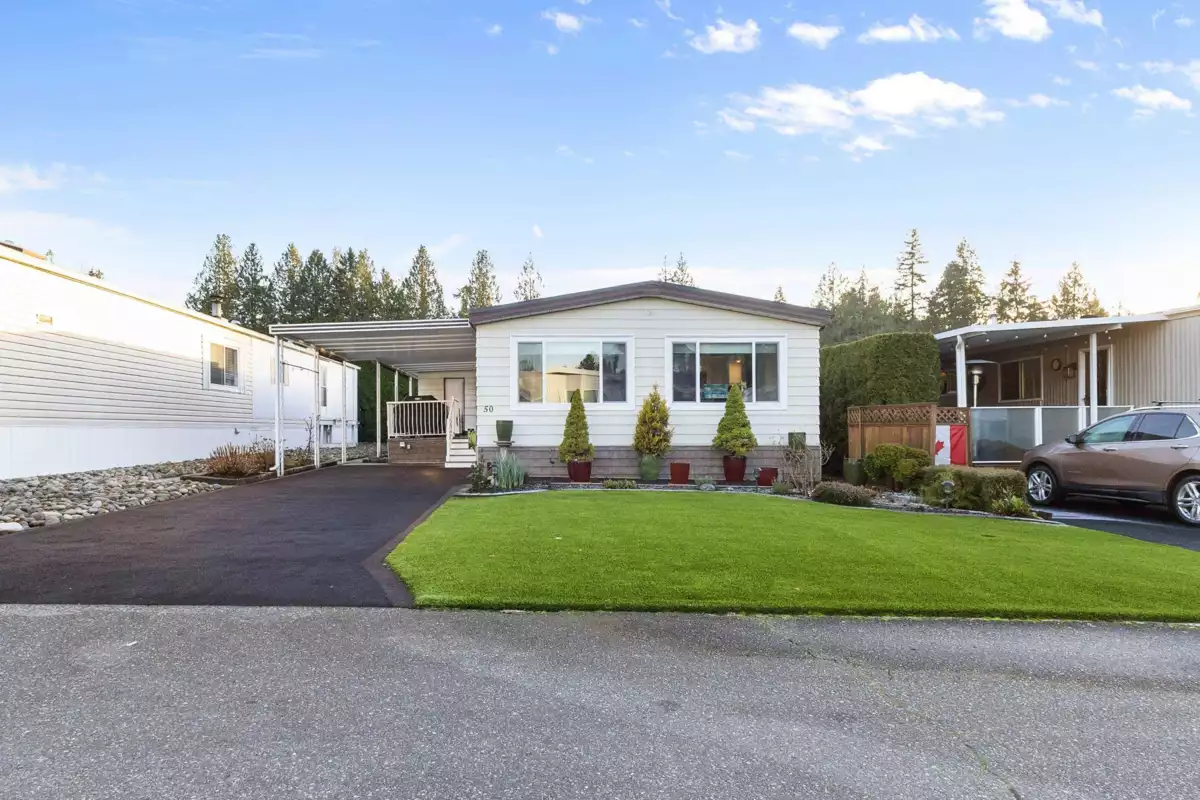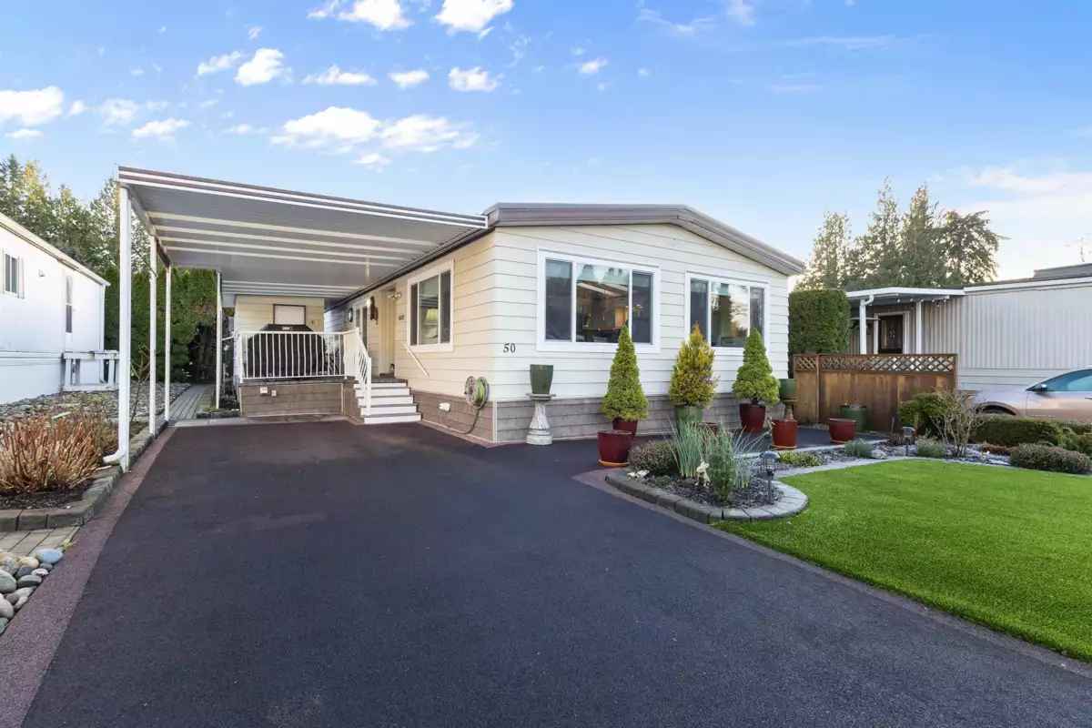 YOU'LL BE GLAD YOU FOUND THIS HOME..! #50 Deer Creek Estates: EXTENSIVELY RENOVATED from top to bottom! FEATURES; Air conditioning, newer furnace, flooring, roof, windows (some w/remote controlled blinds), luxury bathrooms with low-step shower stall and a walk-in hydro tub in ensuite (from the large Primary suite). Fantastic kitchen with built-in ovens, top of the line appliances, Quartz Silestone counters, beverage station, pull-out draw pantry and entertainment-sized island (w/storage) combining living and dining areas seamlessly. Large den w/french doors (integral blinds). Laundry with sink, storage and side access. Covered balcony with nat-gas bbq hookup. Two sheds w/power! New driveway and lawn for year-round curb-appeal! Allowed: 1 pet 14" / 12lb. +55yr owner. +17yr owner children.