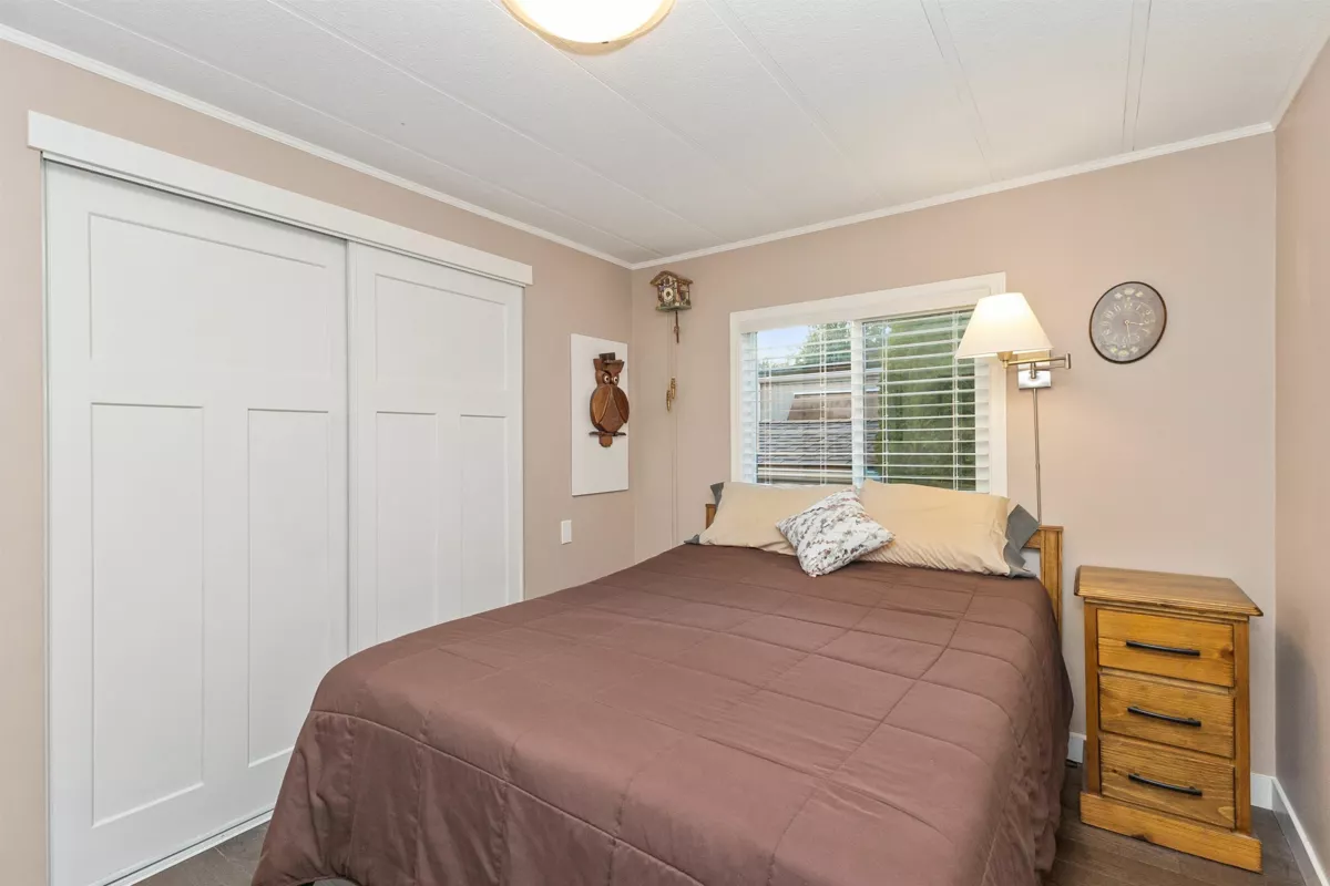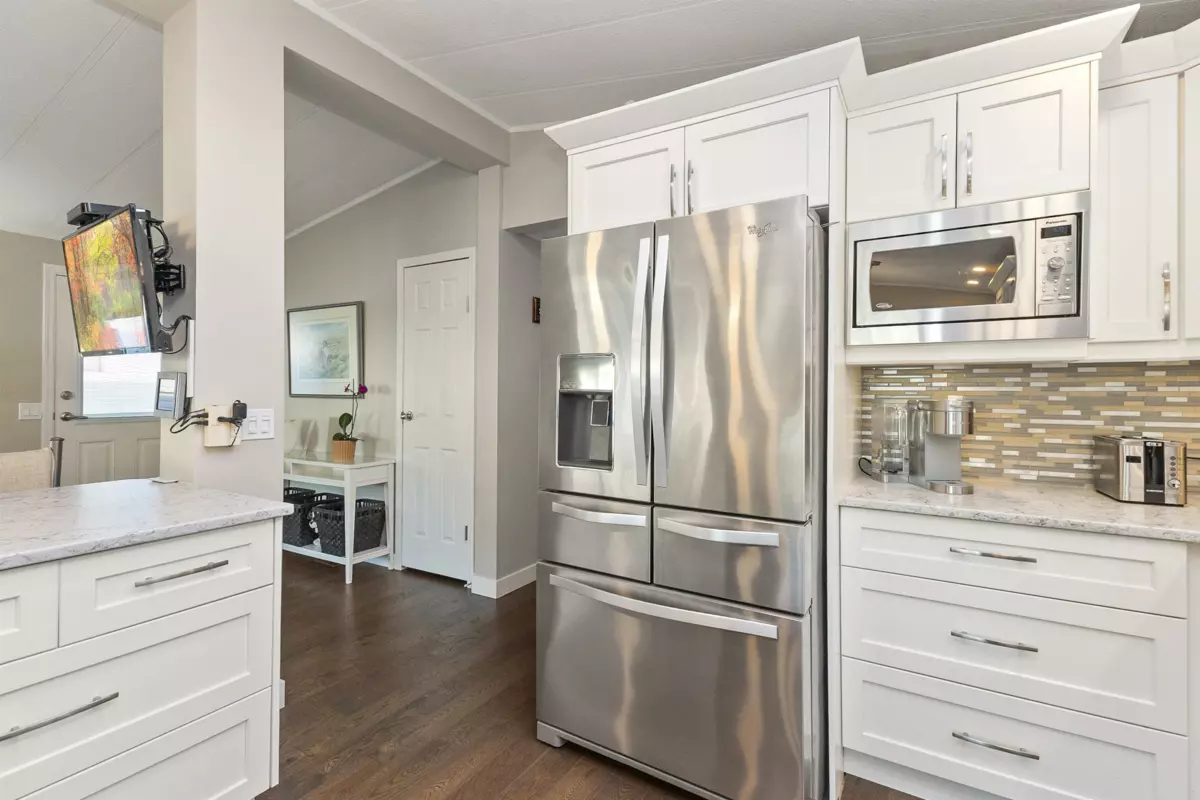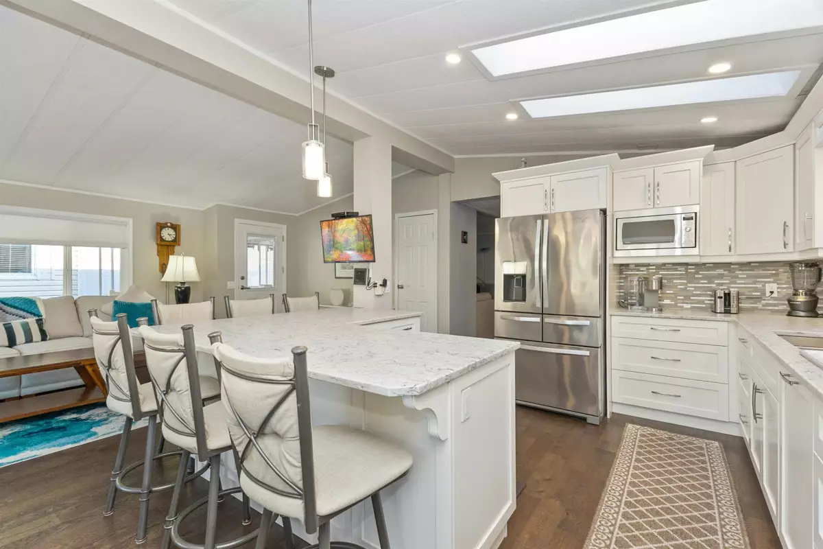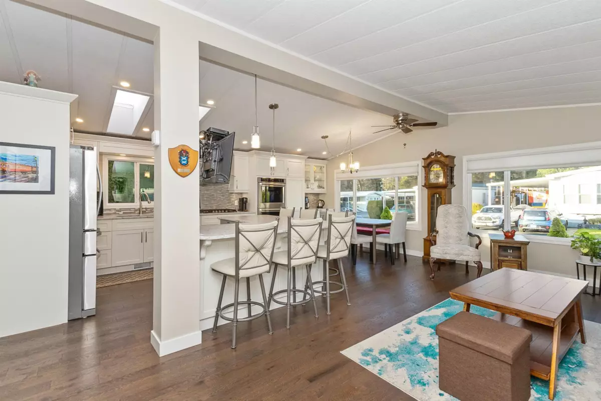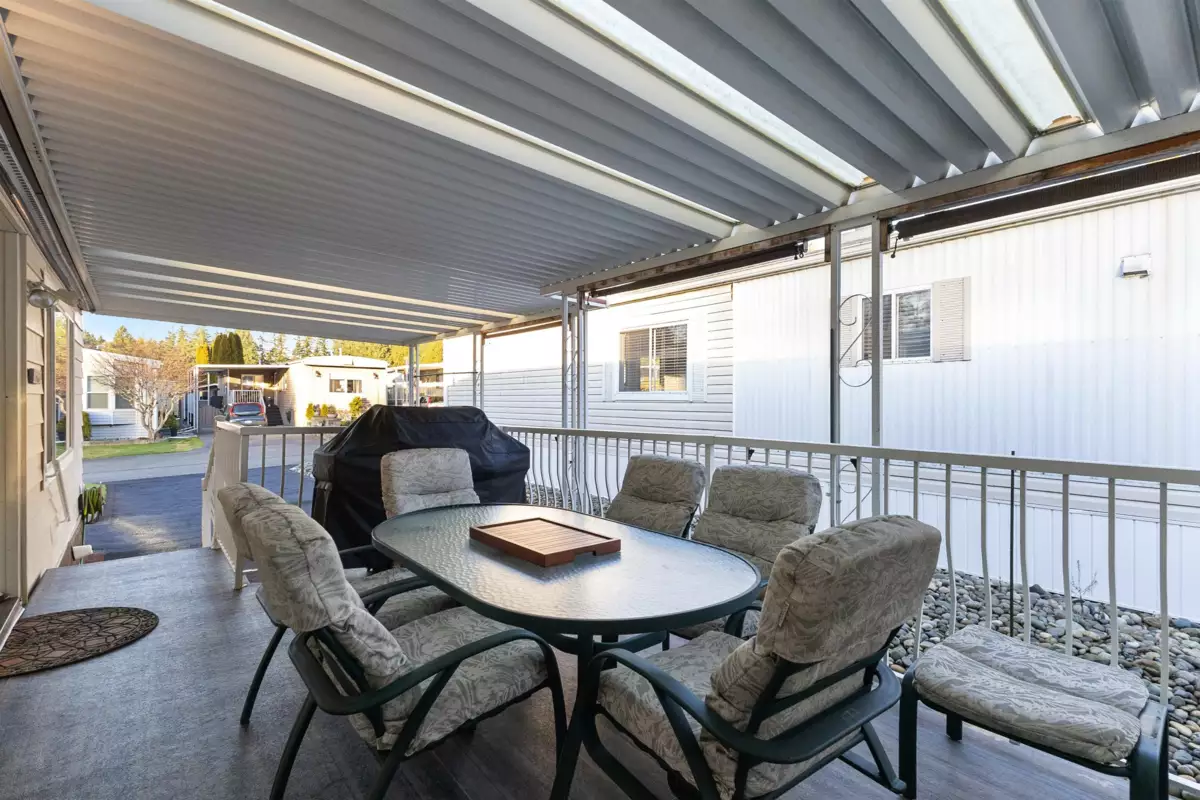 YOU'LL BE GLAD YOU FOUND THIS HOME..! #50 Deer Creek Estates: EXTENSIVELY RENOVATED from top to bottom! FEATURES; Air conditioning, newer furnace, flooring, roof, windows (some w/remote controlled blinds), luxury bathrooms with low-step shower stall and a walk-in hydro tub in ensuite (from the large Primary suite). Fantastic kitchen with built-in ovens, top of the line appliances, Quartz Silestone counters, beverage station, pull-out draw pantry and entertainment-sized island (w/storage) combining living and dining areas seamlessly. Large den w/french doors (integral blinds). Laundry with sink, storage and side access. Covered balcony with nat-gas bbq hookup. Two sheds w/power! New driveway and lawn for year-round curb-appeal! Allowed: 1 pet 14" / 12lb. +55yr owner. +17yr owner children.