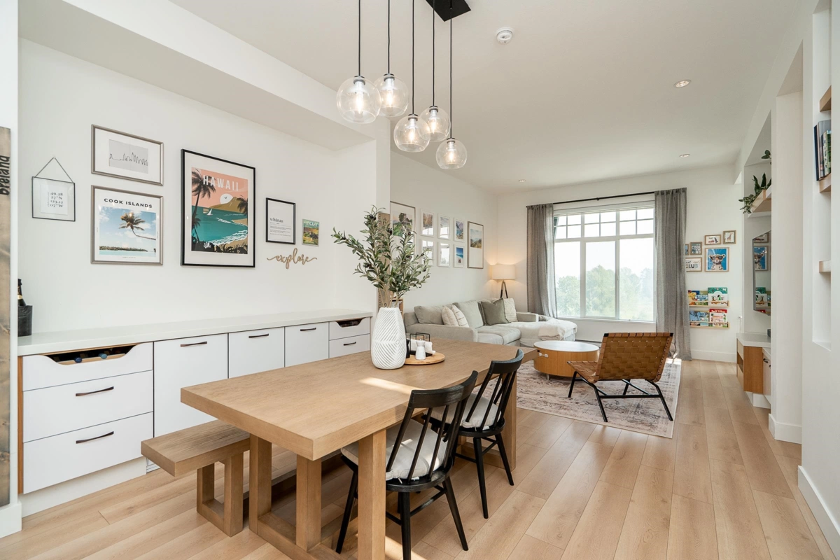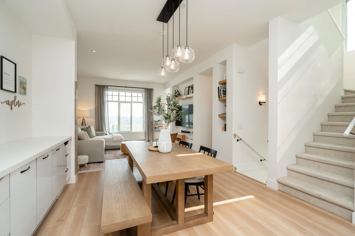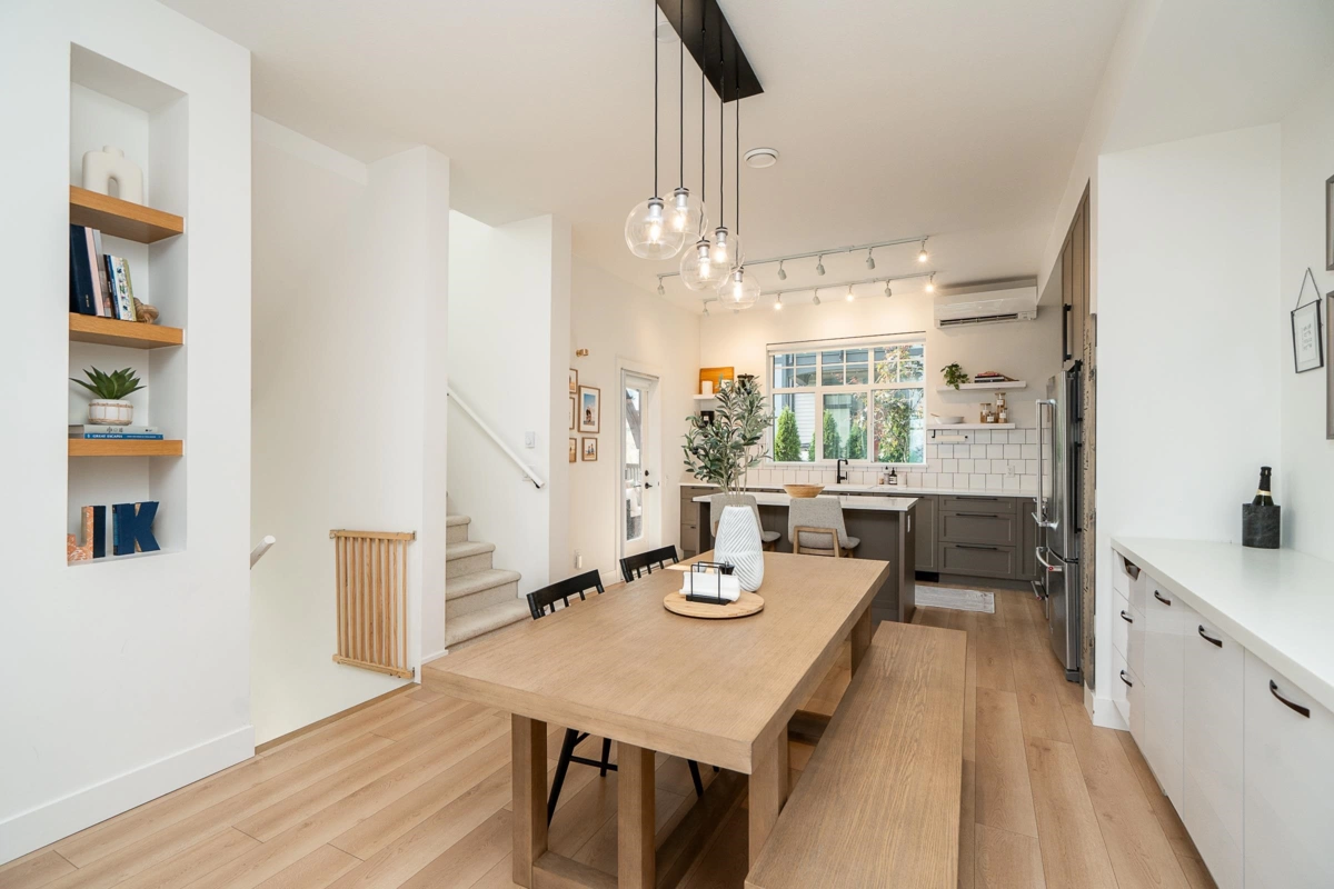 STUNNING Corner home at Victoria by Mosaic! This AIR-CONDITIONED 4 bed + den, 4 bath home offers 1,803 sq ft of modern and functional living. Extensive custom millwork w/display shelving and integrated storage throughout creates a cohesive design. The main features an open-concept plan w/a spacious kitchen offering endless cabinetry, large island, and direct access to a walk-out backyard with extended patio. Dining area flows into a generous living room, complemented by a private den ideal for a home office. Expansive SE facing views! Up are 3 beds, primary w/custom closets, while lower level offers a flexible rec room or 4th bed. Complete w/a finished double side-by-side garage plus 2 additional driveway spots. Steps to trails, parks and a short drive to schools, shopping + amenities.