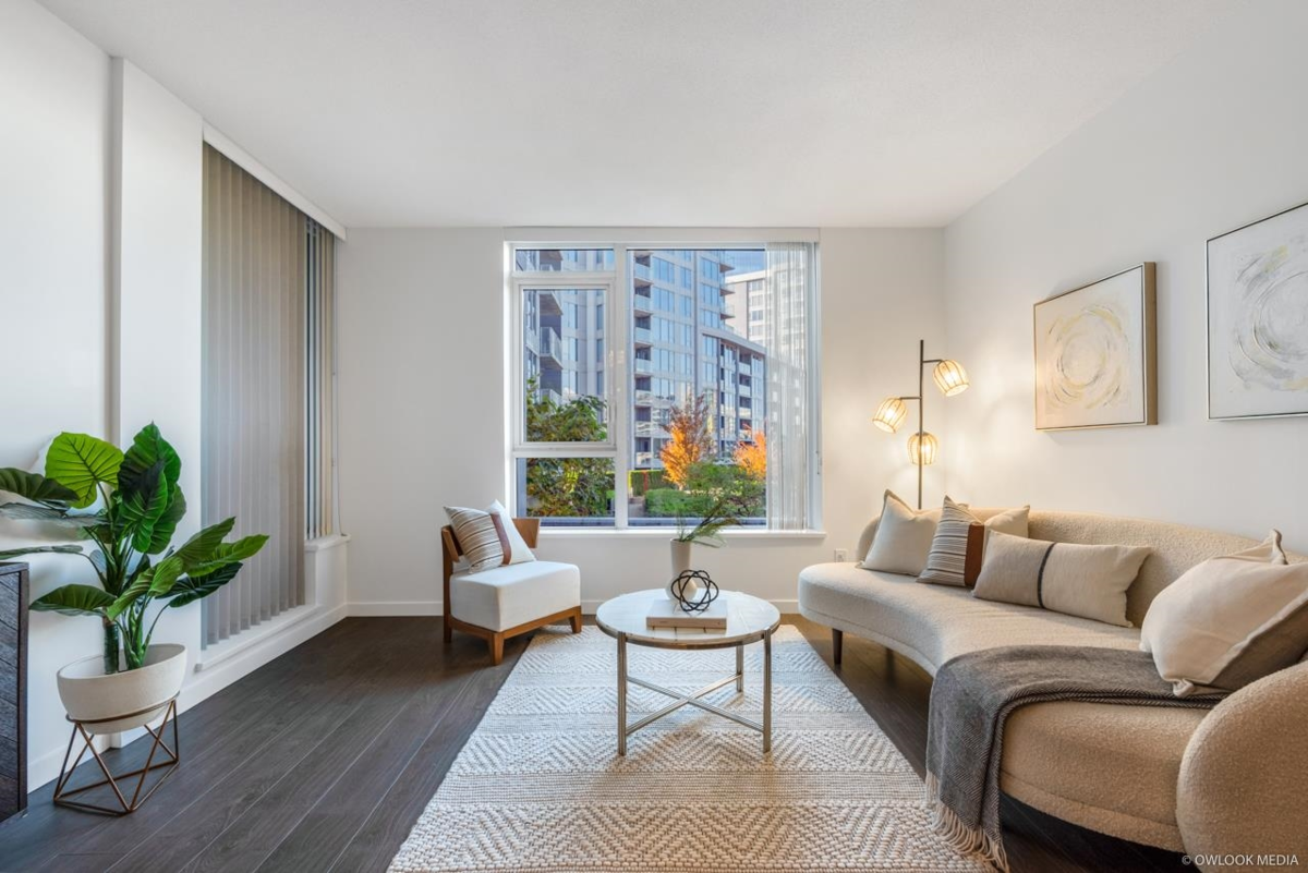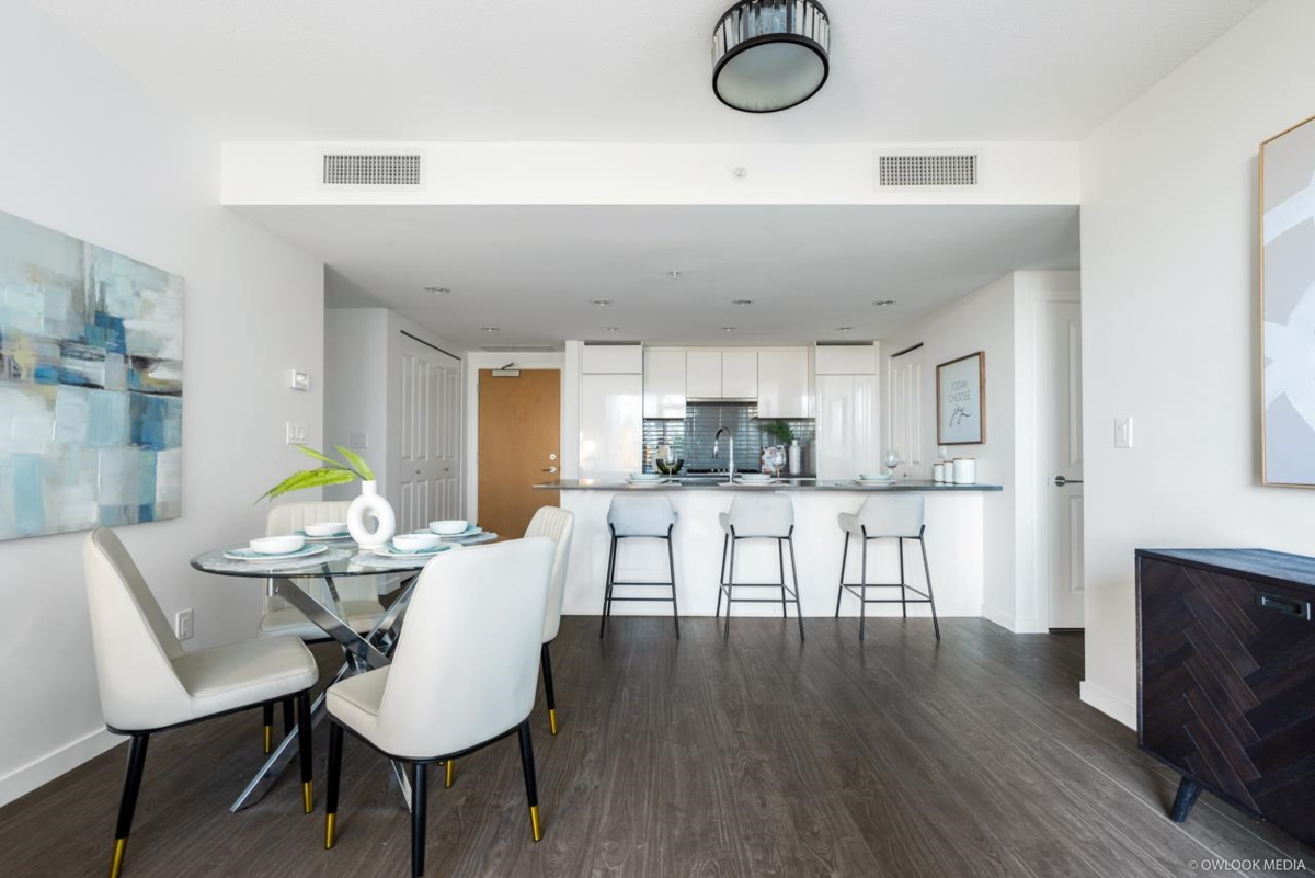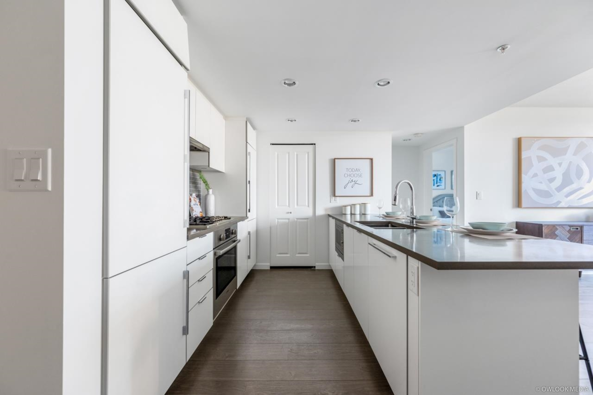 Avanti by Polygon. This home is two separated bedrooms and a den to maximize privacy. The kitchen is outfitted with sleek cabinetry, smooth engineered stone countertops and integrated Bosh appliance. Restaurant, Shopping and transit just steps away , a 4.2 acre urban park next door. Walk to Aberdeen Station in less than 5 minutes. A must see!