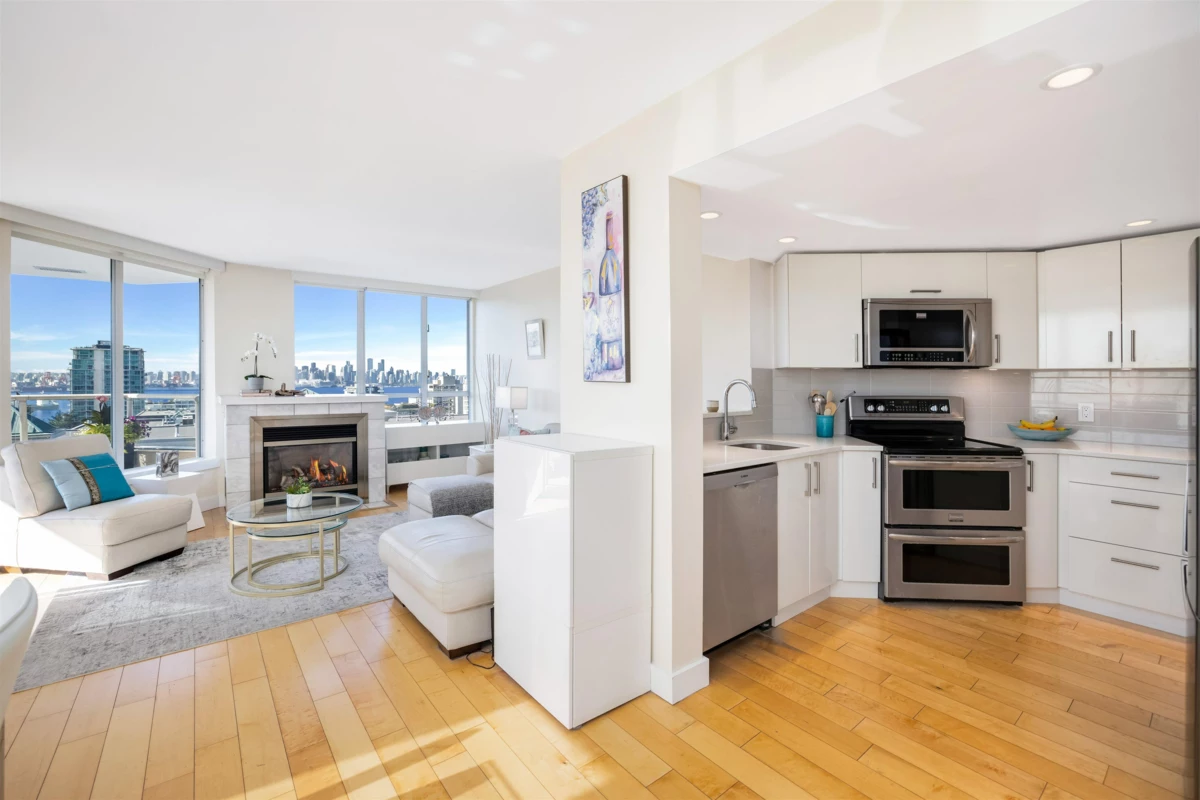 Just move right in to this stunning, 1000 sf FULLY RENOVATED suite located in a Lower Lonsdale CONCRETE tower! Positioned on the QUIET side of the building, this unit has unobstructed PANORAMIC VIEWS of the City and water. Enjoy your morning coffee on your large, south facing patio which enjoys full sun, beautiful mountain views and the perfect seat for sunset. The open concept interior is fully renovated with white marble bathrooms, a large soaker tub, bright contemporary kitchen and timeless maple hardwood floors. The floor to ceiling windows are located in every room and there is a cool cross-breeze that flows through the space on hot summer days, keeping it cool. The building is very well maintained and offers underground parking, a guest suite/secure bike storage and storage locker!