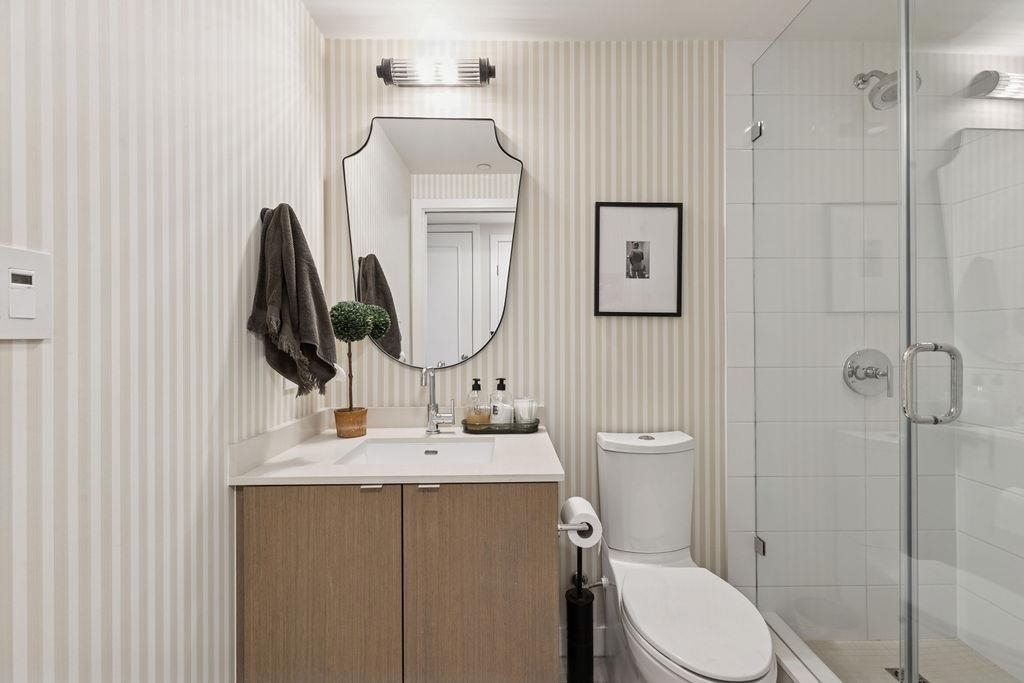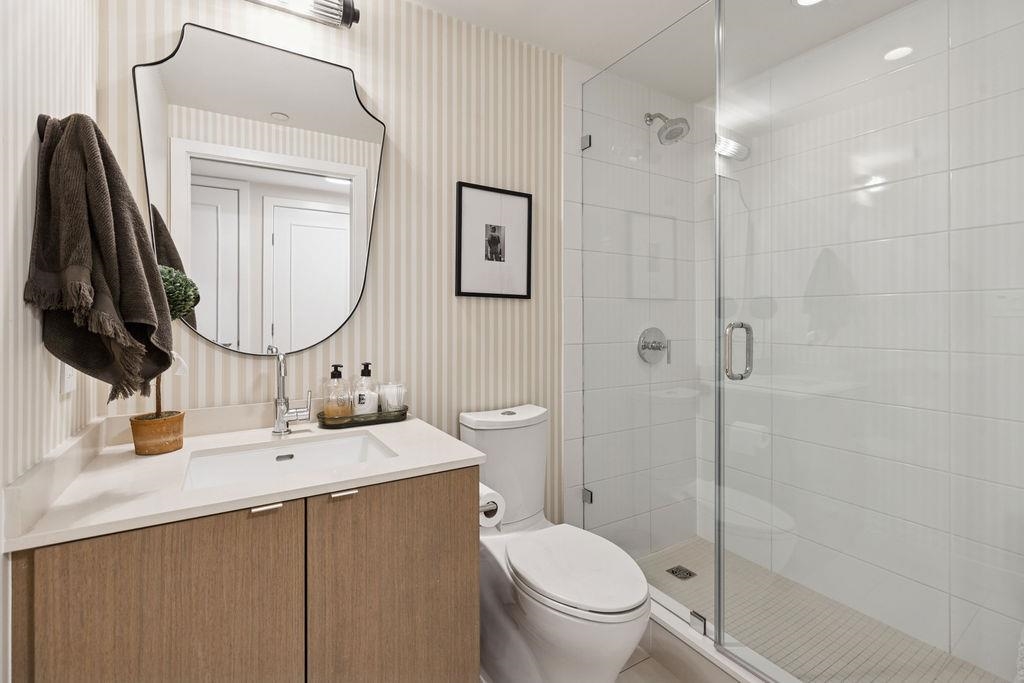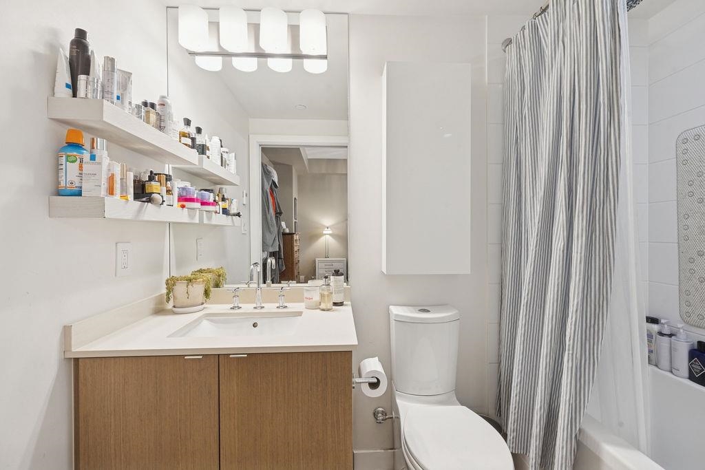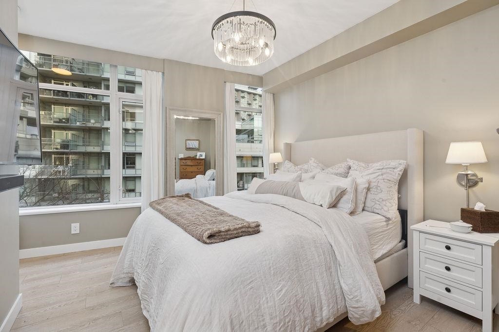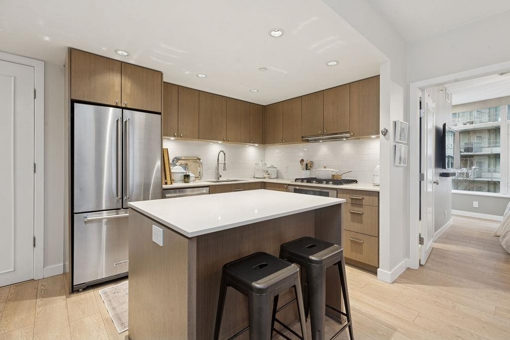 CORNER UNIT with AC! Block 100 by Onni. Spacious 2 bed 2 bath+DEN + FLEX. Full size kitchen w/island, ample storage, luxury s/s appliances including 5 burner gas cooktop. Updates to the home including custom millwork, new title in the office, a built-in bar with wine fridge, updated kitchen hardware, a tile backsplash, and paneling throughout the living spaces and entryway. Radiant heated bathroom floors. Excellent amenities with well equipped gym, rooftop garden, entertainment party rooms & concierge services. Popular location offering all the conveniences of Mount Pleasant and Olympic Village. Easy access to seawall,skytrain & downtown. Large in-suite storage, 1 storage locker and 1 EV parking. Home featured in Western Living & Vancouver Magazine. Short term rental allowed.