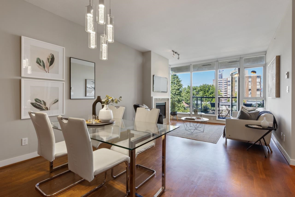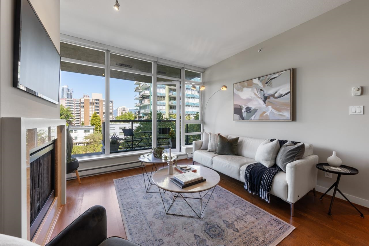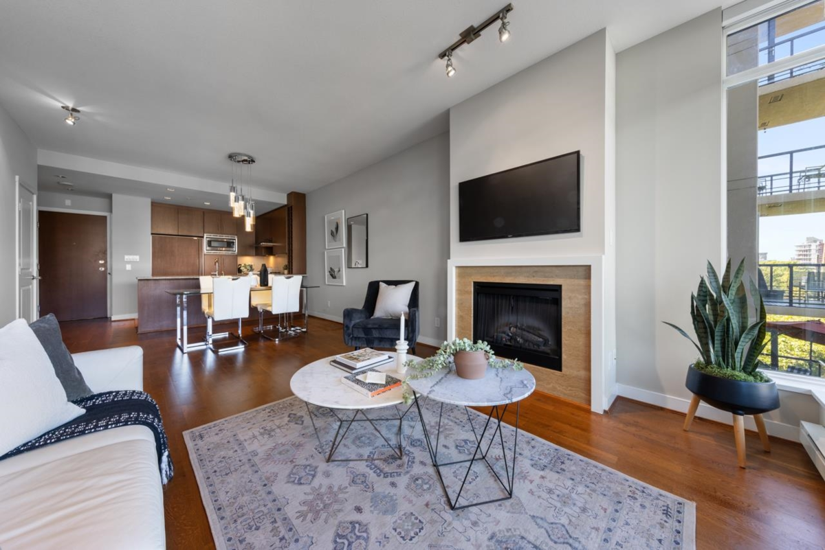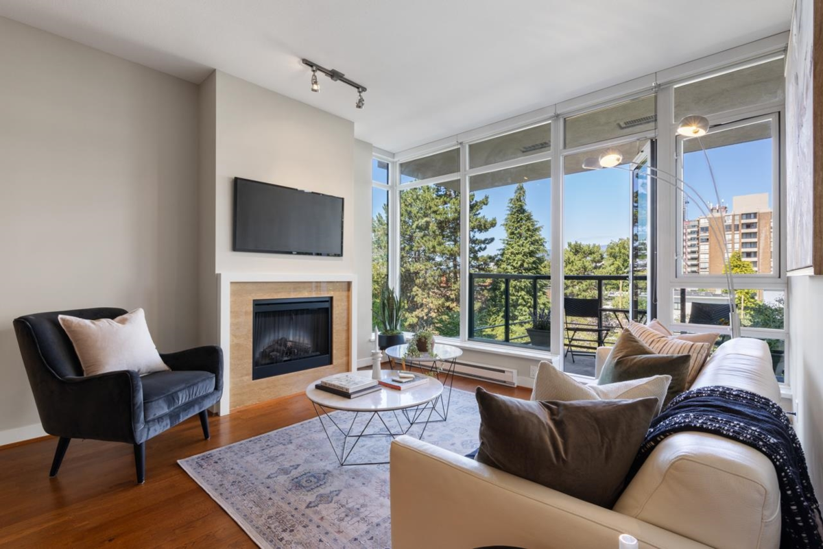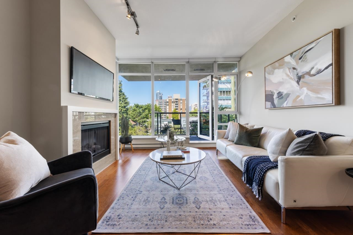 An ideal 2-bedroom, 2-bathroom home in the esteemed Avedon Building by Polygon. Nestled in a peaceful location, this high-end concrete building features just 4 units per floor & is meticulously maintained, including its surrounding gardens. Inside, you'll find a spacious open kitchen, living, & dining area complemented by floor-to- ceiling windows that flood the 9ft high ceilings w/ natural light offering northerly views + cooling exposure & incl. a private patio perfect for enjoying a morning coffee. The home features a large primary bedroom w/ a walk-in closet & ensuite bathroom. A good sized second bedroom. Situated on a quiet, traffic-controlled street, this oasis is just steps away from Granville Shops, Van Lawn Tennis Club, & Transit offering excellent walkability. 1 parking.