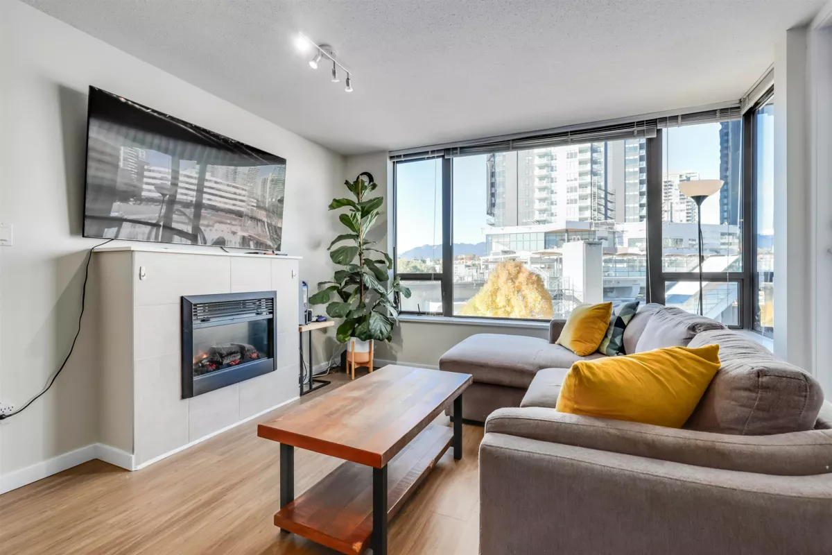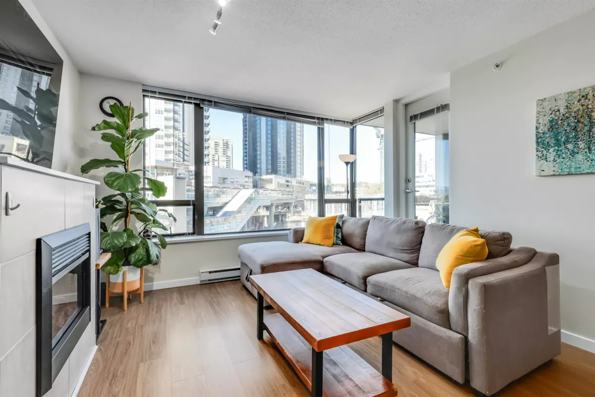 Spacious, bright, and meticulously maintained 1-bedroom, 1-bath unit in the popular Tandem building. The kitchen features stainless steel appliances, a built-in custom pantry, and an open-concept layout, perfect for hosting gatherings. During winter, unwind by the cozy fireplace or relax in the updated soaker tub with new tile surround. Enjoy the covered balcony with lovely mountain views year-round. This recently painted unit boasts updated laminate flooring and is conveniently located with easy access to schools, Gilmore Skytrain, and a short stroll to the Amazing Brentwood, restaurants, grocery stores, cafes, and more! Tandem's exceptional amenities include a spacious party room, fitness center, playground, sauna/steam room, and hot tub! By appt 24hrs notice for showings