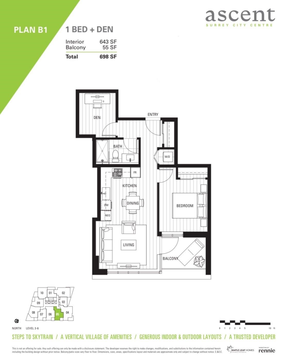 Discover the best value for a brand-new 1BR + DEN/*DEN CAN USE AS as 2nd bedroom in a concrete high-rise at Ascent in North Surrey, This 643 sq. ft. unit features an open-concept floor plan, laminate flooring, and air conditioning. The kitchen includes quartz countertops, soft-closing cabinets, stainless steel appliances (gas cooktop, integrated fridge, dishwasher, microwave, and wall oven). The bathroom offers white marbled quartz and a soft-closing vanity. Enjoy amenities like a gym, lounges, playground, dog run, and rooftop. Walking distance to Surrey Central SkyTrain, shopping, restaurants, and university campuses. Includes 1 parking (#160) P4& 1 storage locker (P1-29). //OPEN HOUSE SUNDAY MAY 4 3-5PM
