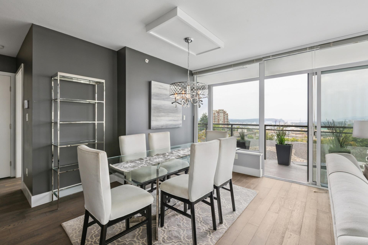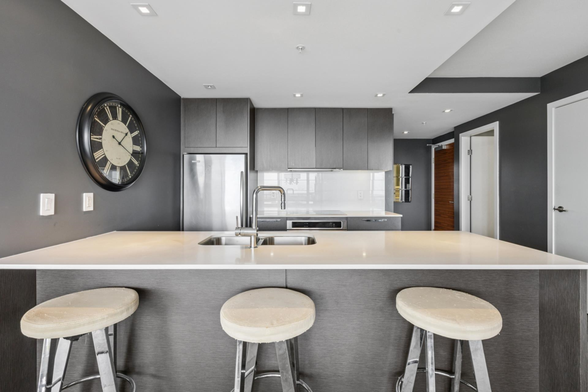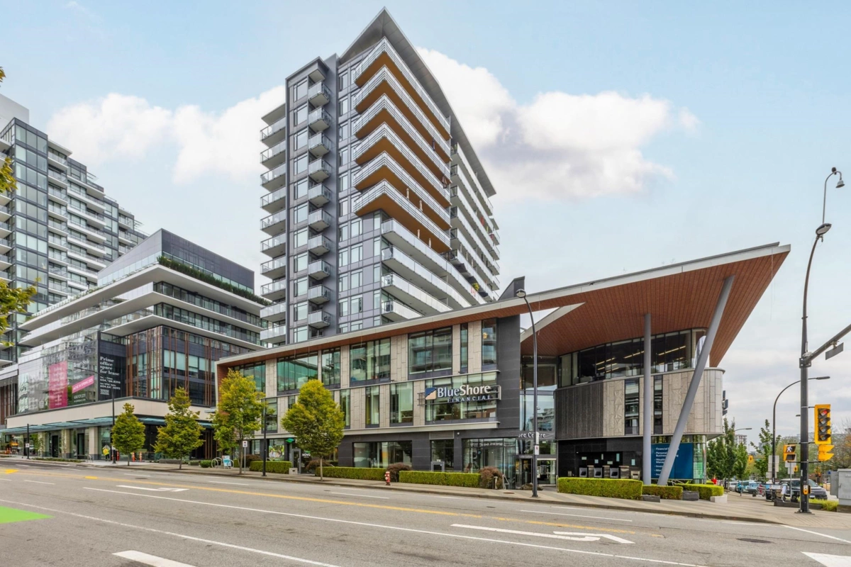 Bright 2-bed, 2-bath corner suite at The Prescott offering 944 sq/ft of interior space and a 244 sq/ft balcony with stunning city, bridge, & mtn views. Located in the heart of Central Lonsdale—steps to Whole Foods, shops, cafes, transit, and more. Floor-to-ceiling windows fill the home with natural light, while the modern kitchen features quartz counters, KitchenAid appliances, and a large peninsula with bar seating. The open living/dining area includes eng. hw floors & an electric fireplace. Bedrooms are well-separated; the primary has a walk-to-wall closet & 4-pce ensuite w/ double sinks. Additional features: guest bath with soaker tub, in-suite laundry, 1 parking, storage, bike room, and access to a gym & dog wash. Well-regarded building in a prime central location.