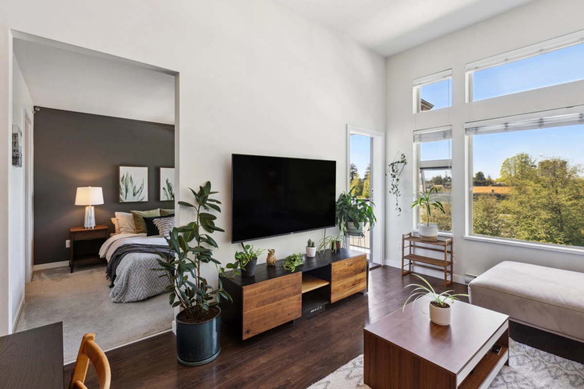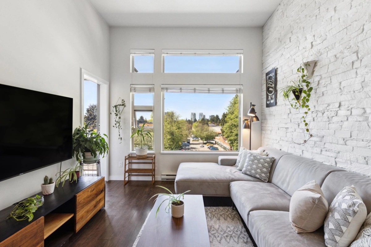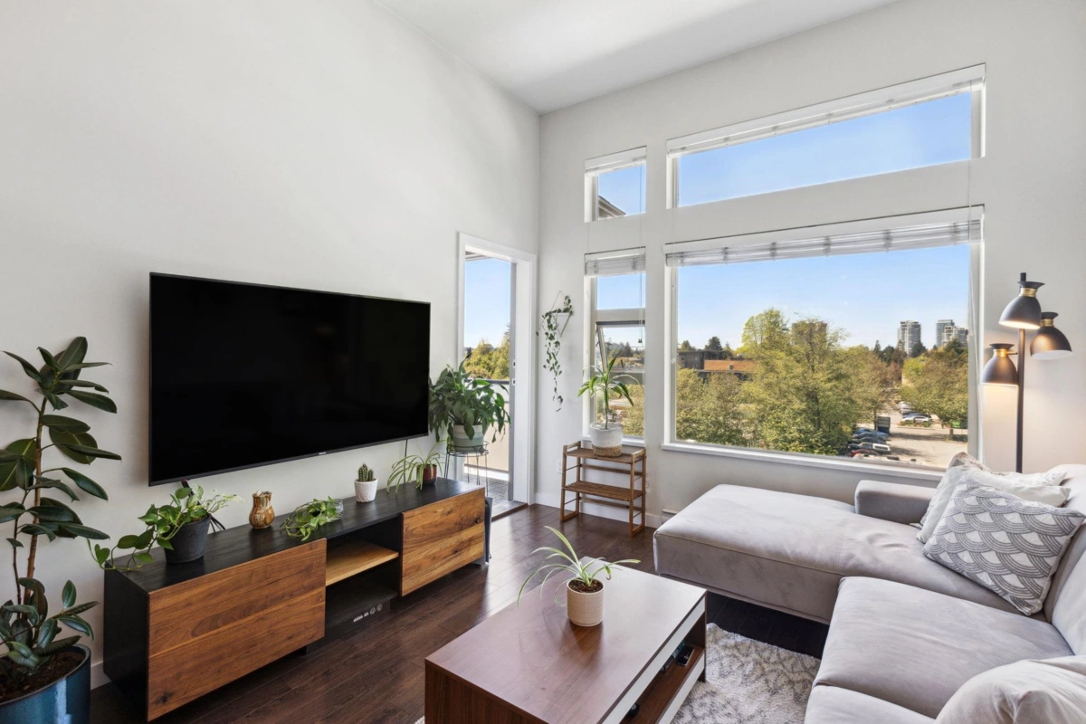This beautiful TOP floor HIGH CEILING one bed and a den is located in the District Crossing community by the reputable Qualex-Landmark. Designed with a modern West Coast style offering a luxurious loft-like feel and giving you a taste of the laid-back North Shore lifestyle. The apartment is bright and spacious with high ceilings. The kitchen has stainless steel appliances, white quartz countertops, and plenty of storage space. The living area has a cool white brick wall, big windows, and a balcony with views of the Lions Gate Bridge and downtown. The bedroom is roomy with a walk-in closet. It's conveniently located close to everything, just a short walk from the waterfront and a quick 10 min drive to downtown. OPEN HOUSE SUN (May 26) from 11-1pm