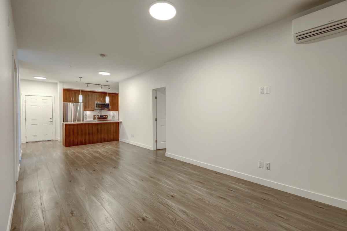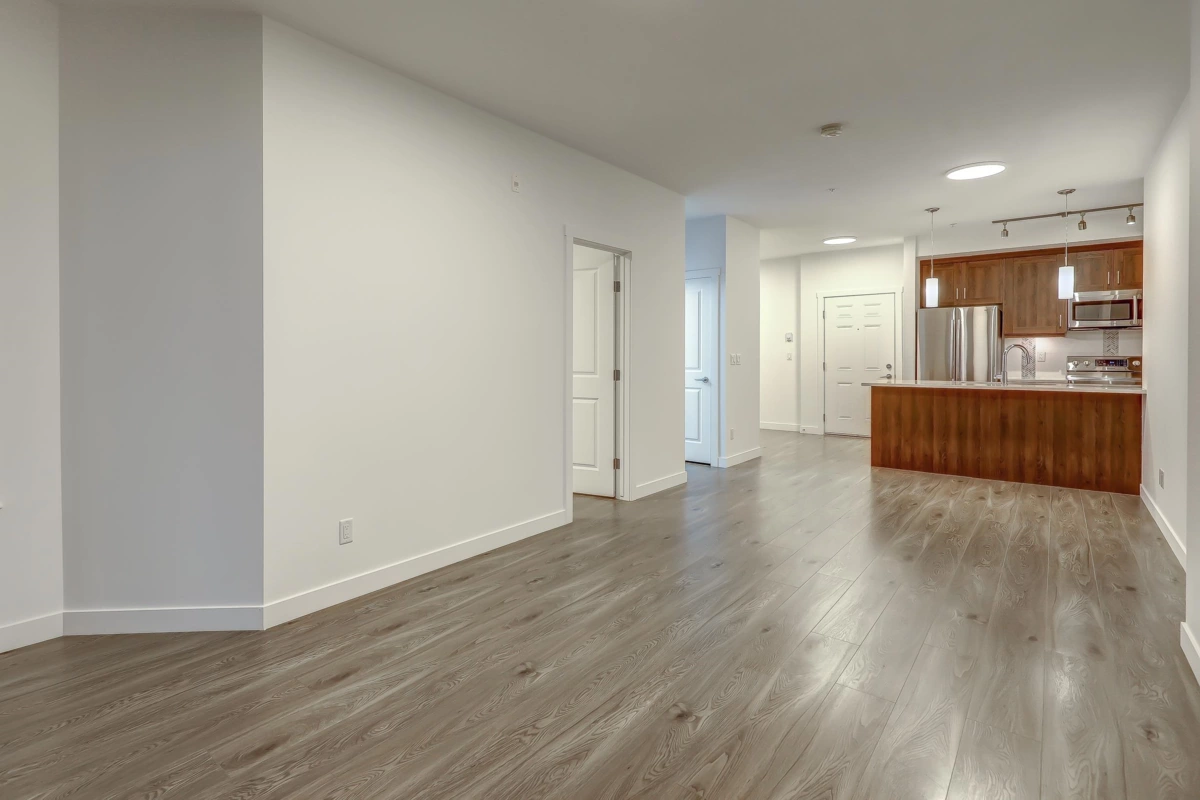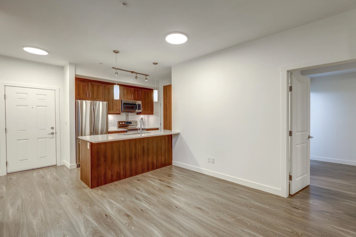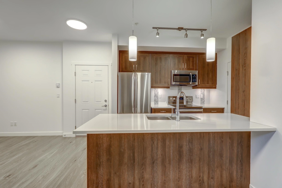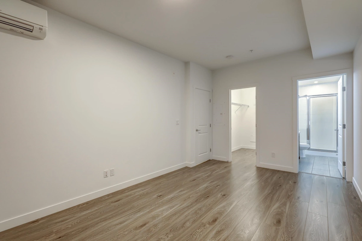 Welcome to Lattice2. This beautiful 2 Bed + Den is freshly painted and enhanced with new LED lighting making this home feel bright and modern. The open-concept floor plan is thoughtfully designed with oversized windows that frame stunning views and flood the space with natural light. The contemporary kitchen features quartz countertops, SS appliances, ample cabinetry, and an island ideal for both everyday living and entertaining. Enjoy the comfort of air conditioning, a rare and valuable feature, along with a spacious laundry room offering excellent storage and functionality. Step outside to a generous deck, perfect for relaxing or hosting while taking in the unobstructed surroundings. Enjoy rooftop amenities and a prime location close to schools, parks, shopping, and transit.